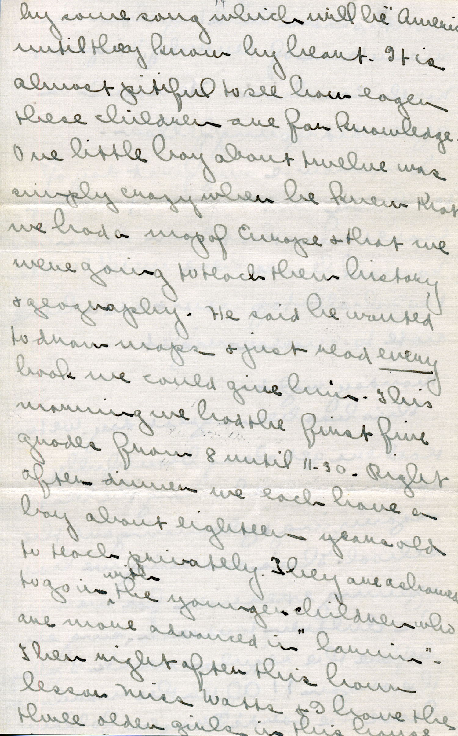 Did I tell you that I have the third and fourth grades, also arithmetic in the first. Now school is only in the mornings for we both give private tutor lessons for three hours each afternoon to the older ones. When Miss DeLong comes we hope to change for we need more regular school. The children simply love to come. You ought to see how eager they all are. There is hardly a child that knows what state or country he lives in. Not even the older ones knew there was such a thing as a war. And yet they are bright and will take in everything you tell them.