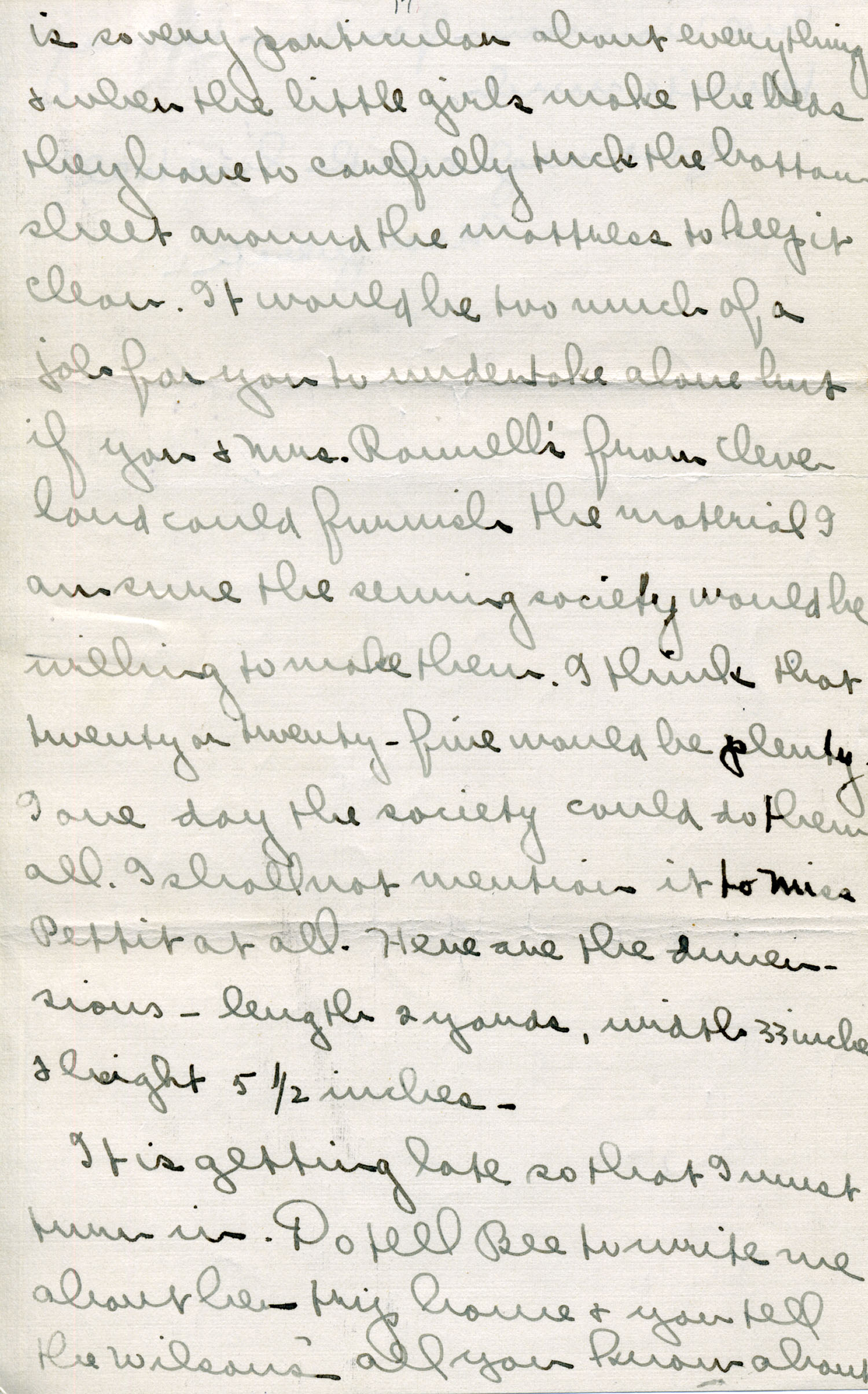 Now about the mattress covers. I can’t imagine anything that Miss Pettit would rather have. She is so very particular about everything and when the little girls make the beds they have to carefully tuck the bottom sheet around the mattress to keep it clean. It would be too much of a job for you to undertake alone but if you and Mrs. Rannells from Cleveland could furnish the material I am sure the sewing society would be willing to make them. I think that twenty or twenty-five would be plenty. In one day the society could do them all. I shall not mention it to Miss Pettit at all. Here are the dimensions – length 2 yards, width 33 inches, height 5 1/2 inches.