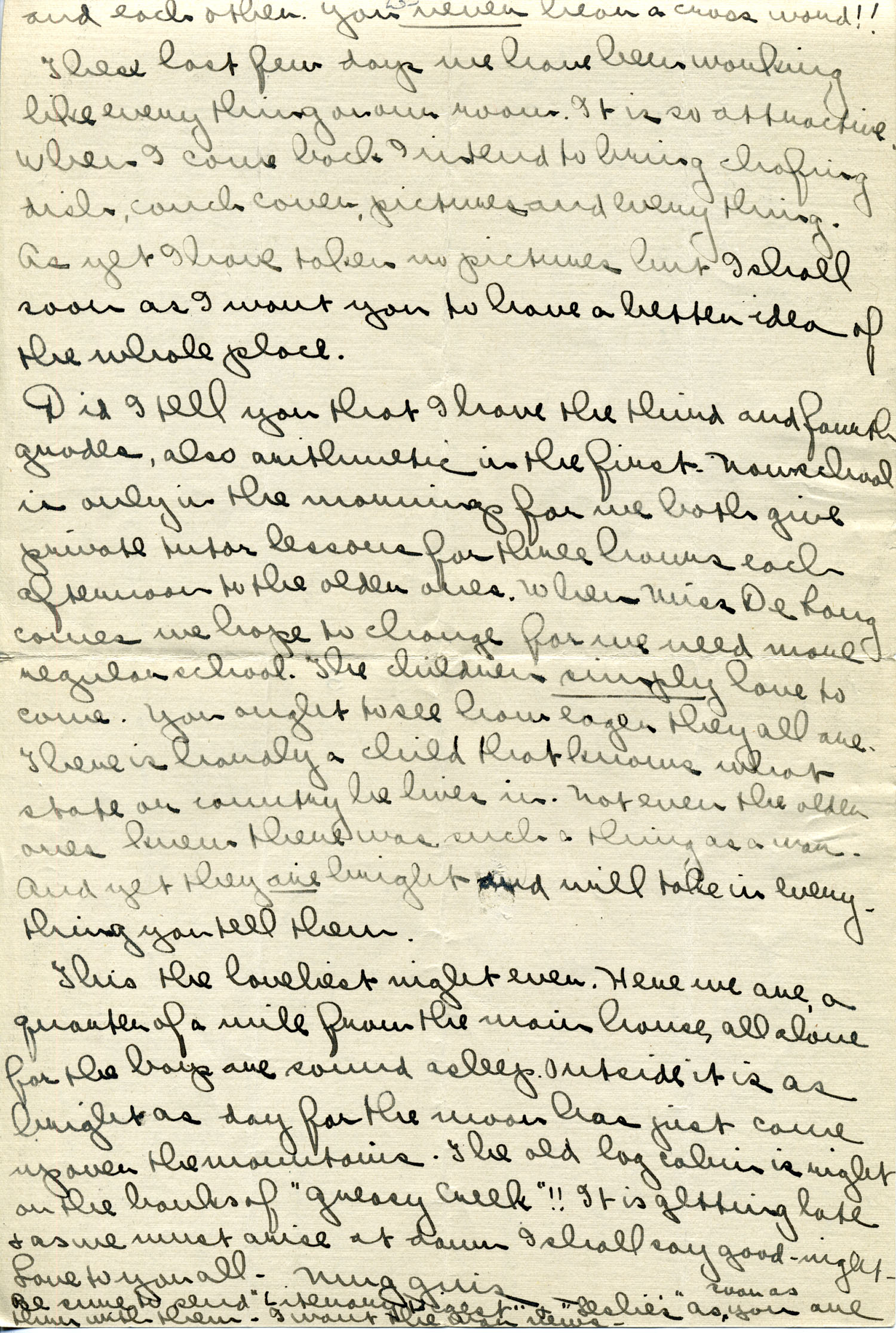 Dear Jeanette – Oh, I just wish you could be here right now! “Peggy” – Miss Watts name has been changed – and I are in the Old Log cabin taking care of Miss Newman’s boys for she has gone off in the mountains to spend the night. The boys are the most adorable youngsters you ever saw in your life. Their spirit is perfectly beautiful. Right after supper we two and about eight of the boys had a game of baseball. They think it is wonderful fun when we play with them. As soon as it got dark we all played “Up Jenkins” in the living room. It is just like one big family. Then it was time for the boys to run and get ready for bed. Every other night is bath night when they heat the water in a big black kettle out in the open but tonight the boys just had to scrub their hands, neck, faces and feet. Soon they all came down in their little white nighties just clean as clean as could. We heard them with their prayers, kissed them good-night and off they went. I never saw such children in my life. They are very, very polite, obedient as can be, and simply in love with the school, [head?] ones and each other. You never hear a cross word!!