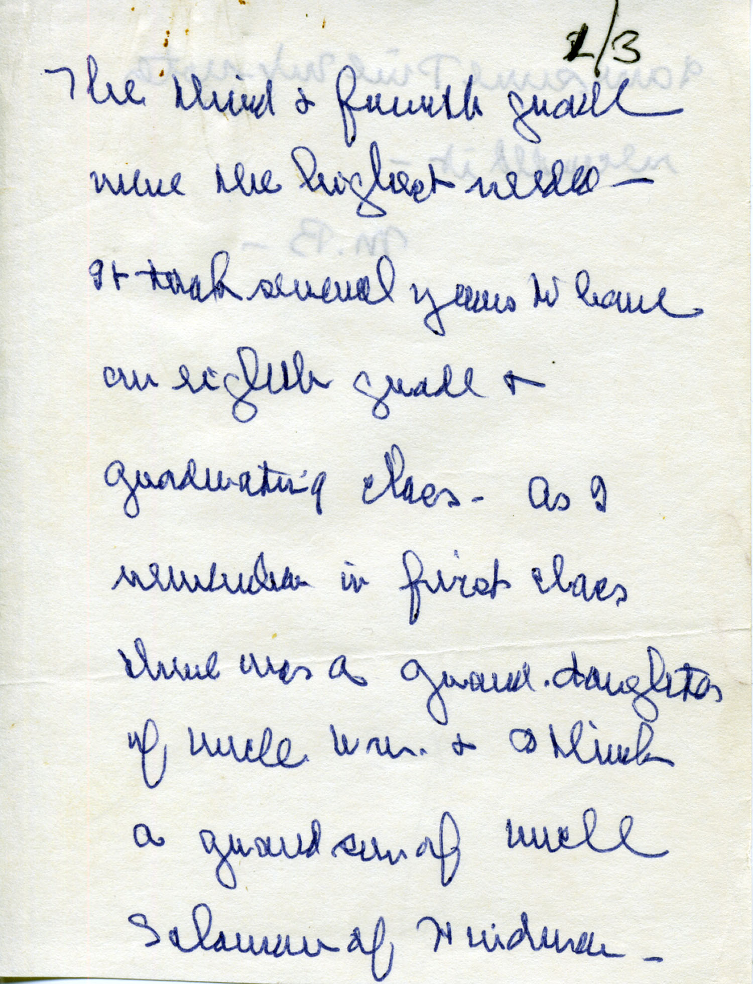 MBB Note -“The third and fourth grades were the highest needed — it took several years to have an eighth grade and graduating class. As I remember in first class there was a granddaughter of Uncle William and I think a grandson of Uncle Solomon of Hindman [This would have been A. Ritchie, and a student who was killed in the School House fire? HW]. I am sure Pine Mountain notes recorded it.” [images 025 & 026]
