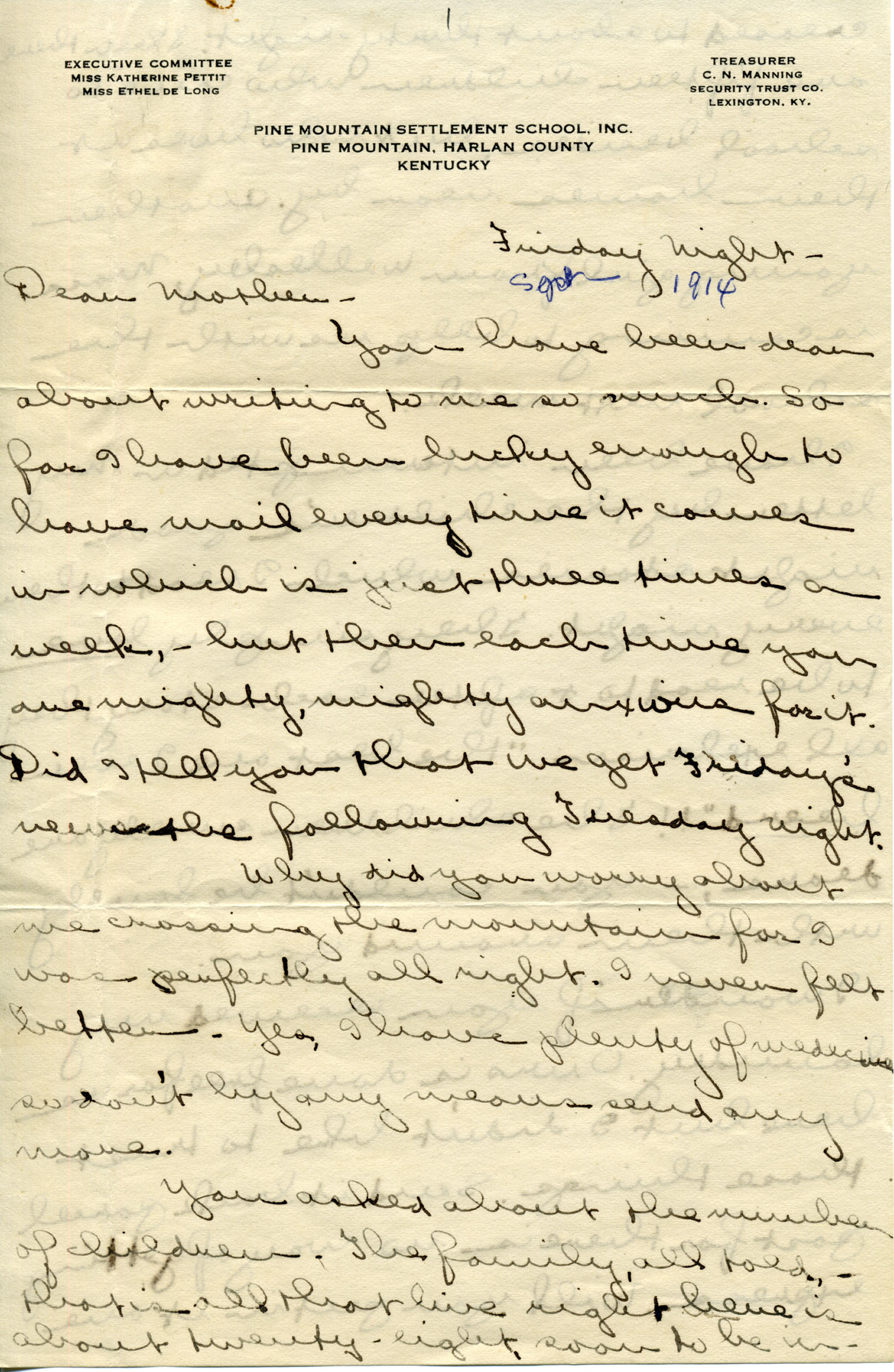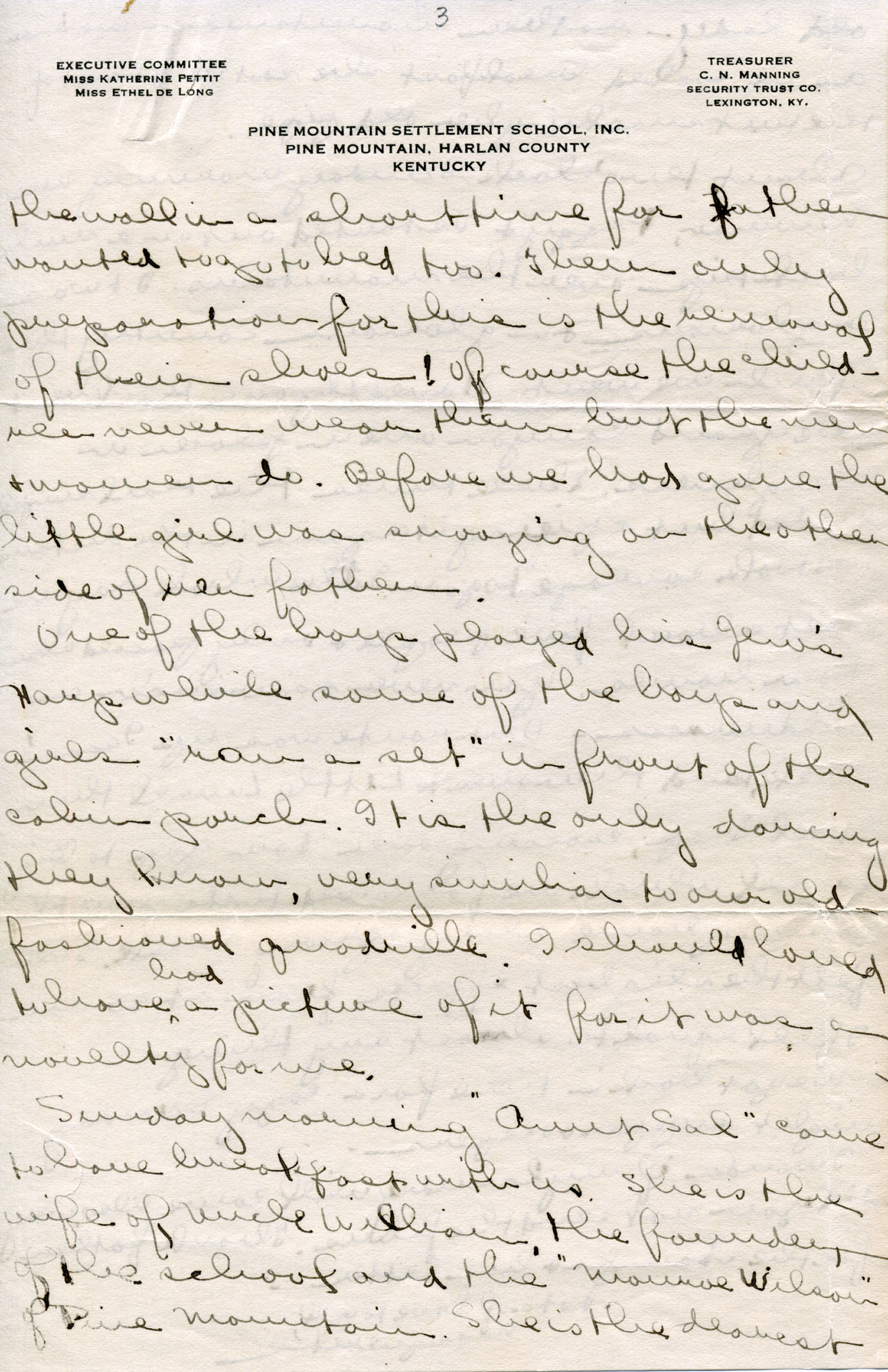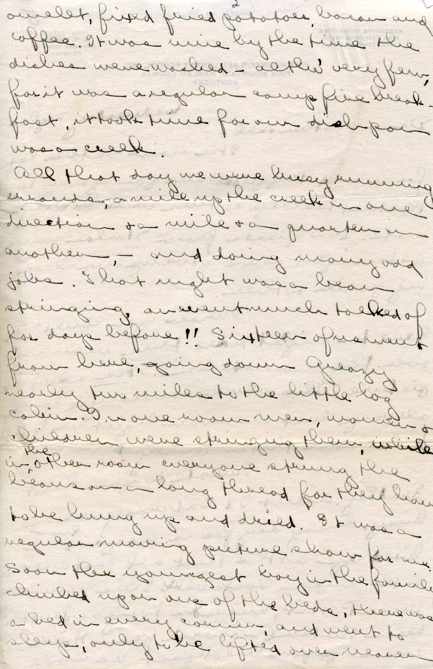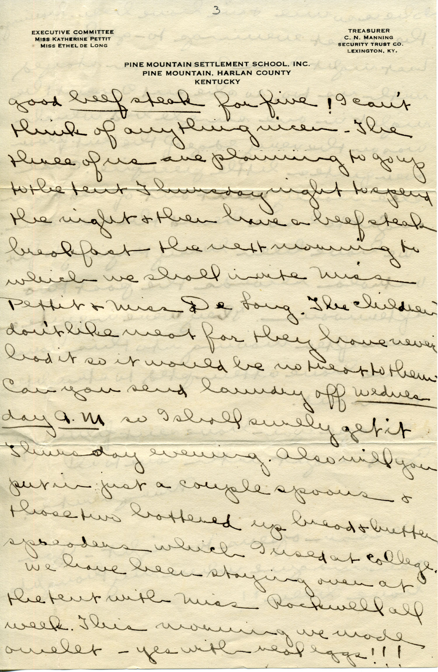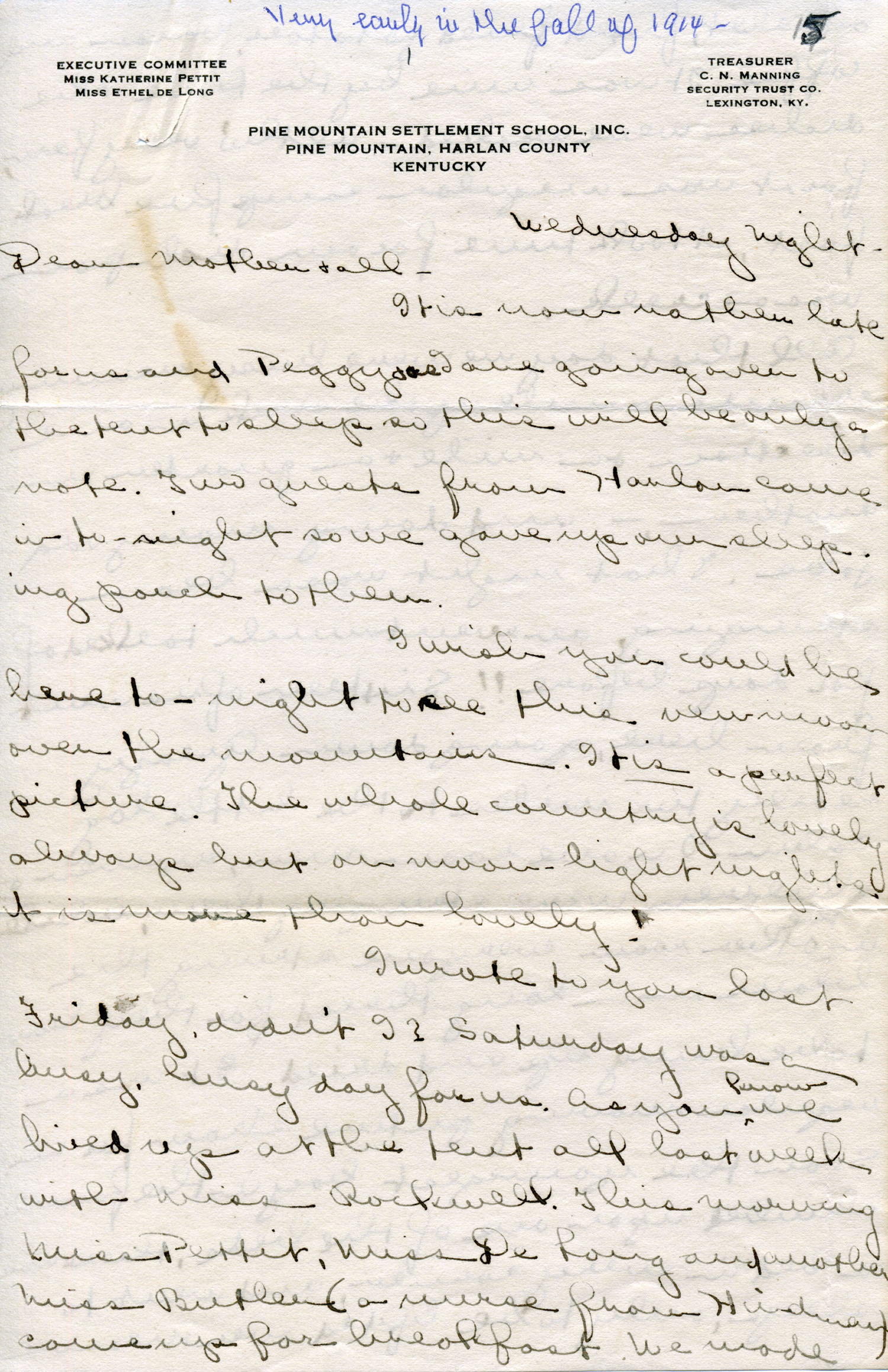 I wrote to you last Friday, didn’t I? Saturday was a busy, busy day for us. As you know, we lived up at the tent all last week with Miss Rockwell [Mary Rockwell Hook]. This morning Miss Pettit, Miss de Long and another Miss Butler [Harriet Butler] (a nurse from Hindman) came up for breakfast. We made omelet, fixed fried potatoes, bacon and coffee. It was nine by the time the dishes were washed – altho’ very few, for it was a regular campfire breakfast, and it took time for our dishpan was a creek.