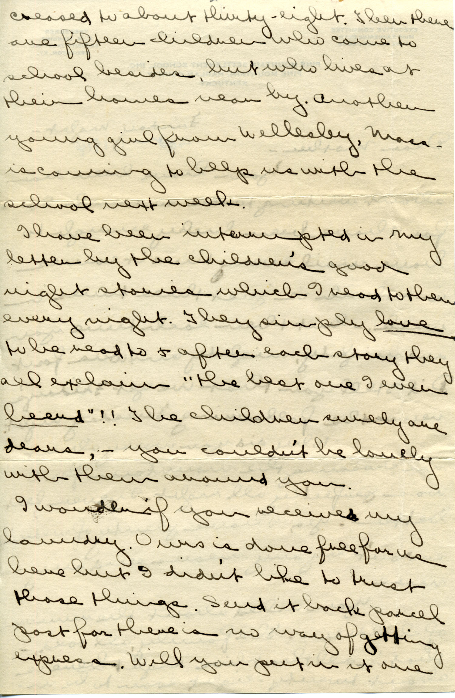 You asked about the number of children. The family, all told, that is all that live right here is about twenty-eight, soon to be increased to about thirty-eight. Then there are fifteen children who come to school besides, but who live at their homes nearby. Another young girl from Wellesley, Mass, is coming to help us with the school next