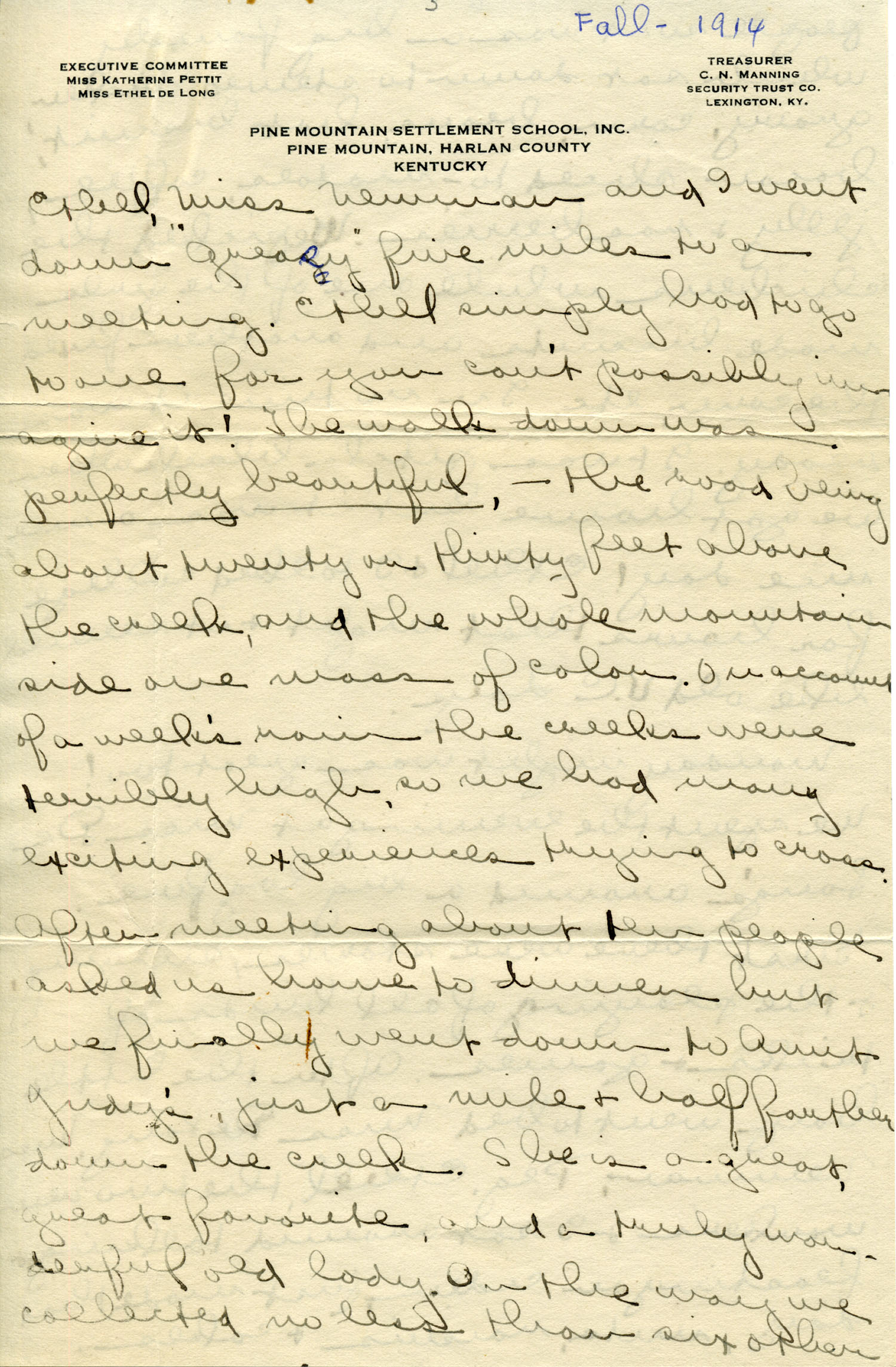 Ethel [McCullough], Miss Newman and I went down “Greasy” five miles to a meeting. Ethel simply had to go to one for you can’t possibly imagine it! The walk down was perfectly beautiful, the road being about twenty or thirty feet above the creek, and the whole mountainside one mass of color. On account of a week’s rain the creeks were terribly high, so we had many exciting experiences trying to cross.