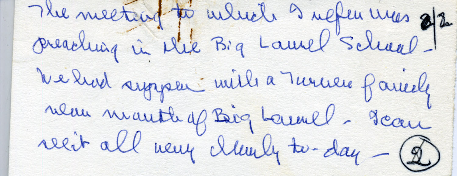 [MBB Note: The meeting to which I refer was preaching in the Big Laurel School. We had supper with a Turner family near mouth of Big Laurel. I can see it all very clearly today. [image 039]