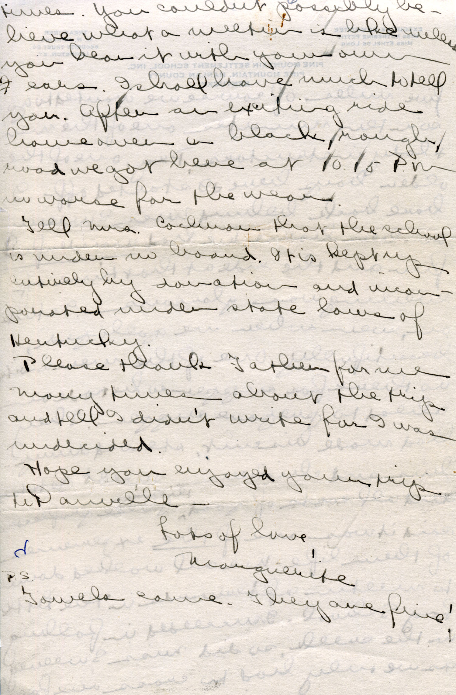 It is getting late so that I must turn in. Do tell Bee to write me about the trip home and you tell the Wilsons all you know about Pine Mountain for I am too busy to write much.