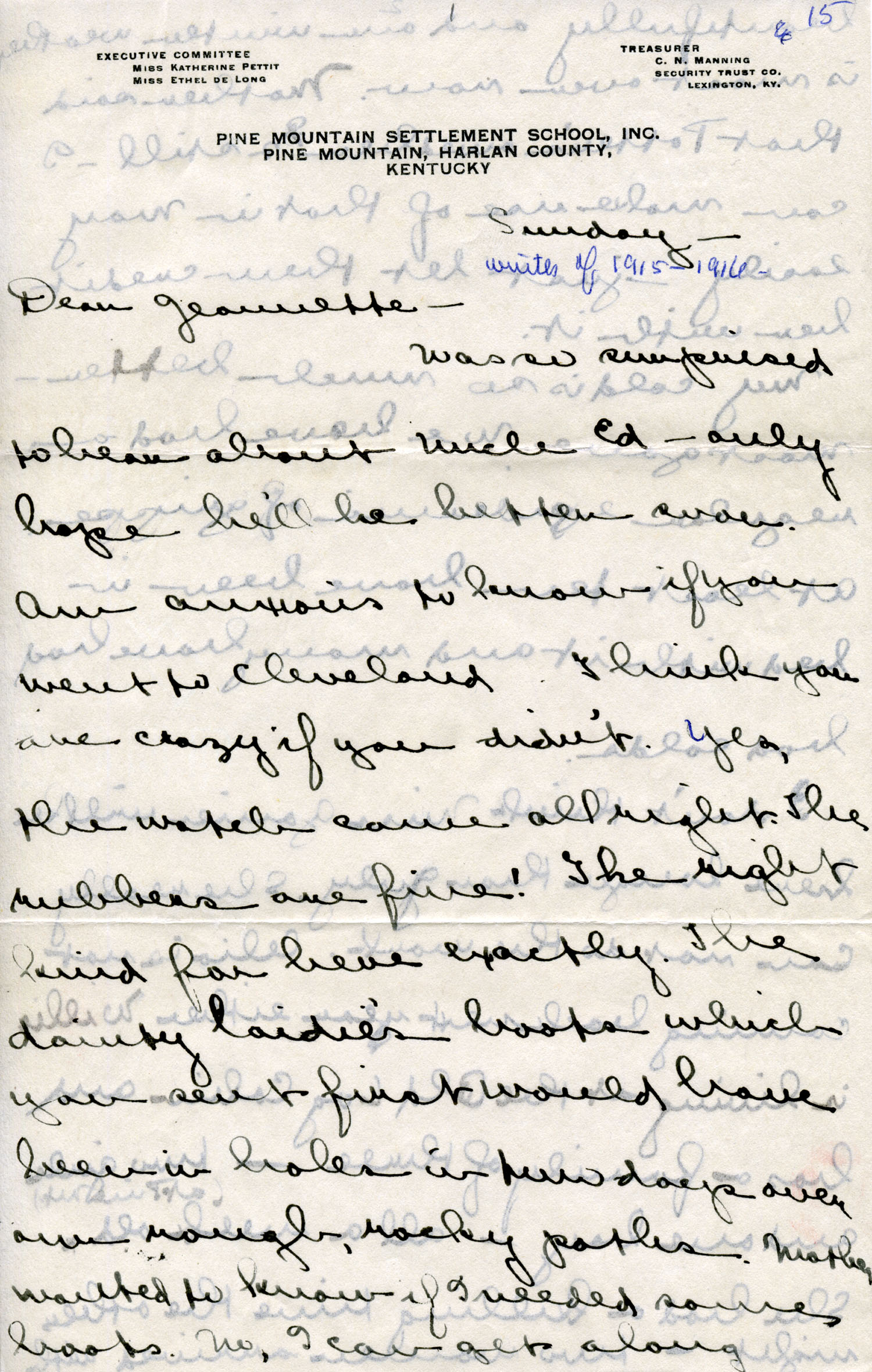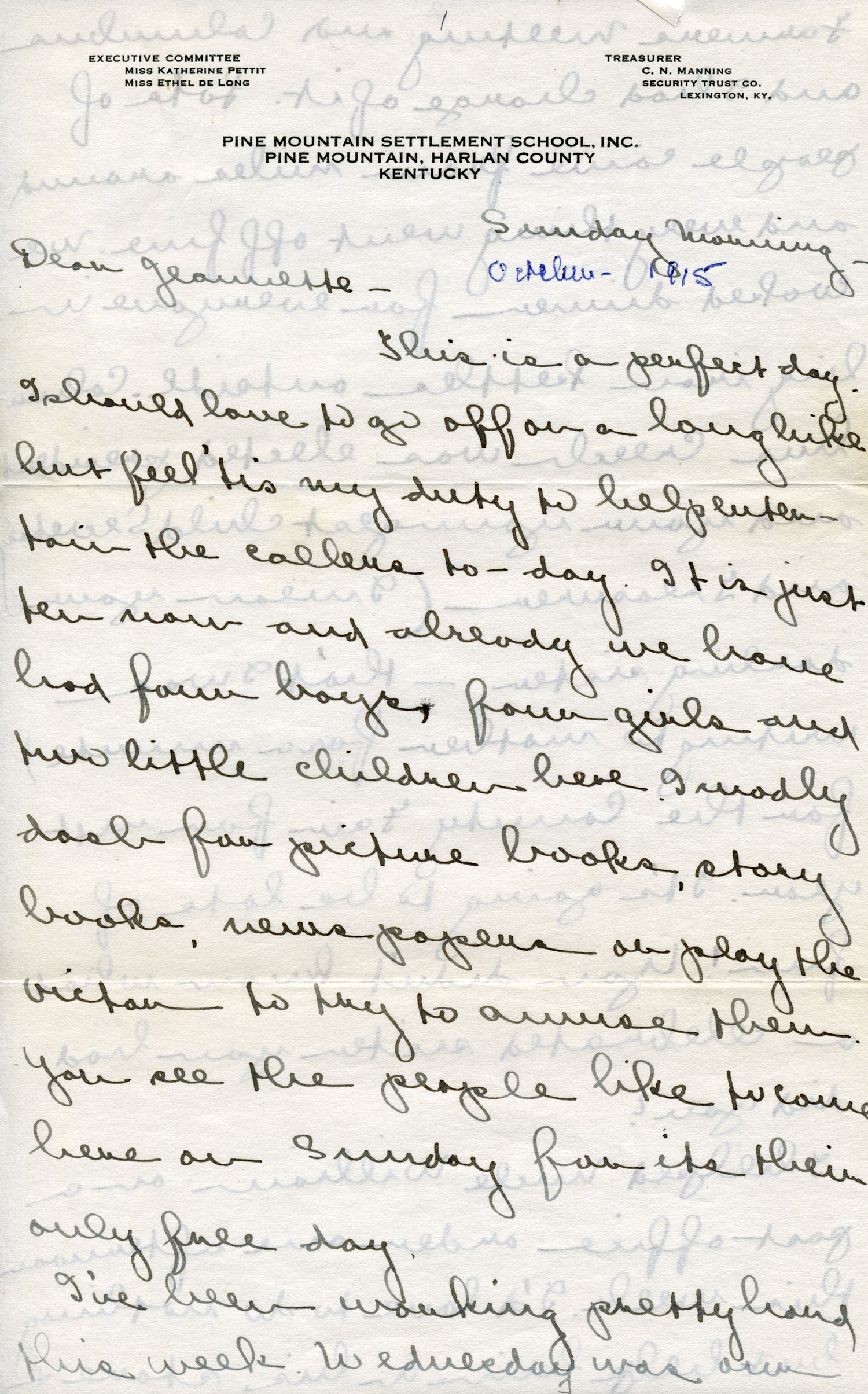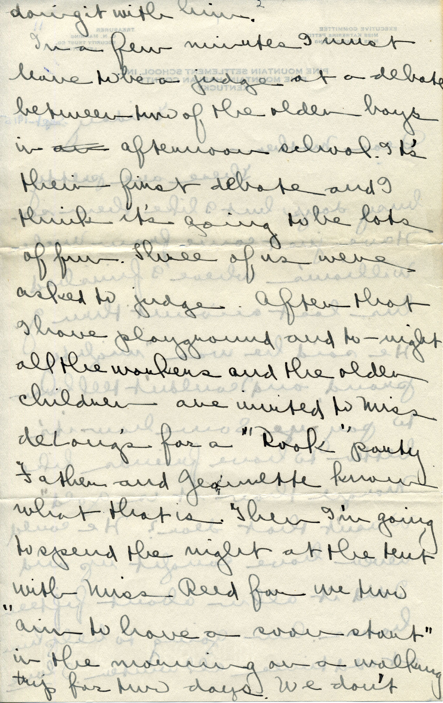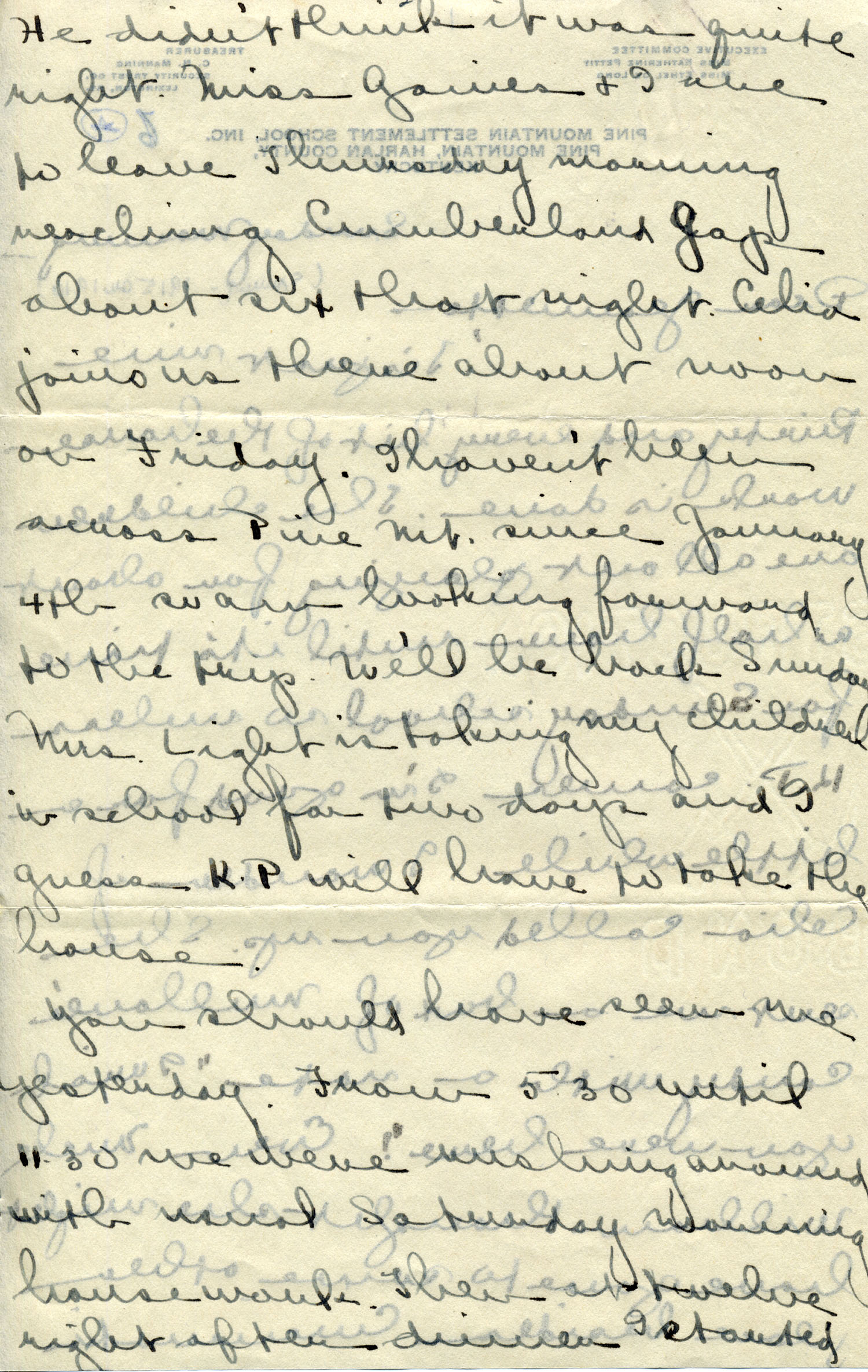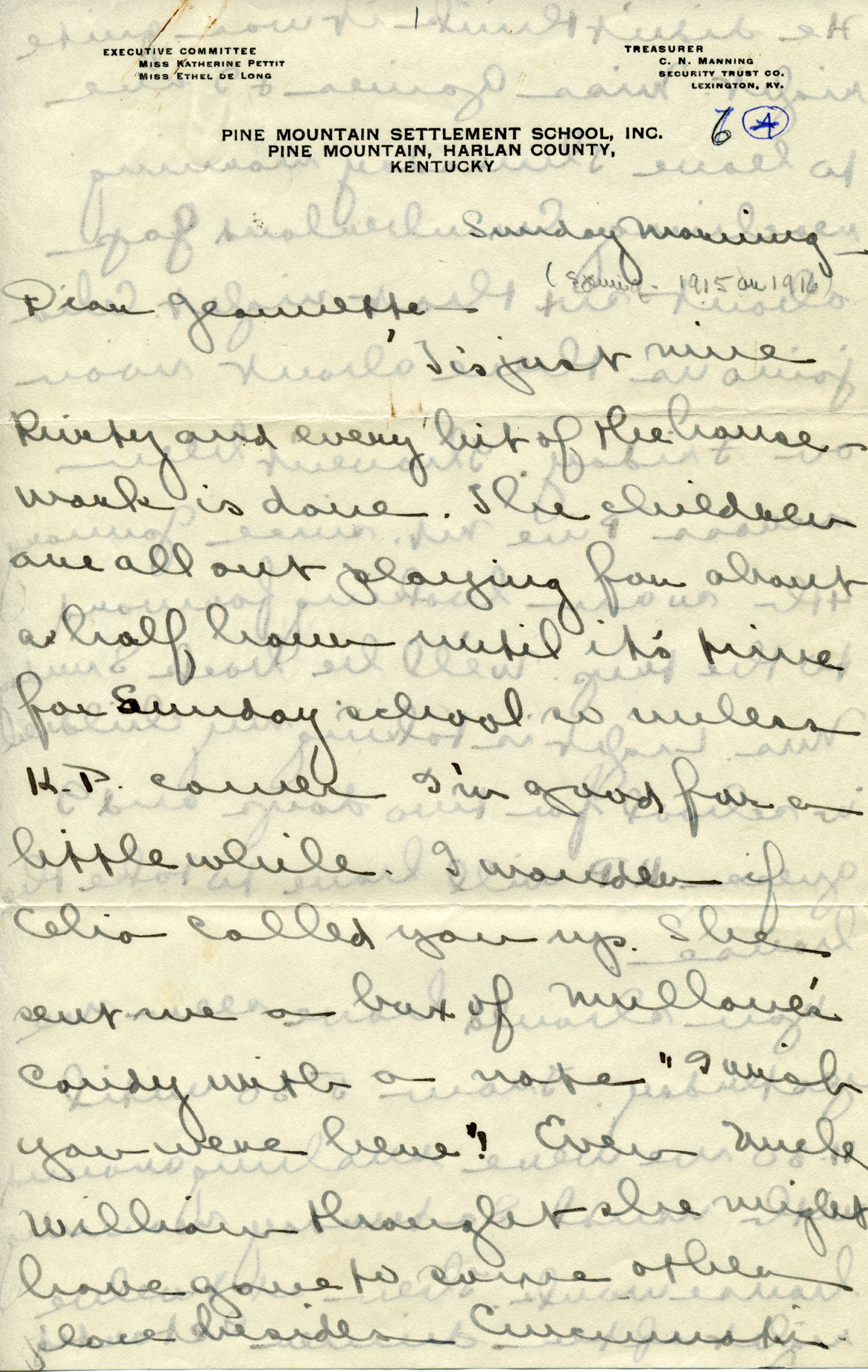 Dear Jeannette — It is just nine thirty and every bit of the housework is done. The children are all out playing for about a half hour until it’s time for Sunday School, so unless K. P. [Katherine Pettit] comes I’m good for a little while. I wonder if Celia called you up. She sent me a box of Mullove’s candy with a note “I wish you were here!” Even Uncle William thought she might have gone to some other place besides Cincinnati. He didn’t think it was quite right. Miss Gaines and I are to leave Thursday morning, reaching Cumberland Gap about six that night. Celia joins us there about noon on Friday. I haven’t been across Pine Mt. since January 4th so am looking forward to the trip. We’ll be back Sunday. Mrs. Light [Mrs. Ella Sue Light, housemother] is taking my children in school for two days and I guess K. P. will have to take the house.