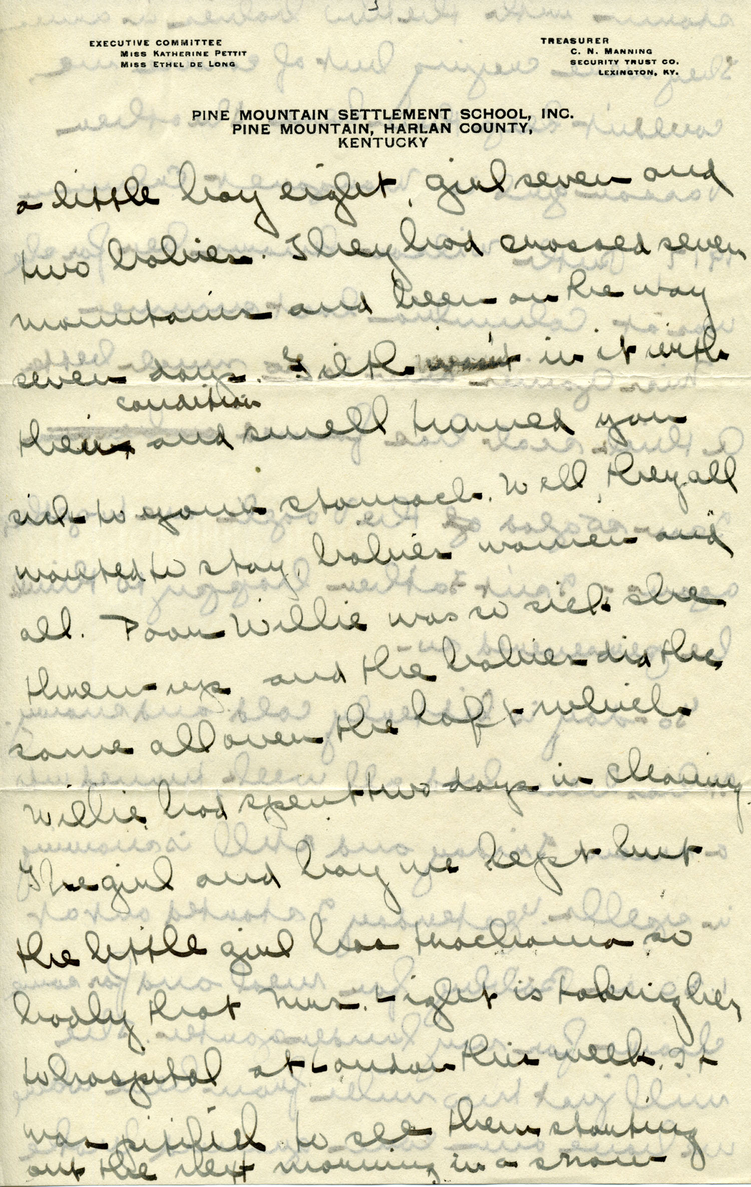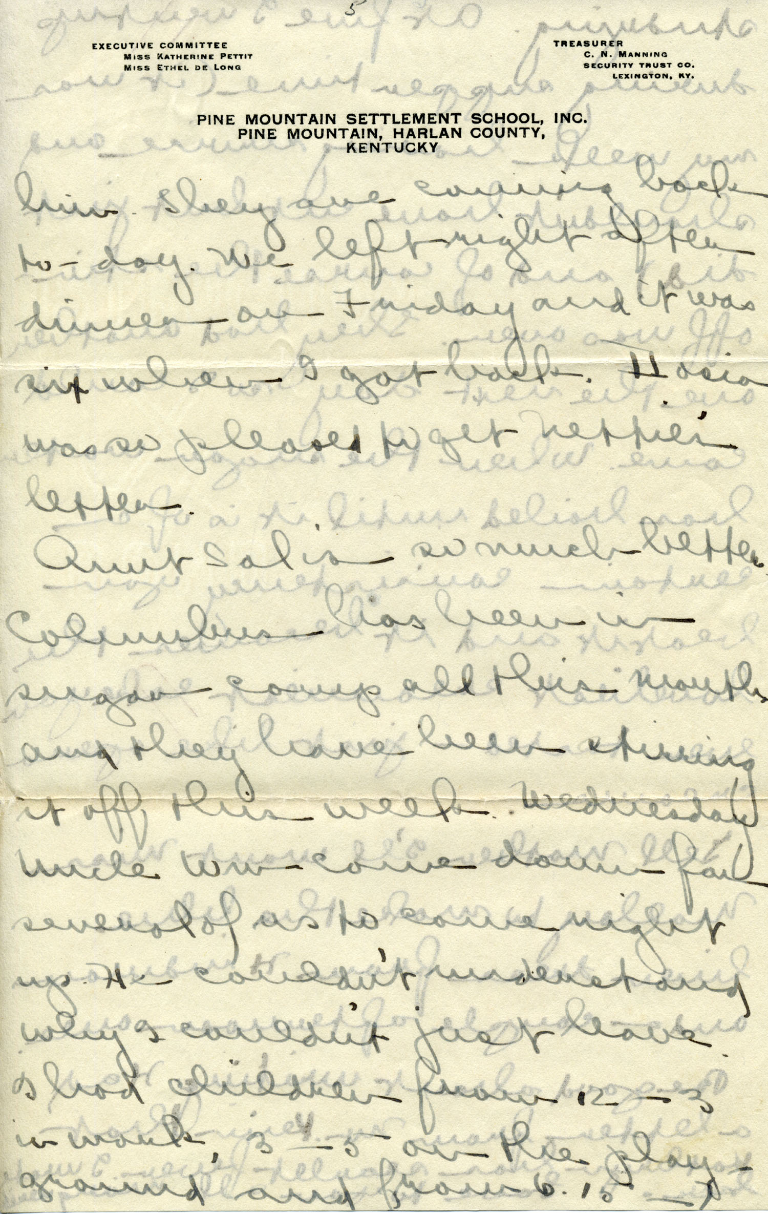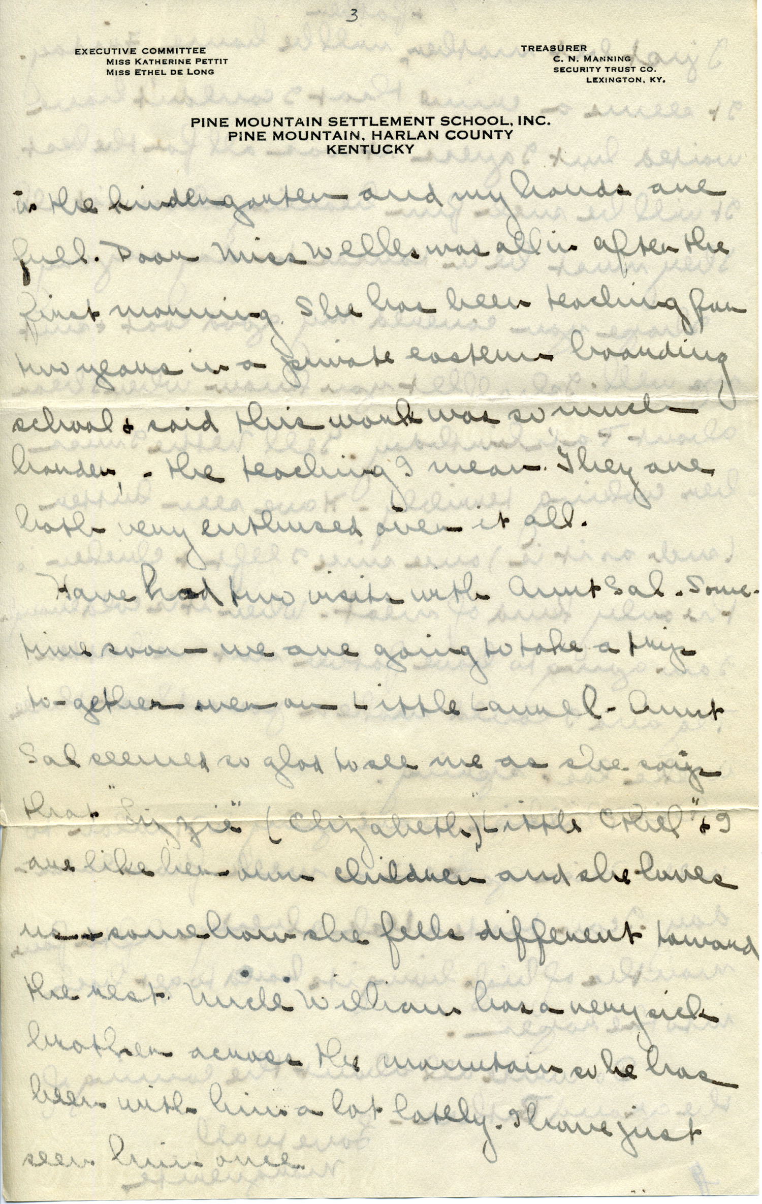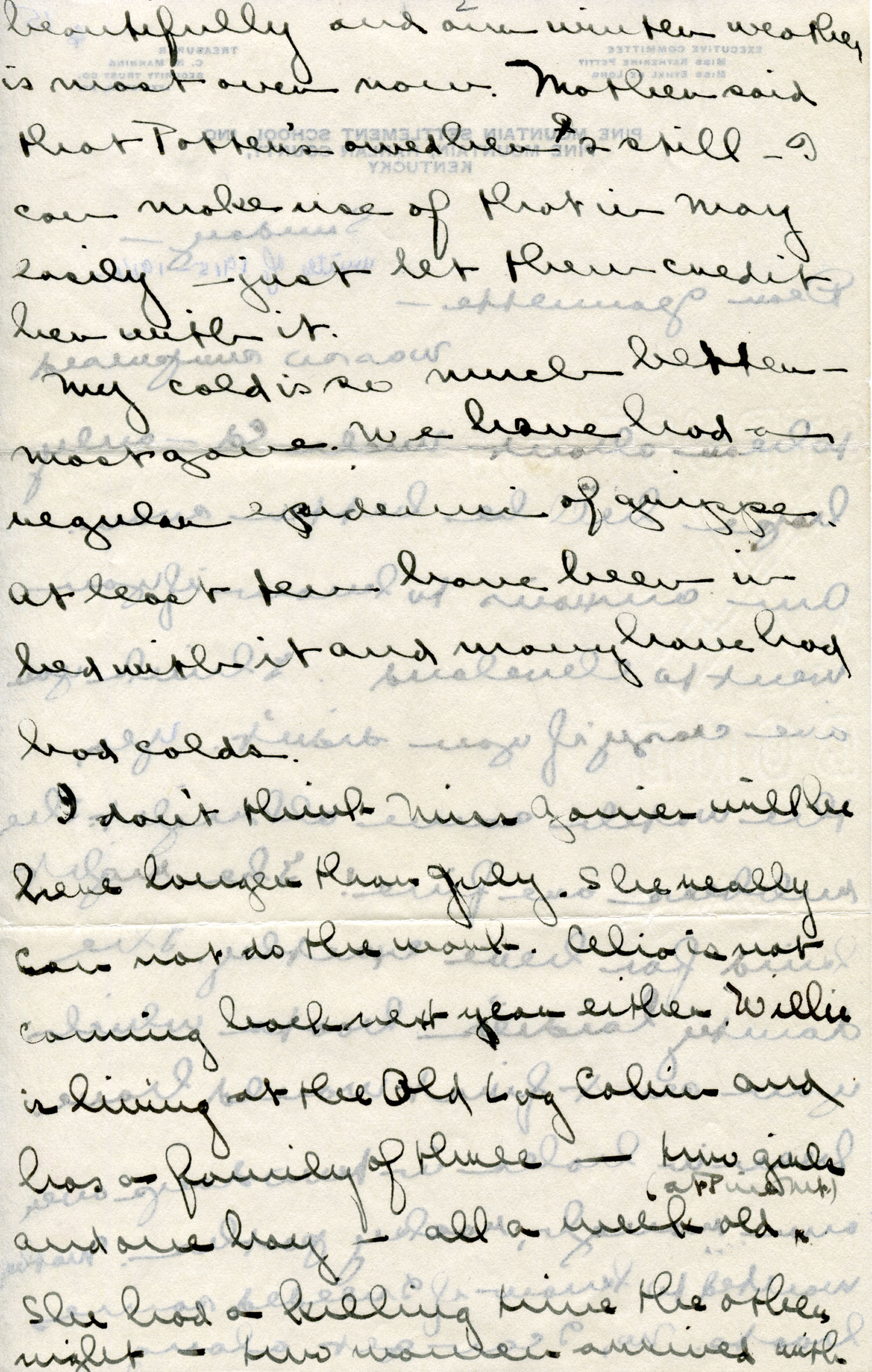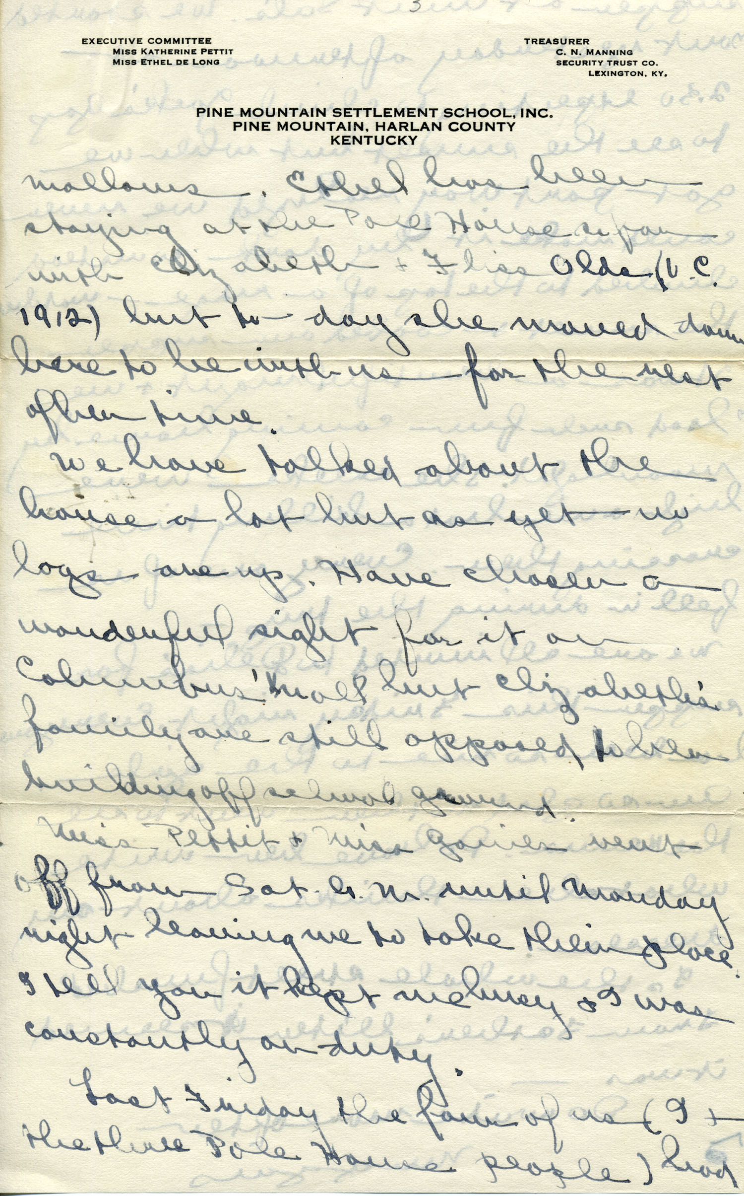 Dear Jeannette — It is just nine thirty and every bit of the housework is done. The children are all out playing for about a half hour until it’s time for Sunday School, so unless K. P. [Katherine Pettit] comes I’m good for a little while. I wonder if Celia called you up. She sent me a box of Mullove’s candy with a note “I wish you were here!” Even Uncle William thought she might have gone to some other place besides Cincinnati. He didn’t think it was quite right. Miss Gaines and I are to leave Thursday morning, reaching Cumberland Gap about six that night. Celia joins us there about noon on Friday. I haven’t been across Pine Mt. since January 4th so am looking forward to the trip. We’ll be back Sunday. Mrs. Light [Mrs. Ella Sue Light, housemother] is taking my children in school for two days and I guess K. P. will have to take the house.