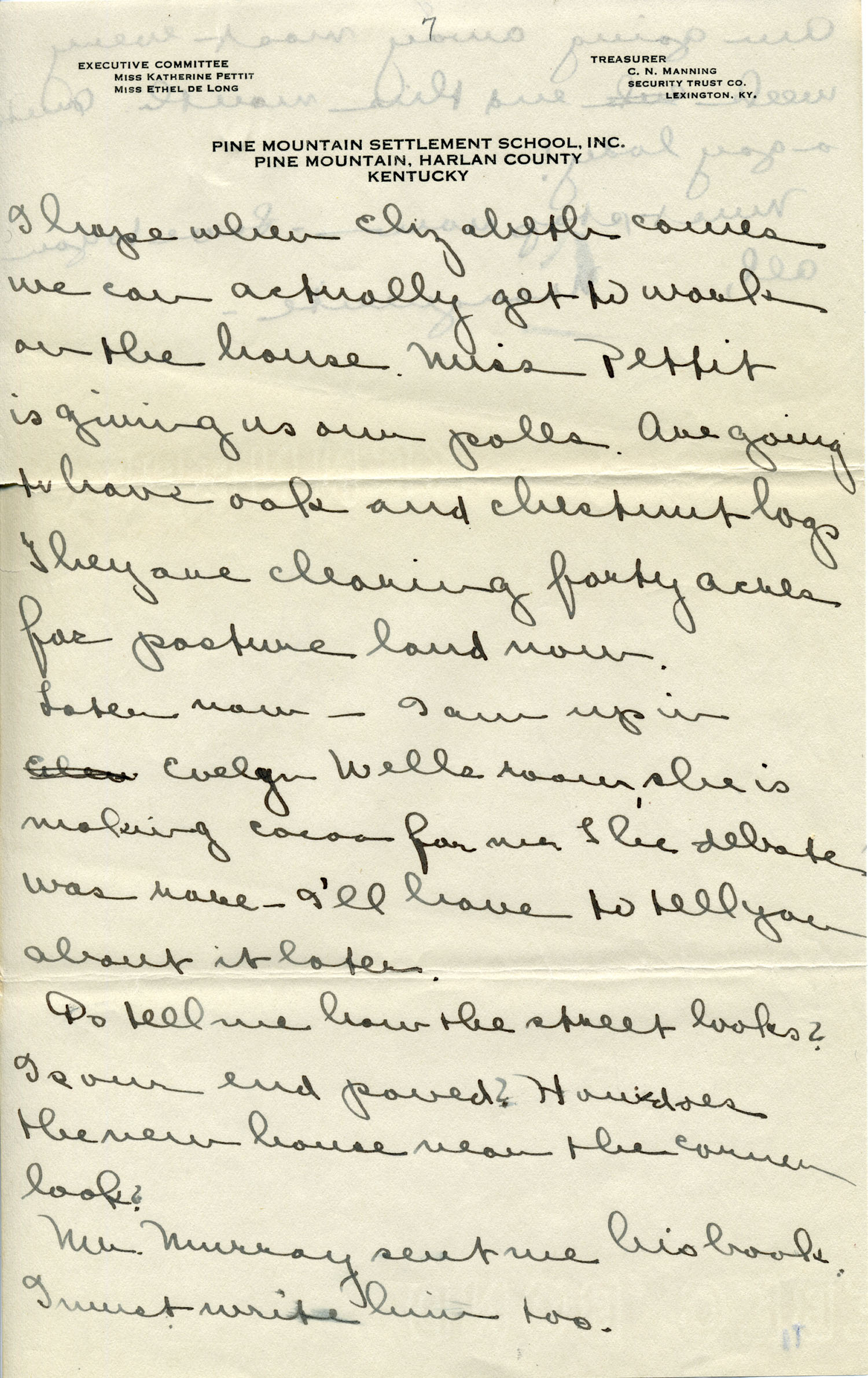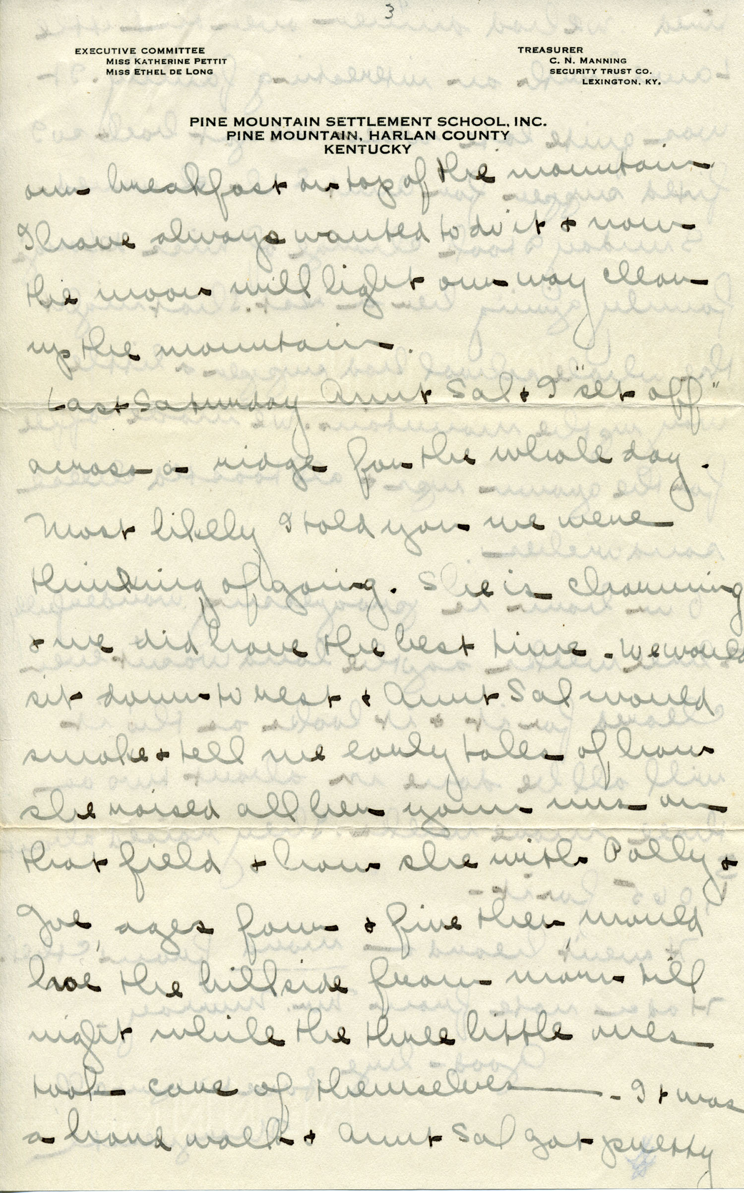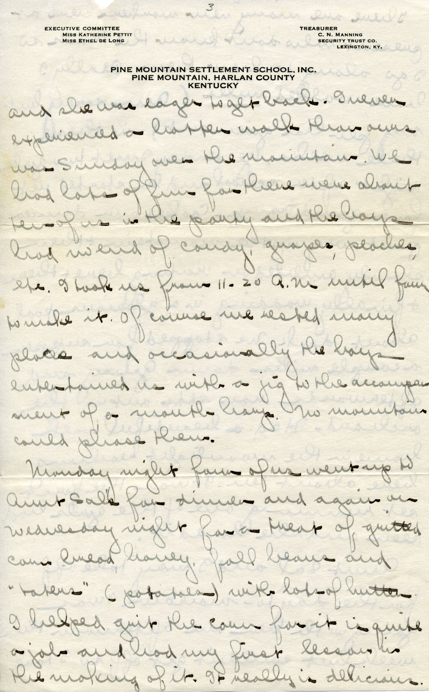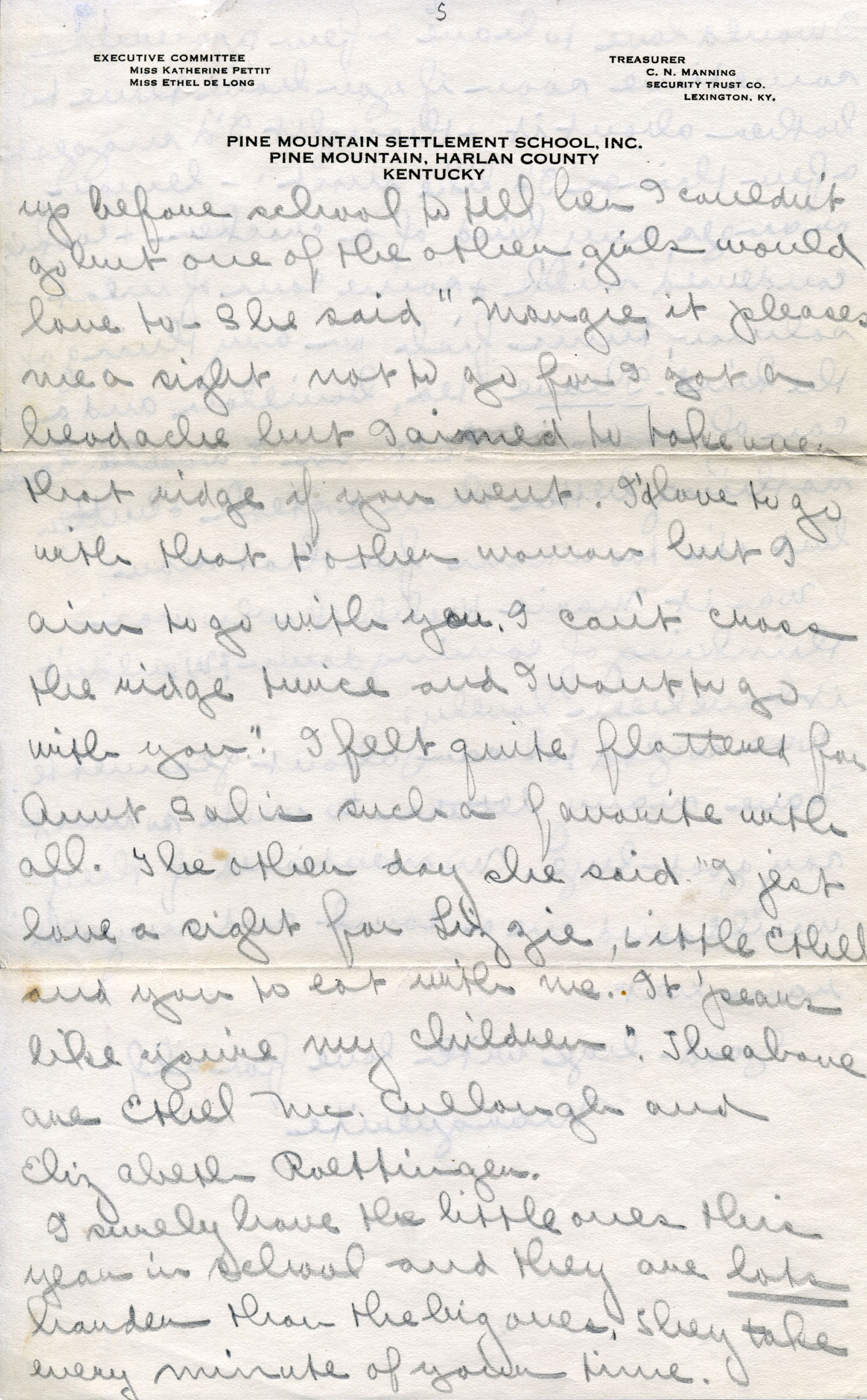 Dear Jeannette — It is just nine thirty and every bit of the housework is done. The children are all out playing for about a half hour until it’s time for Sunday School, so unless K. P. [Katherine Pettit] comes I’m good for a little while. I wonder if Celia called you up. She sent me a box of Mullove’s candy with a note “I wish you were here!” Even Uncle William thought she might have gone to some other place besides Cincinnati. He didn’t think it was quite right. Miss Gaines and I are to leave Thursday morning, reaching Cumberland Gap about six that night. Celia joins us there about noon on Friday. I haven’t been across Pine Mt. since January 4th so am looking forward to the trip. We’ll be back Sunday. Mrs. Light [Mrs. Ella Sue Light, housemother] is taking my children in school for two days and I guess K. P. will have to take the house.