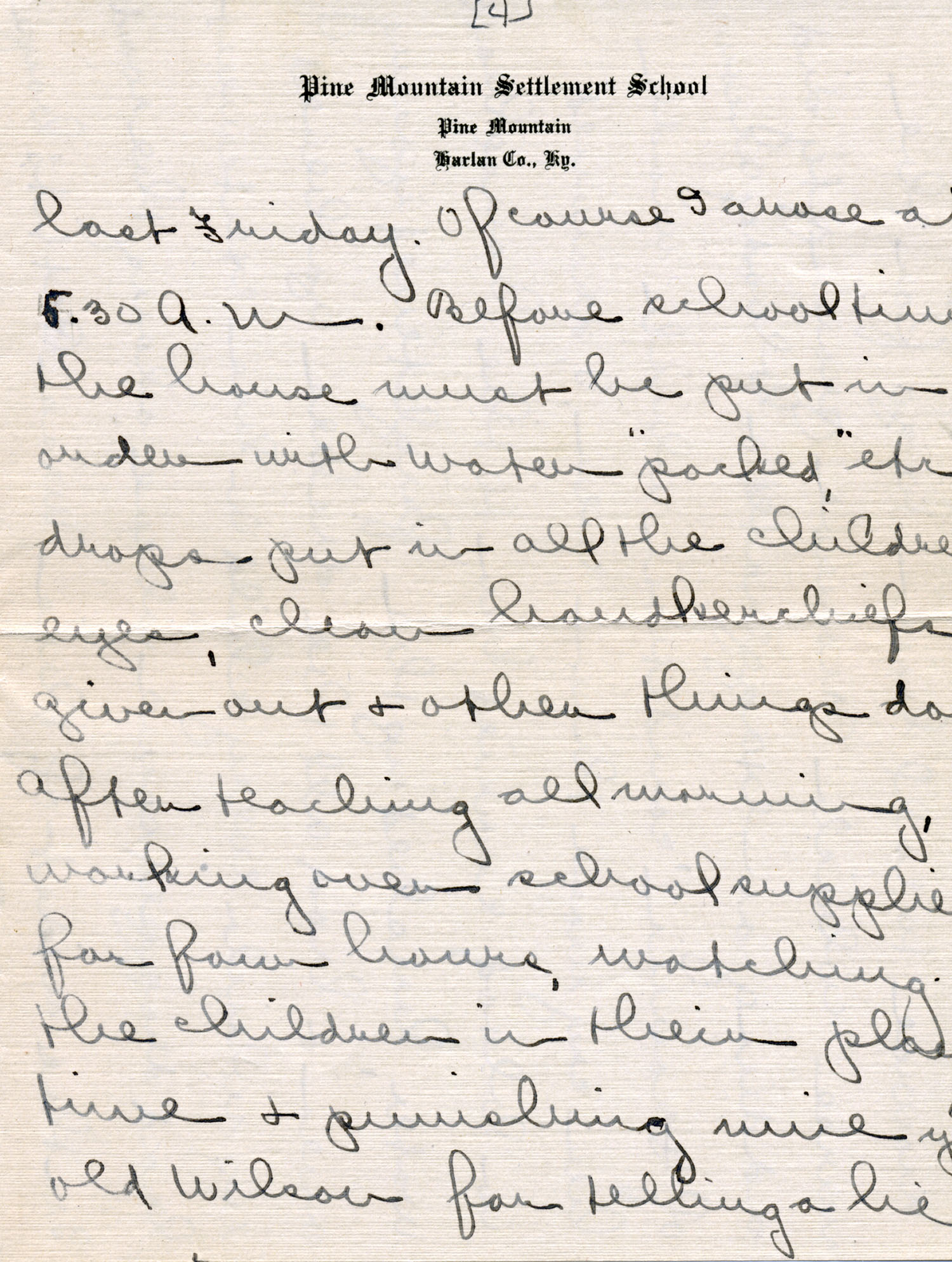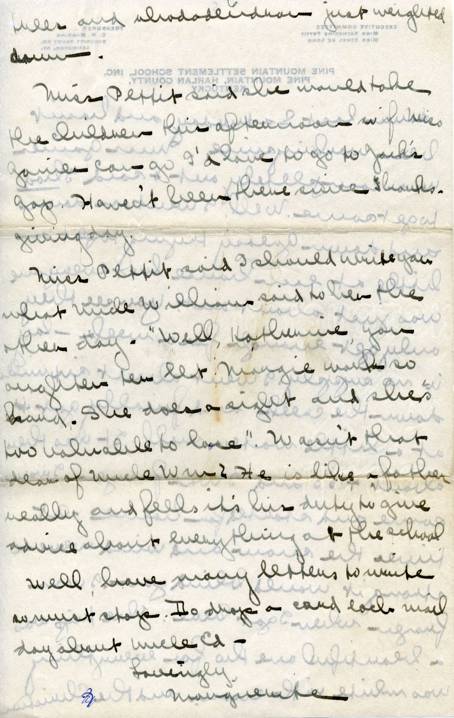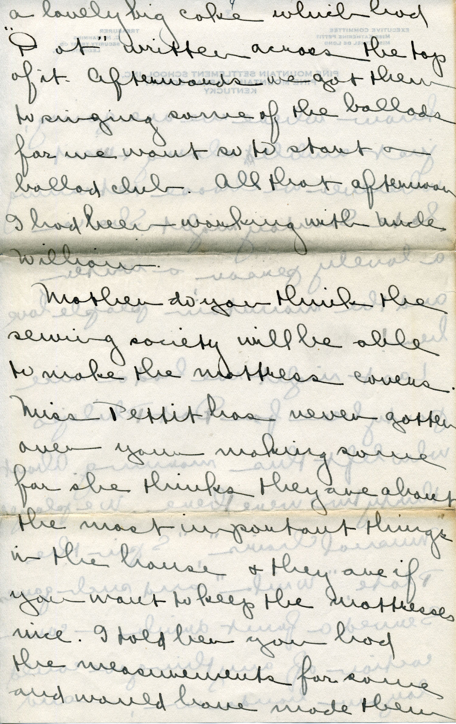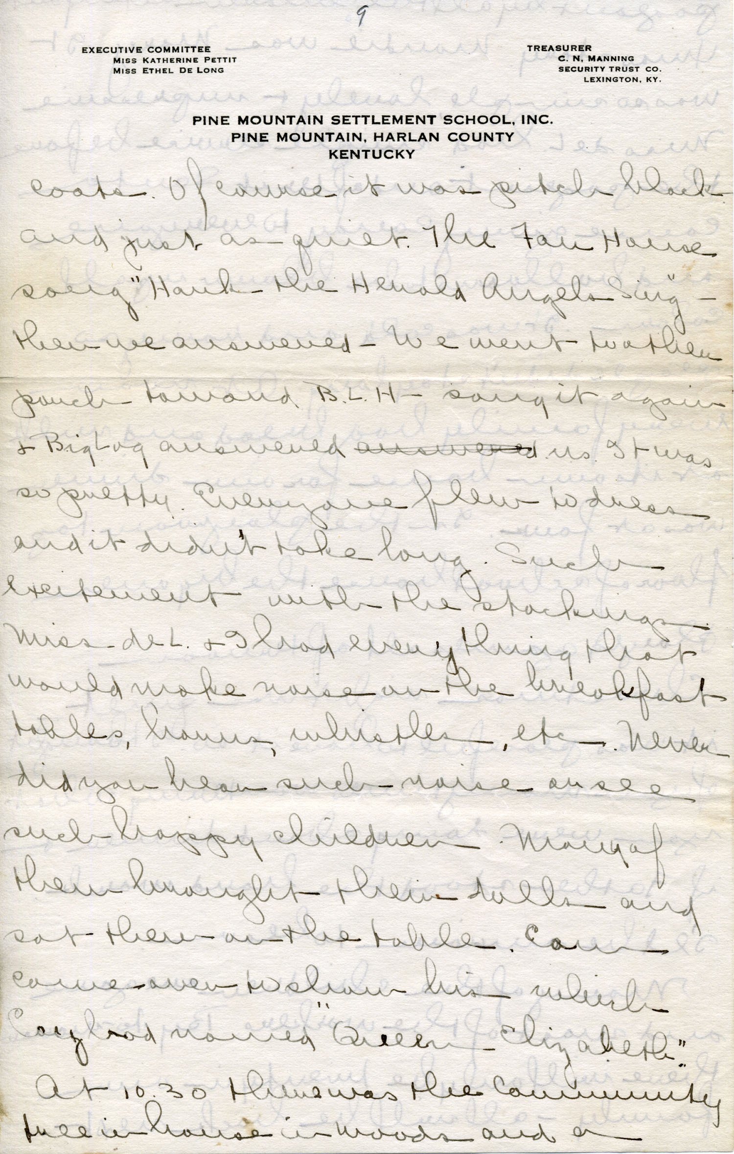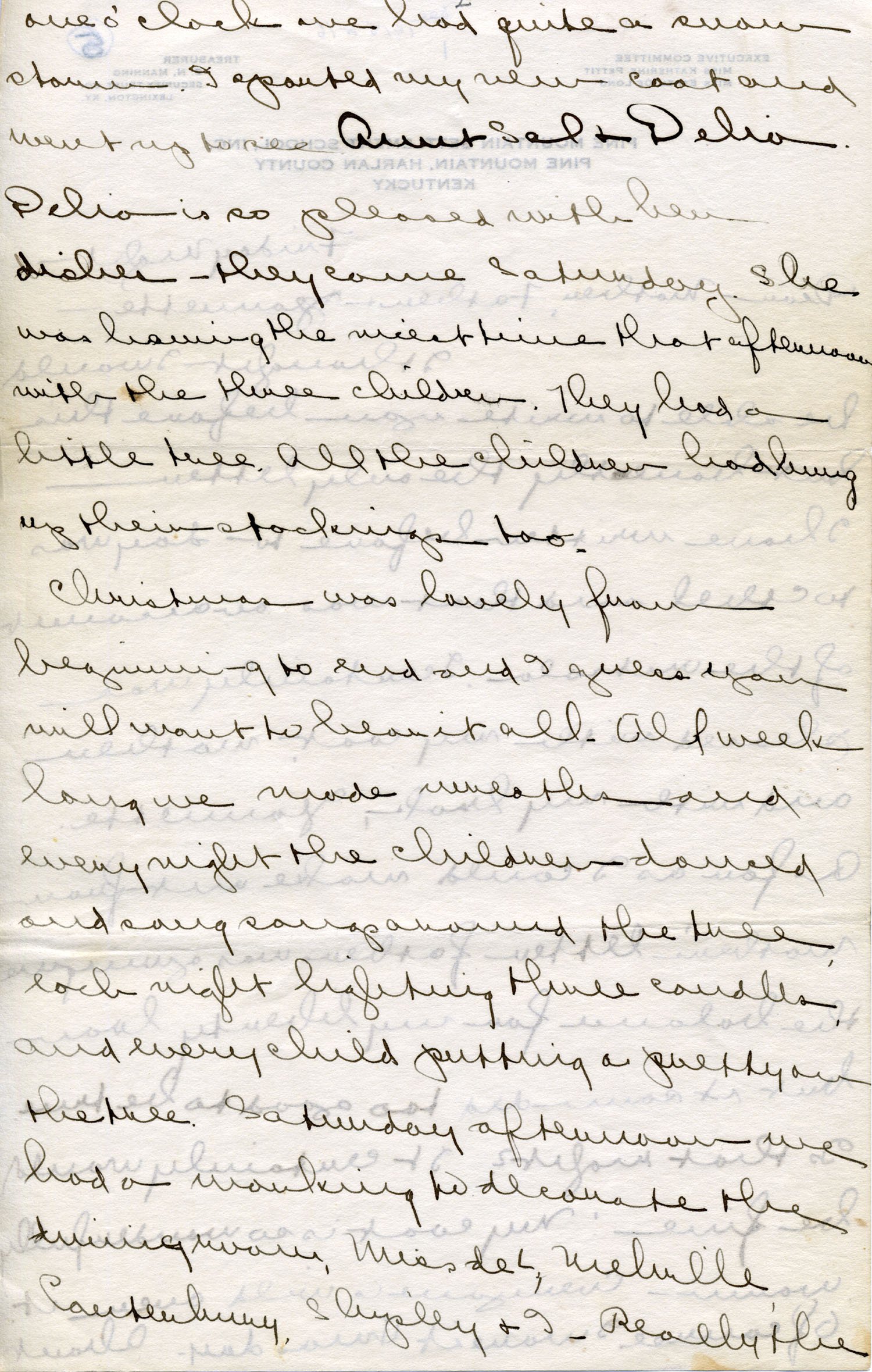 Dear Jeannette — It is just nine thirty and every bit of the housework is done. The children are all out playing for about a half hour until it’s time for Sunday School, so unless K. P. [Katherine Pettit] comes I’m good for a little while. I wonder if Celia called you up. She sent me a box of Mullove’s candy with a note “I wish you were here!” Even Uncle William thought she might have gone to some other place besides Cincinnati. He didn’t think it was quite right. Miss Gaines and I are to leave Thursday morning, reaching Cumberland Gap about six that night. Celia joins us there about noon on Friday. I haven’t been across Pine Mt. since January 4th so am looking forward to the trip. We’ll be back Sunday. Mrs. Light [Mrs. Ella Sue Light, housemother] is taking my children in school for two days and I guess K. P. will have to take the house.