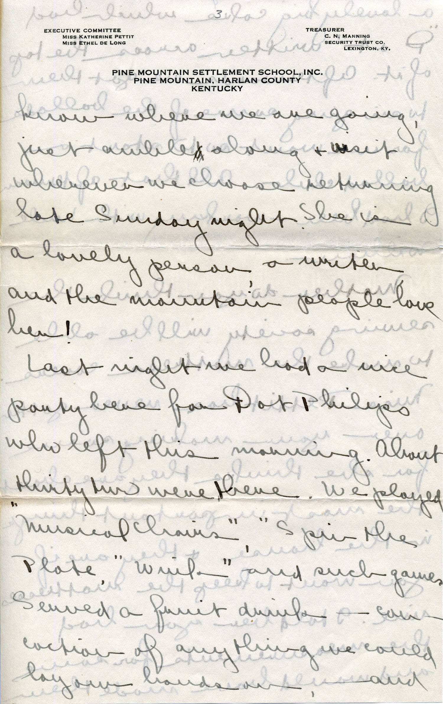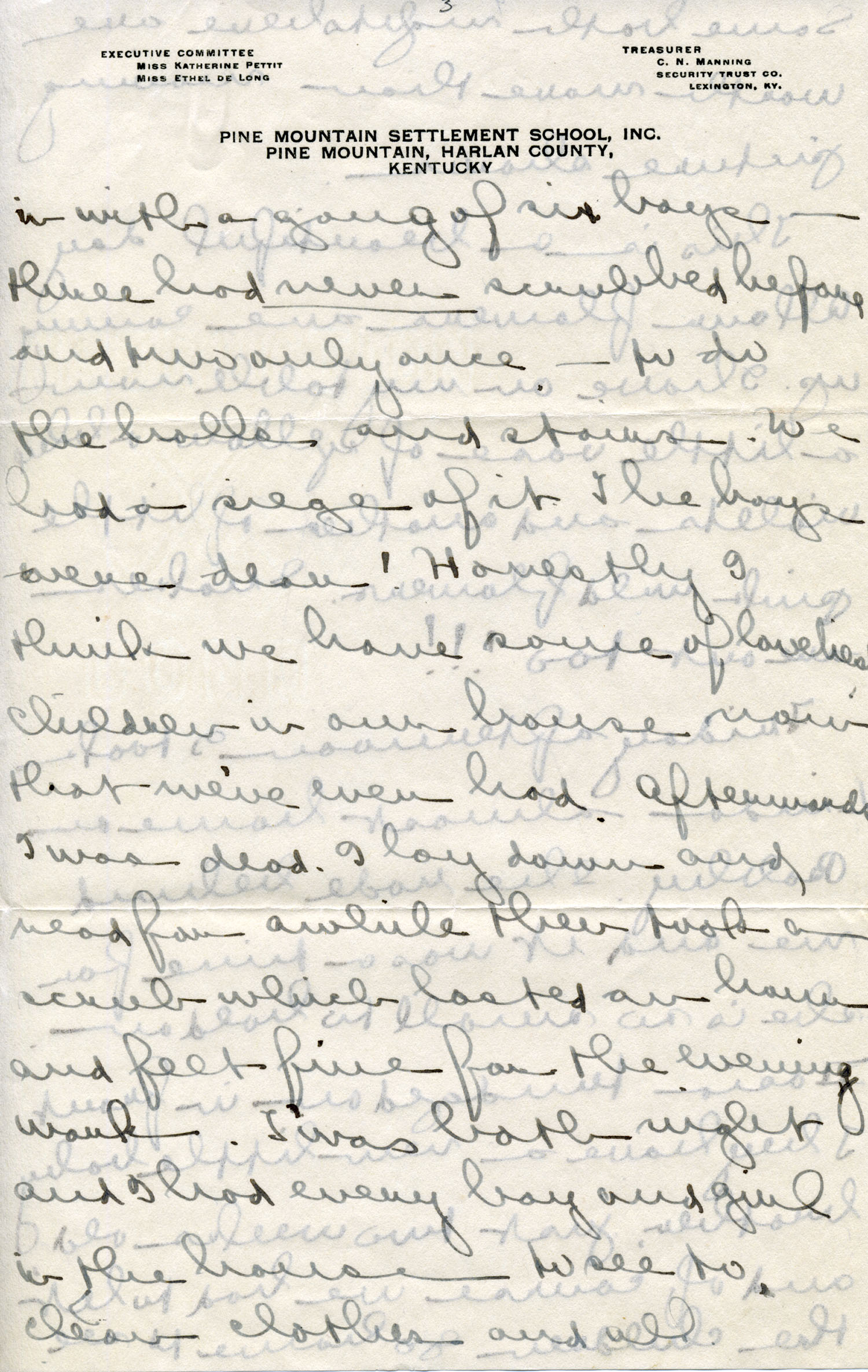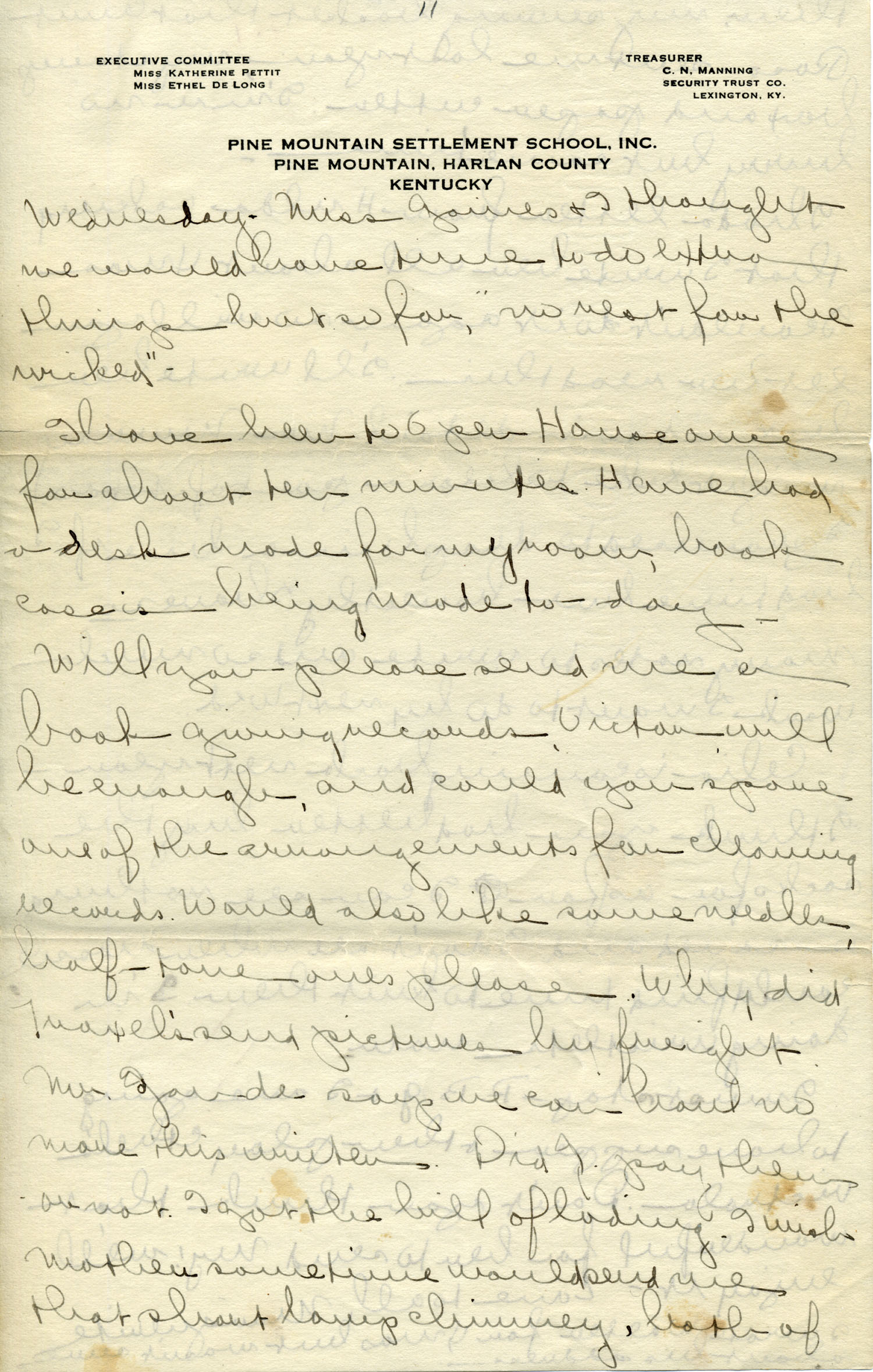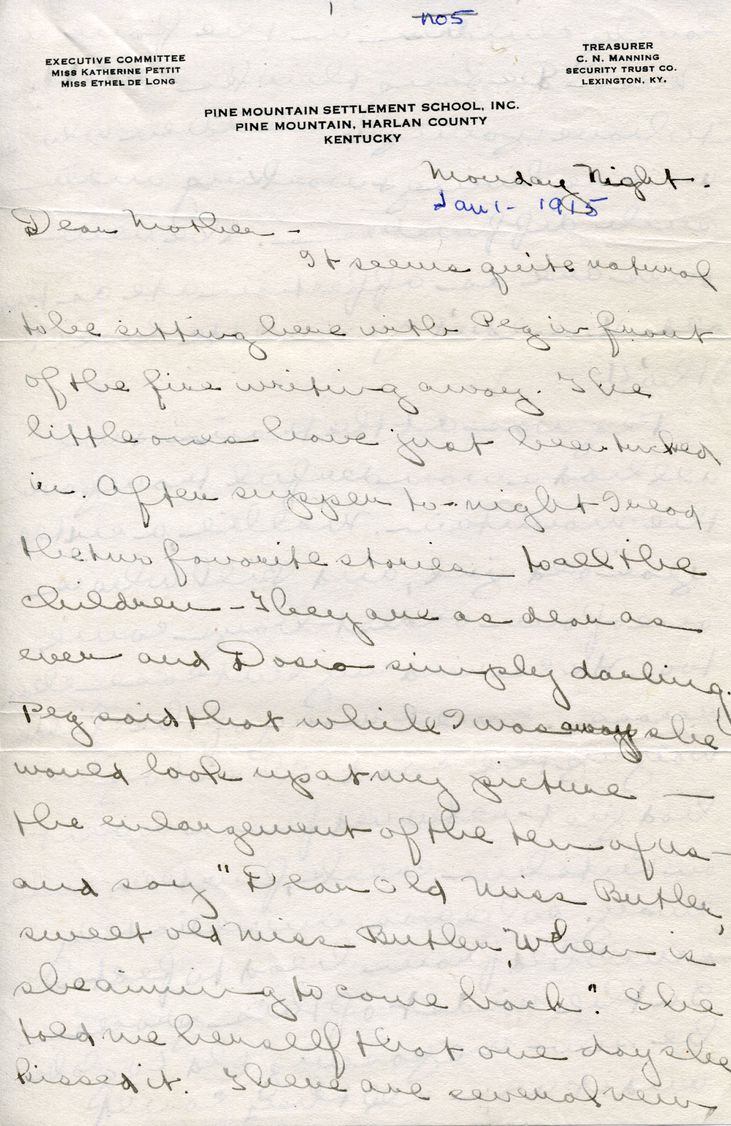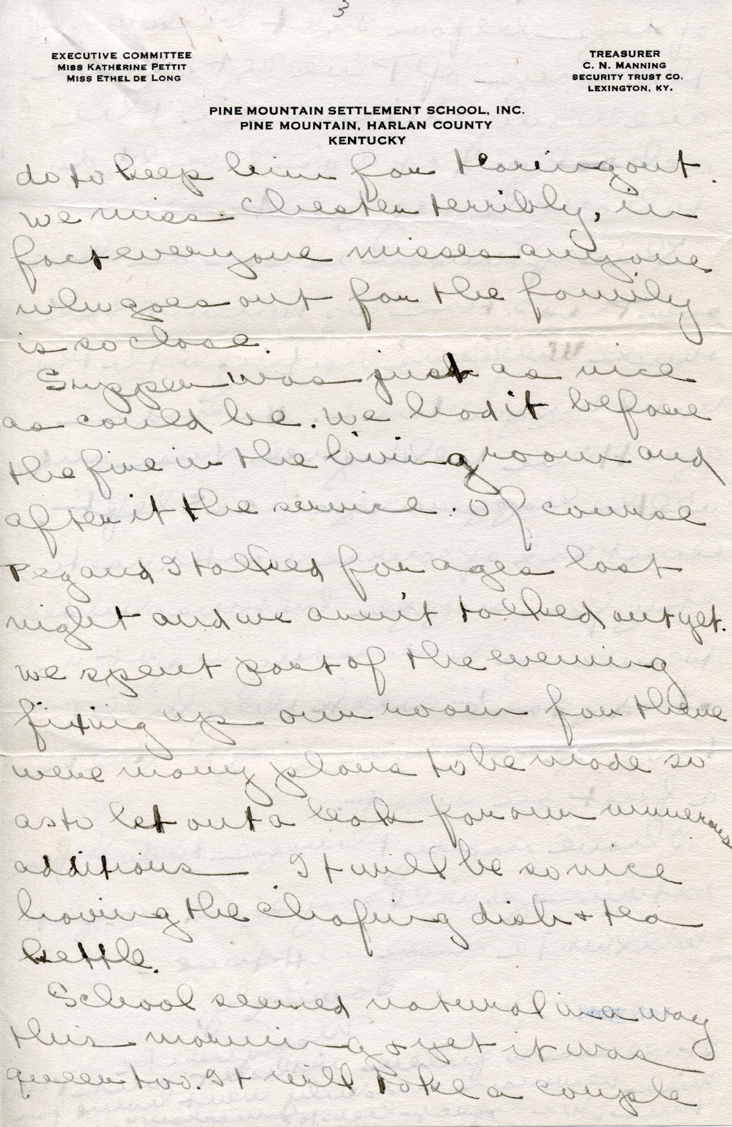Dear Jeannette — It is just nine thirty and every bit of the housework is done. The children are all out playing for about a half hour until it’s time for Sunday School, so unless K. P. [Katherine Pettit] comes I’m good for a little while. I wonder if Celia called you up. She sent me a box of Mullove’s candy with a note “I wish you were here!” Even Uncle William thought she might have gone to some other place besides Cincinnati. He didn’t think it was quite right. Miss Gaines and I are to leave Thursday morning, reaching Cumberland Gap about six that night. Celia joins us there about noon on Friday. I haven’t been across Pine Mt. since January 4th so am looking forward to the trip. We’ll be back Sunday. Mrs. Light [Mrs. Ella Sue Light, housemother] is taking my children in school for two days and I guess K. P. will have to take the house.