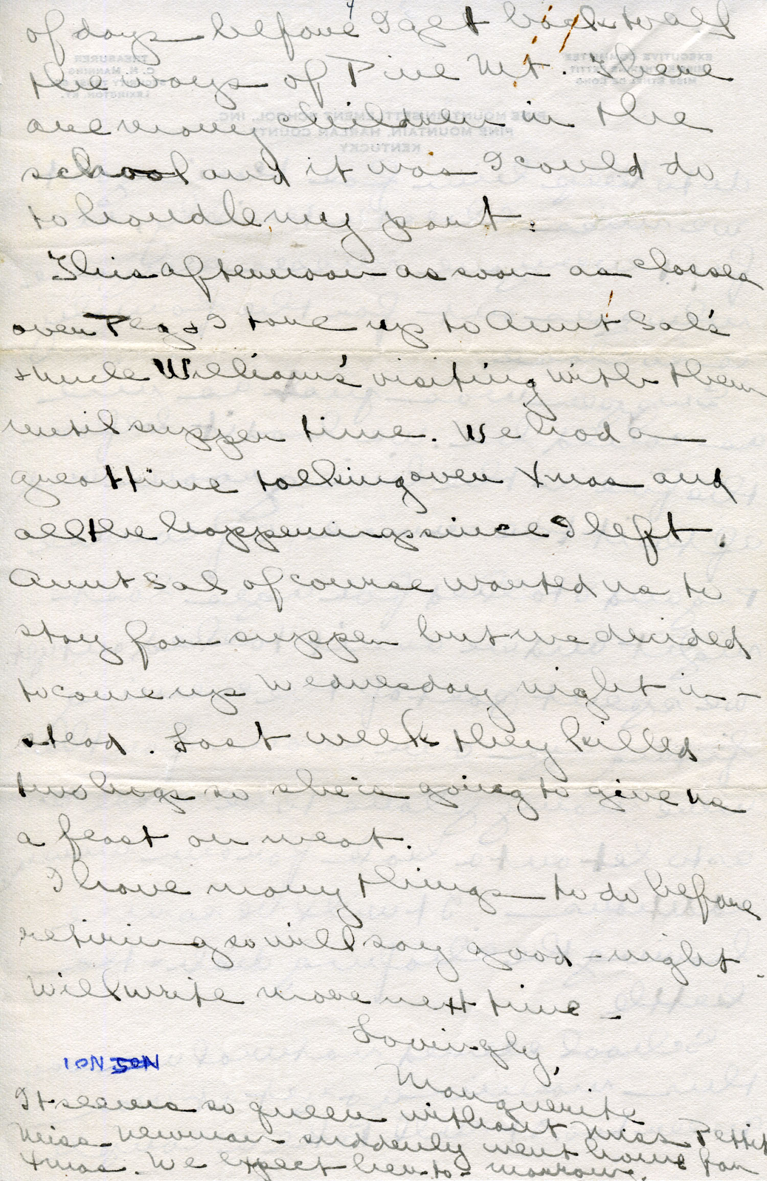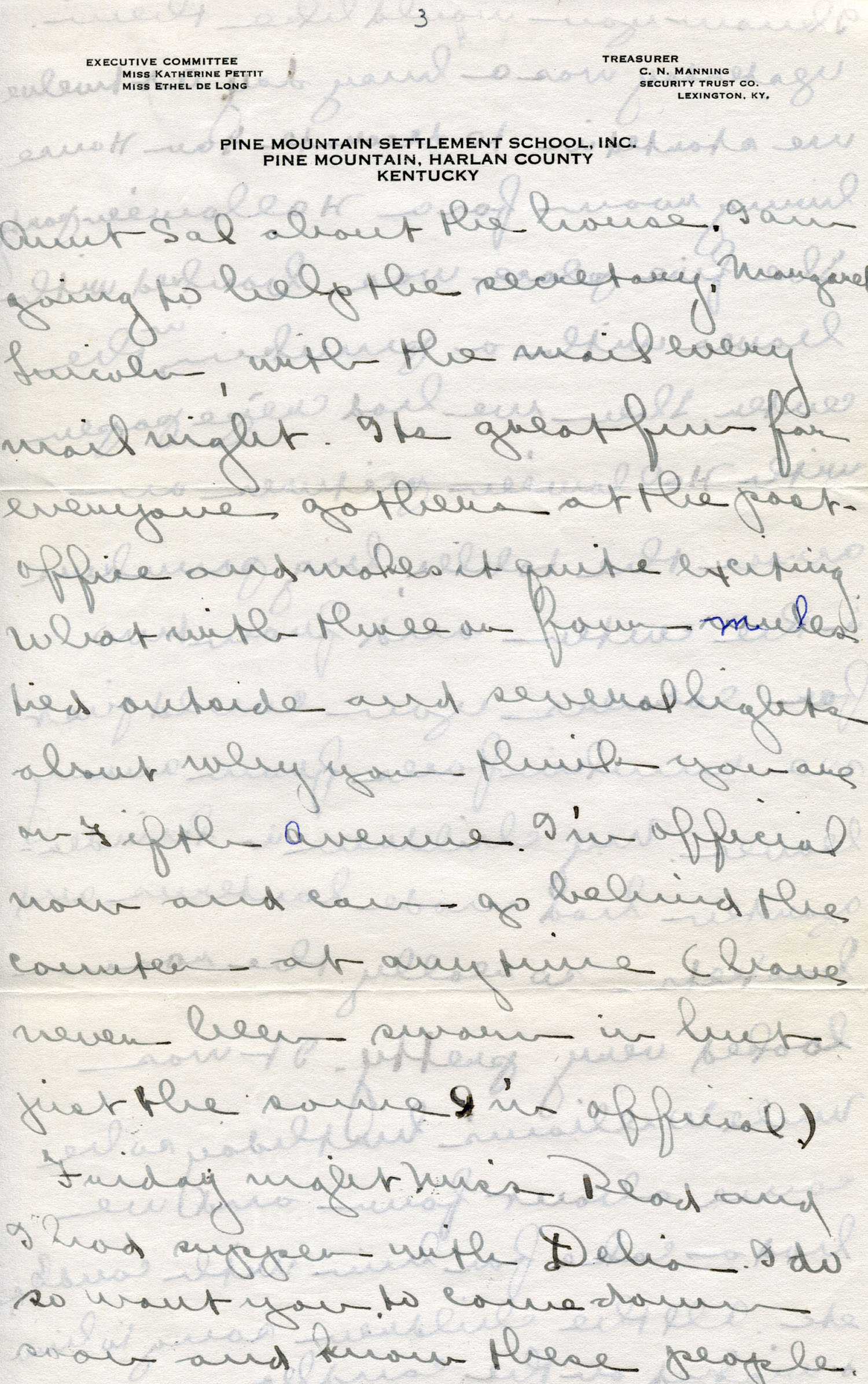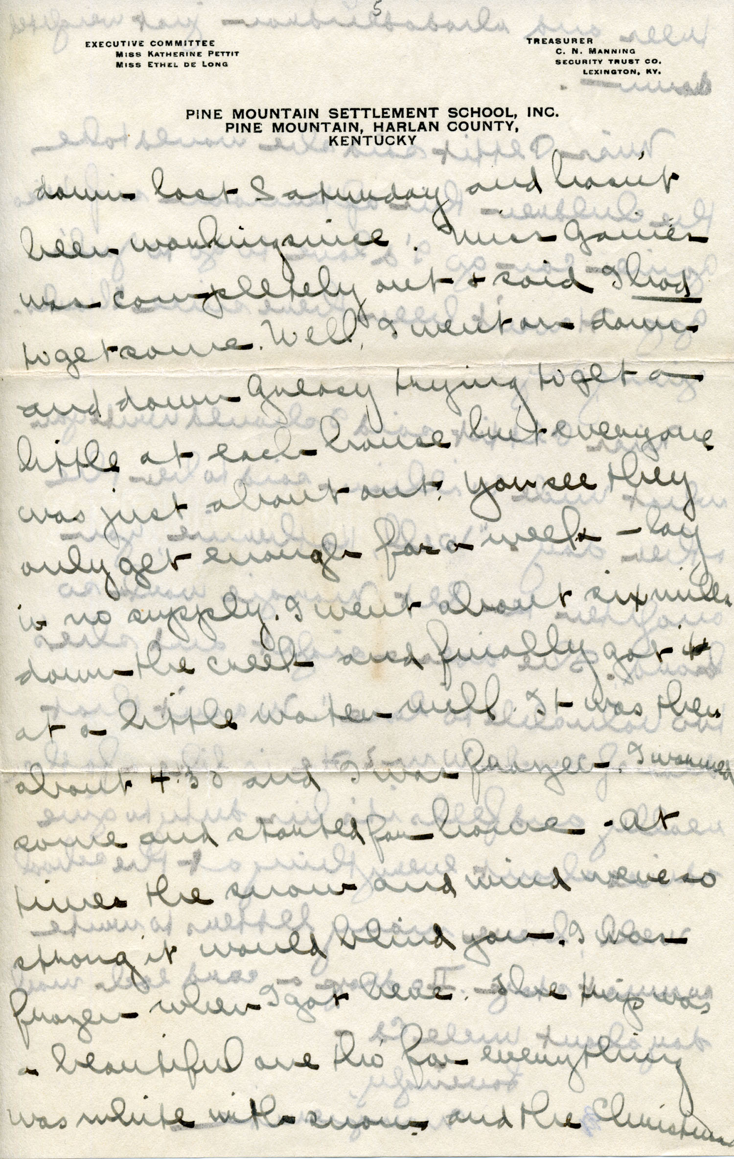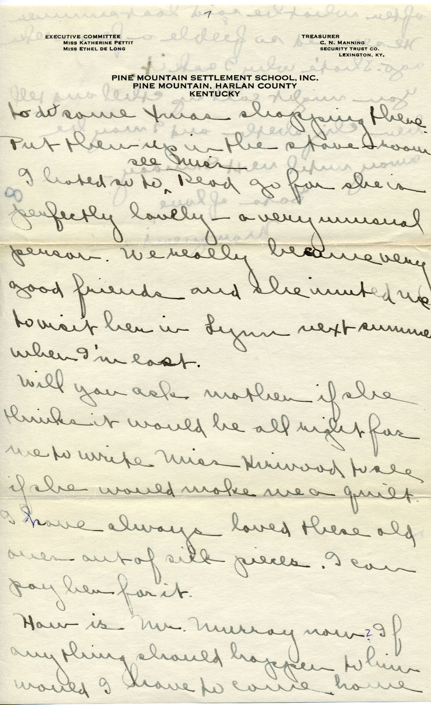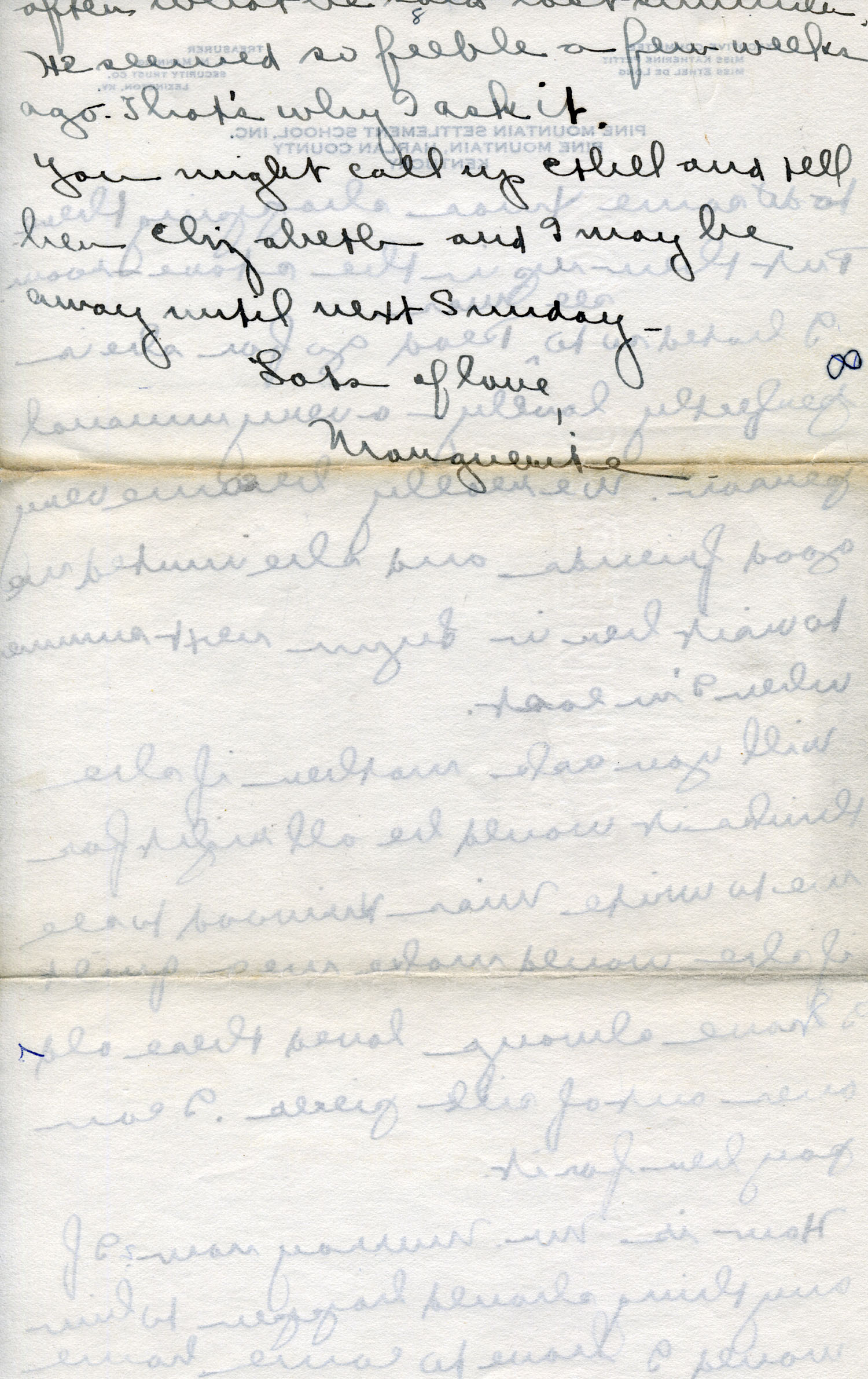 Dear Jeannette — It is just nine thirty and every bit of the housework is done. The children are all out playing for about a half hour until it’s time for Sunday School, so unless K. P. [Katherine Pettit] comes I’m good for a little while. I wonder if Celia called you up. She sent me a box of Mullove’s candy with a note “I wish you were here!” Even Uncle William thought she might have gone to some other place besides Cincinnati. He didn’t think it was quite right. Miss Gaines and I are to leave Thursday morning, reaching Cumberland Gap about six that night. Celia joins us there about noon on Friday. I haven’t been across Pine Mt. since January 4th so am looking forward to the trip. We’ll be back Sunday. Mrs. Light [Mrs. Ella Sue Light, housemother] is taking my children in school for two days and I guess K. P. will have to take the house.