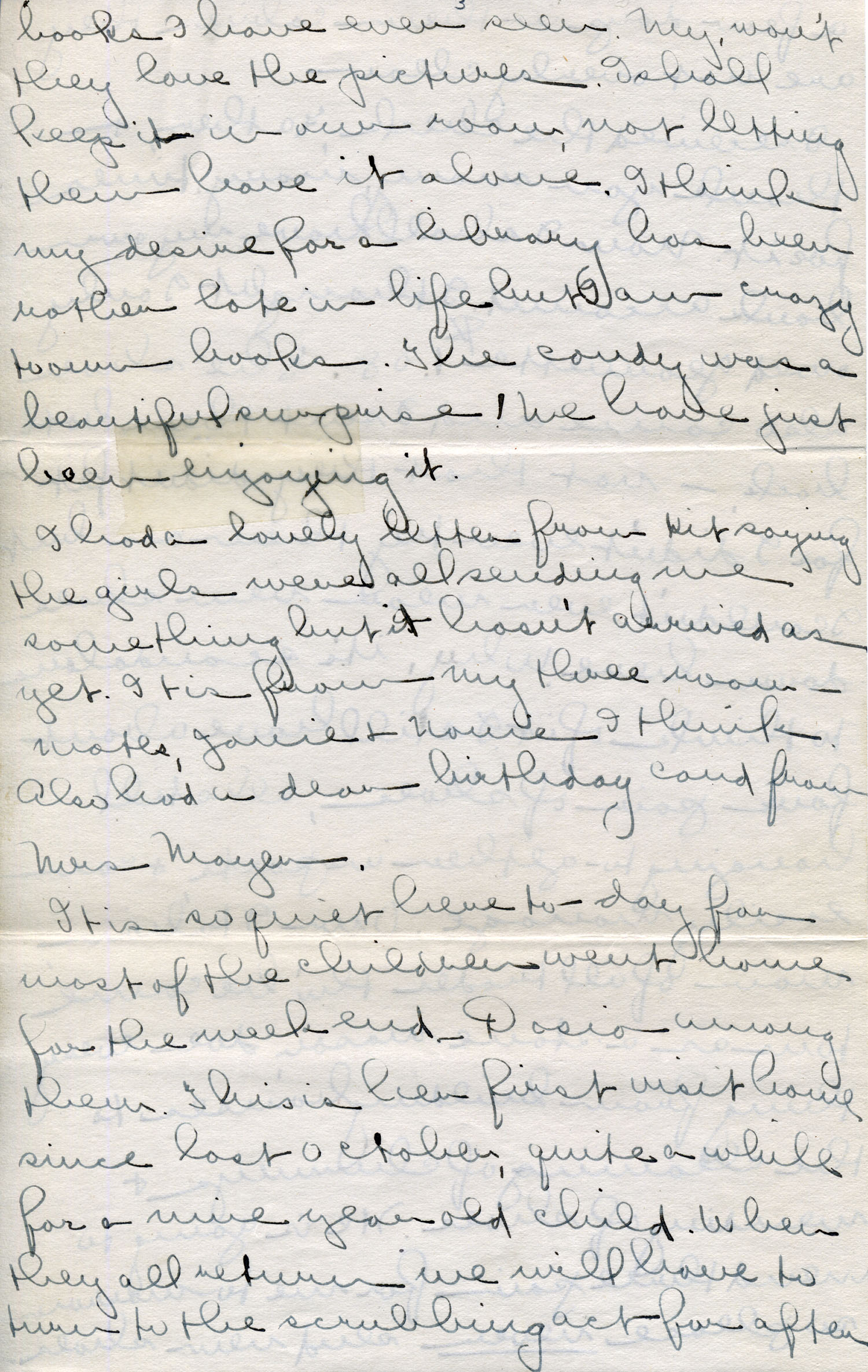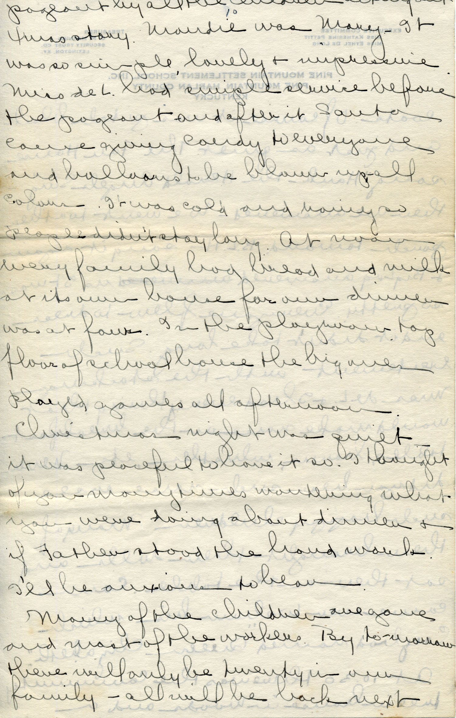 At 10:30 there was the community tree in House in Woods and a pageant by all the children acting out the Xmas story. Maudie was Mary. It was so simple, lovely and impressive. Miss de Long had simple service before the pageant and after it Santa came giving candy to everyone and balloons to be blown up–all colors. It was cold and rainy so people didn’t stay long. At noon every family had bread and milk at its own house for our dinner was at four. In the playroom top floor of school house the big ones played games all afternoon. Christmas night was quiet — it was peaceful to have it so. I thought of you many times wondering what you were doing about dinner and if Father stood the hard work. I’ll be anxious to hear.