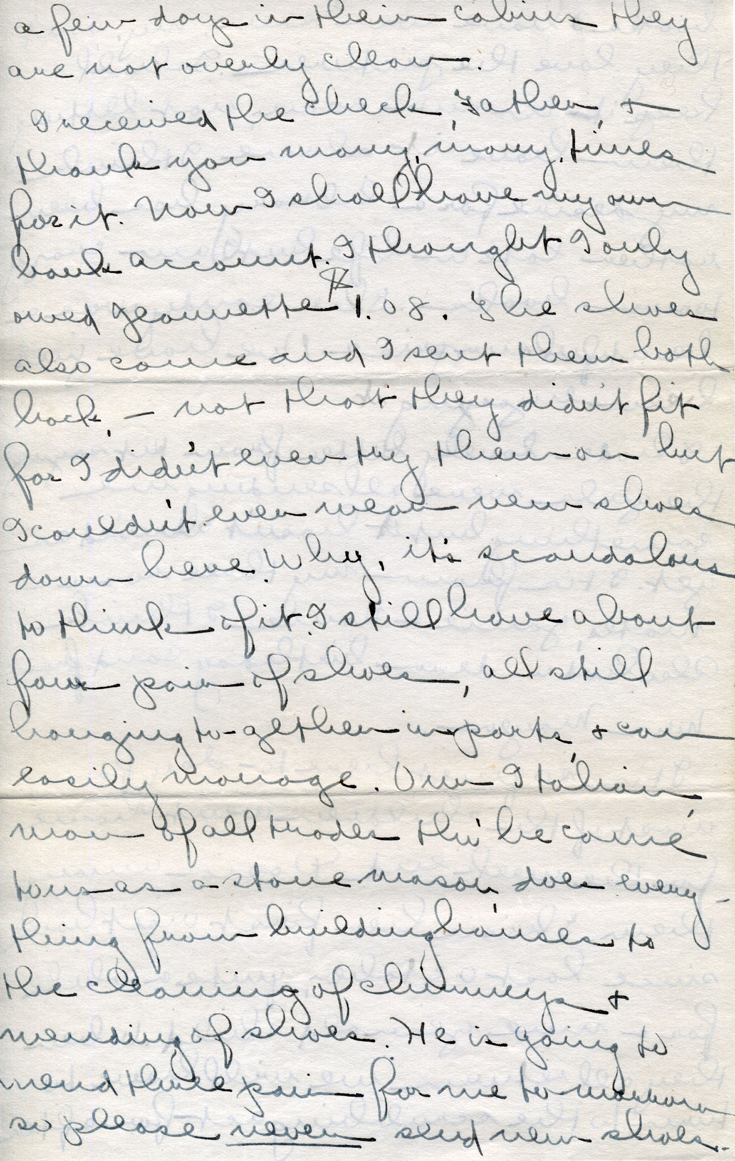Dear Jeannette – Was so surprised to hear about Uncle Ed – only hope he’ll be better soon. Am anxious to know if you went to Cleveland. I think you are crazy if you didn’t. Yes, the watch came all right. The rubbers are fine! The right kind for here exactly. The dainty ladies’ boots which you sent first would have been in holes in a few days over our rough, rocky paths. Mother wanted to know if I needed some boots. No, I can get along beautifully and our winter weather is most over now. Mother said that Potter’s owed her still. I can make huge of that in May easily – just let them credit her with it.