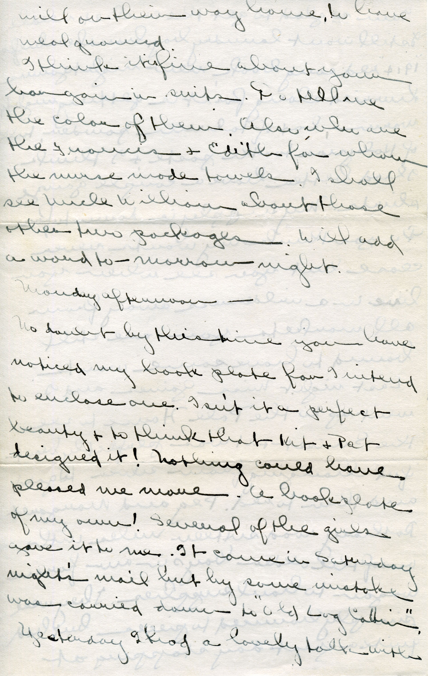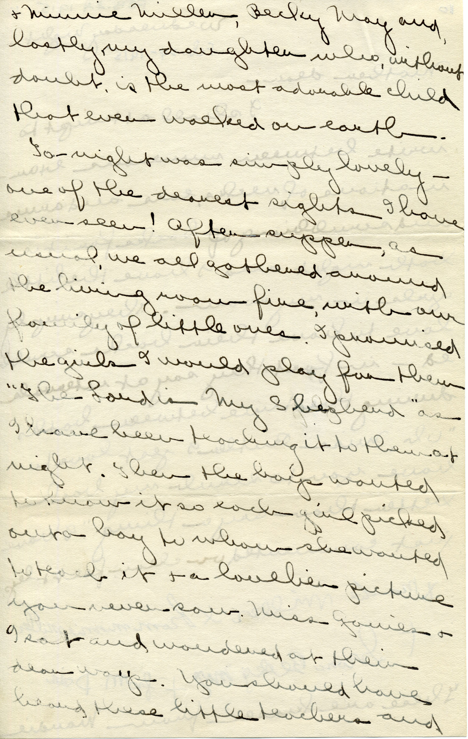 We are all invited to Delia’s [Creech] for supper this Friday night. Everyone has been so nice to the girls. Am so glad Mother went to see the_______ . Do have her write what she thinks about my dresses.