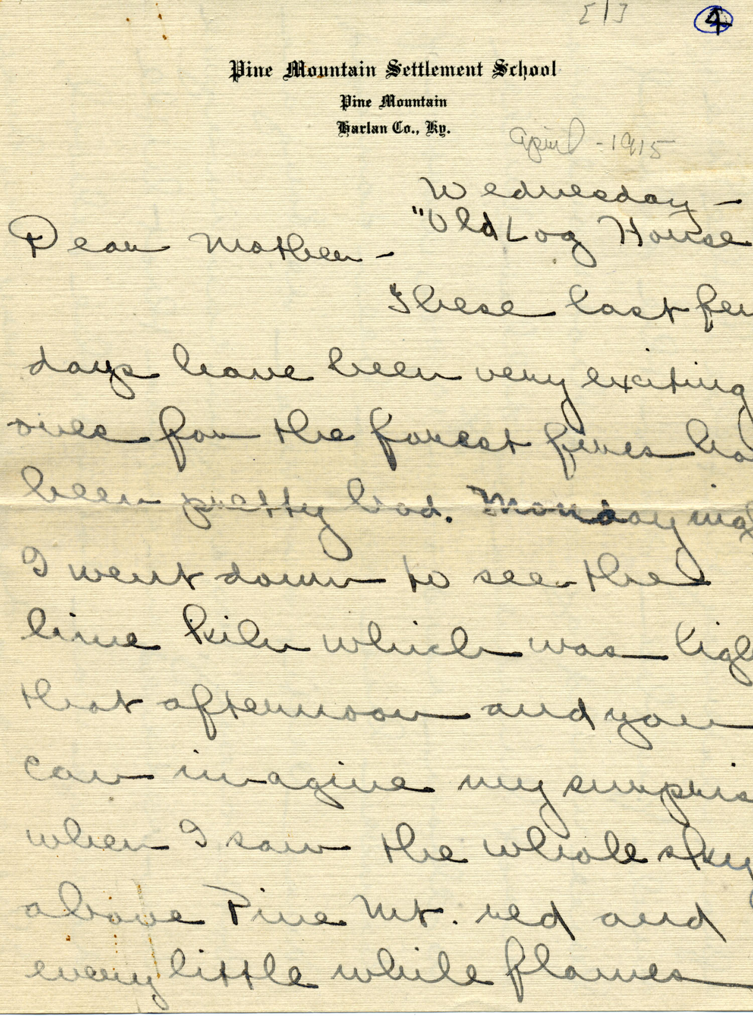 4. 1915 LETTER 4 – April 1915 – “Old Log House” – “Dear Mother — These last few days have been very exciting…” [images 028-035]