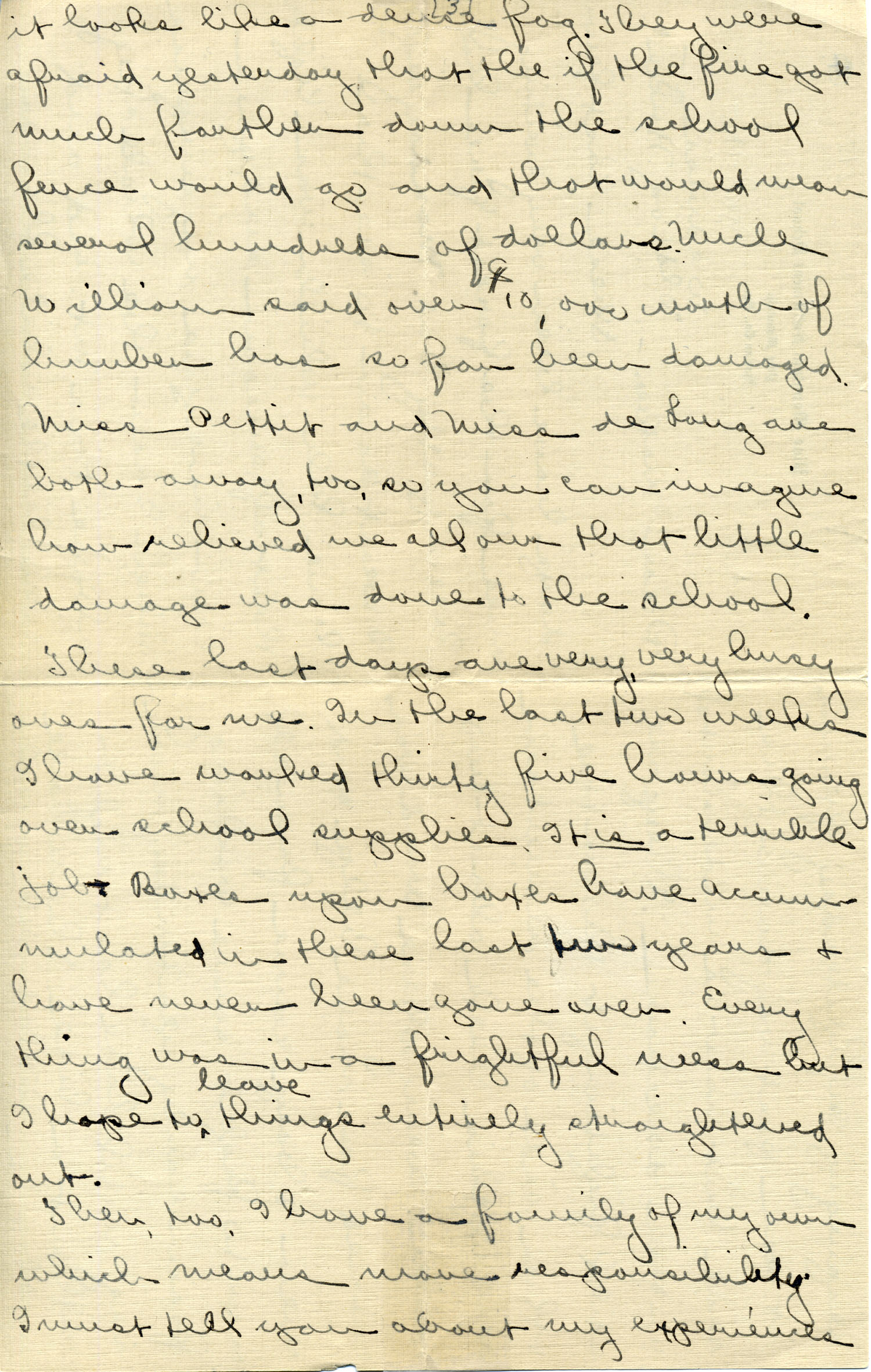 Forest fires ; going over boxes ; accident to boy ; $10,000 lumber damaged by fire ; school supplies ; Wilson tells “lie” ; Pettit and Gaines at Convention of Southern Workers conference ; Francis falls on stile and hits her head ; Monroe goes for nurse ; plans trip home ;