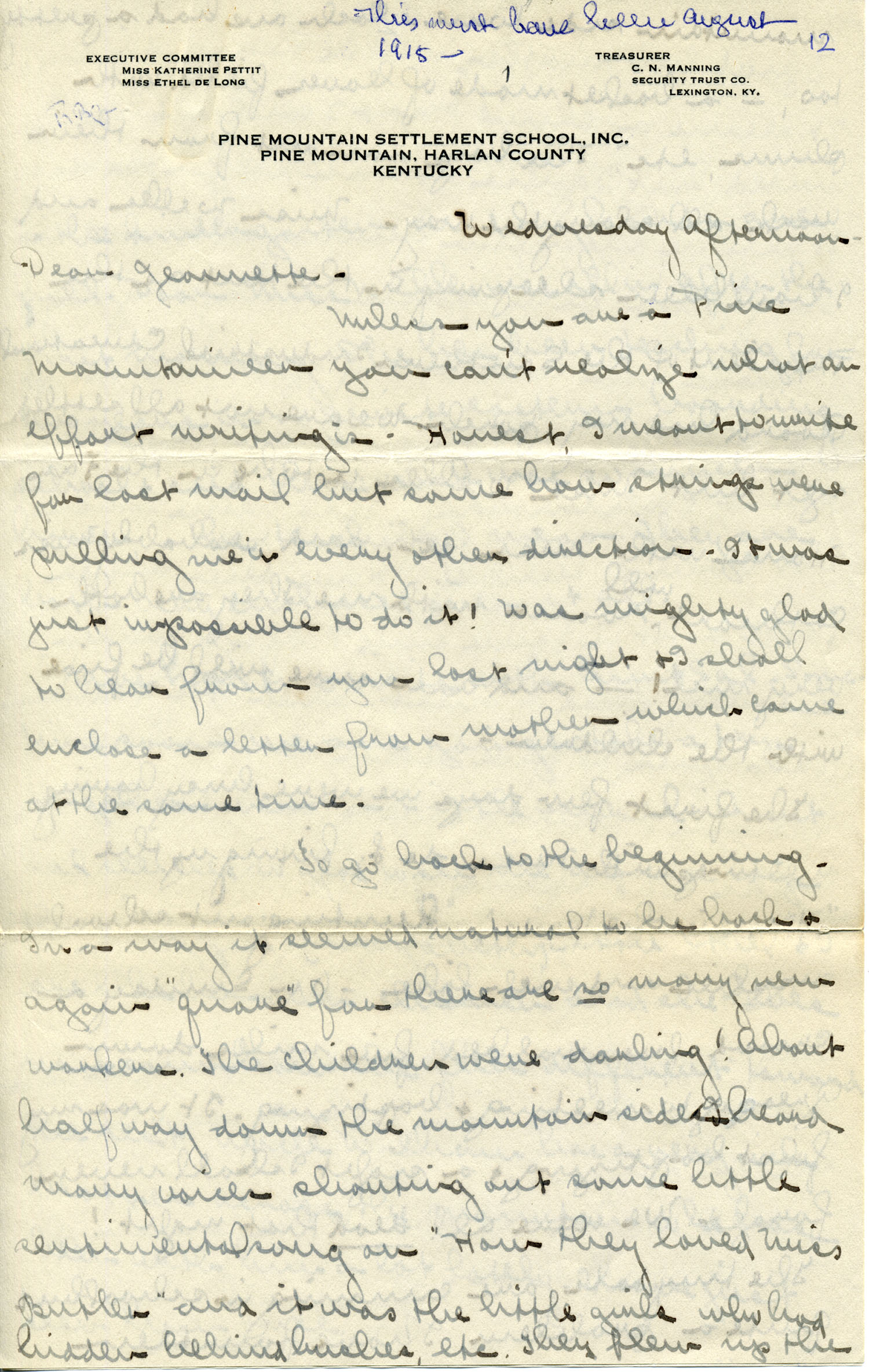 Wednesday afternoon, August 1915 [?] – “Dear Jeannette — Unless you are a Pine Mountaineer …” [images 036-039]