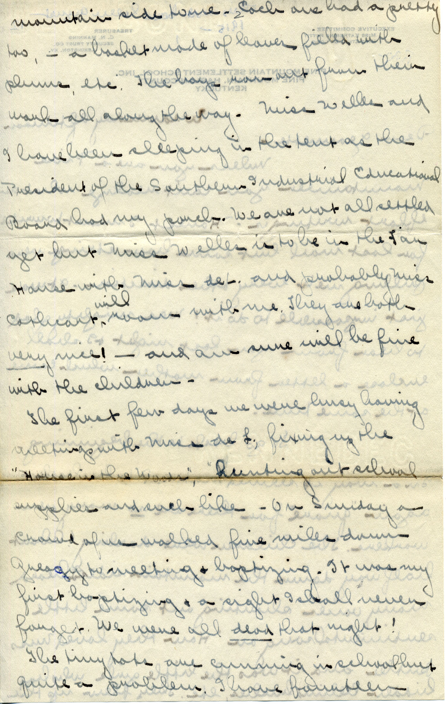 Writing is a chore ; refers to “quare” new workers ; President of the Southern Industrial Educational Board on campus ; Evelyn Wells comes from two years teaching in private eastern boarding school ; Celia Cathcart new to campus ; went to meeting and baptizing ; 14 “cunning tots” in kindergarten class ; Dot Phillips ; Miss Gaines ; chicken is only meat ; asks for butter ; visits with Aunt Sal ;