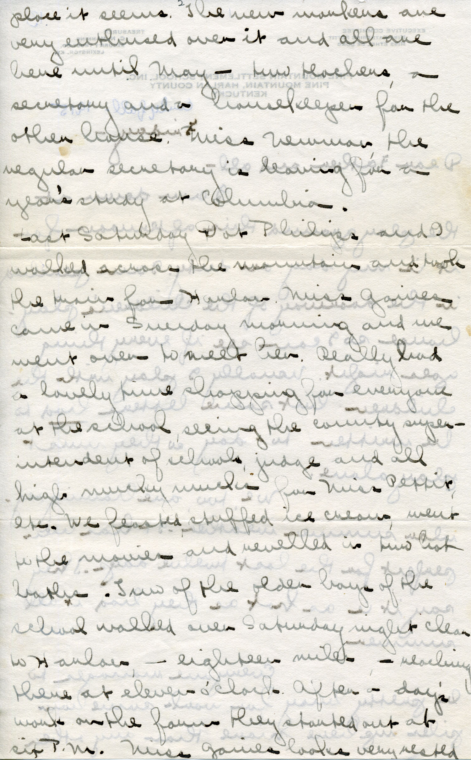 Last Saturday [Dorothy] ‘Dot’ Philips and I walked across the mountain and took the train for Harlan. Miss Gaines came in Sunday morning and we went over to meet her. Really had a lovely time shopping for everyone at the school, seeing the county superintendent of schools, judge and all high mucky mucks for Miss Pettit, etc. We feasted, stuffed ice cream, went to the movies and reveled in two hot baths. Two of the older boys of the school walked over Saturday night clear to Harlan — eighteen miles — reaching there at eleven o’clock. After a day’s work on the farm they started out at six P.M. Miss Gaines looks very rested and she was eager to get back. I never experienced a hotter walk than ours was Sunday over the mountain. We had lots of