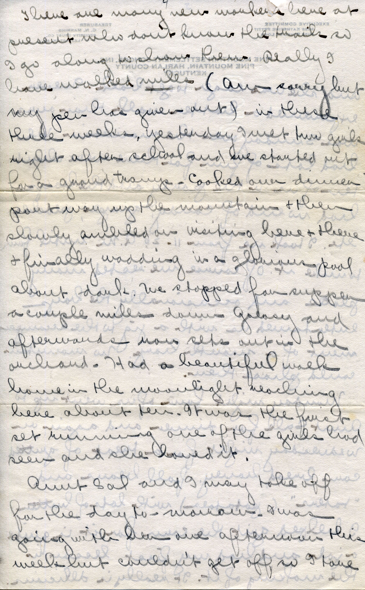 Last Friday the four of us (I + the three Pole House people) had supper at Aunt Sal’s. We started out yesterday afternoon at 2:30 expecting to climb Jack’s Gap to see the sunset but when we got part way realized we never could make it by dark so instead climbed to the top of a ridge – watched the sunset and cooked our supper. It was a beautiful night and we had such fun coming home by moonlight. The creeks were high and we had a killing time crossing them. Everyone of us fell in during the trip.