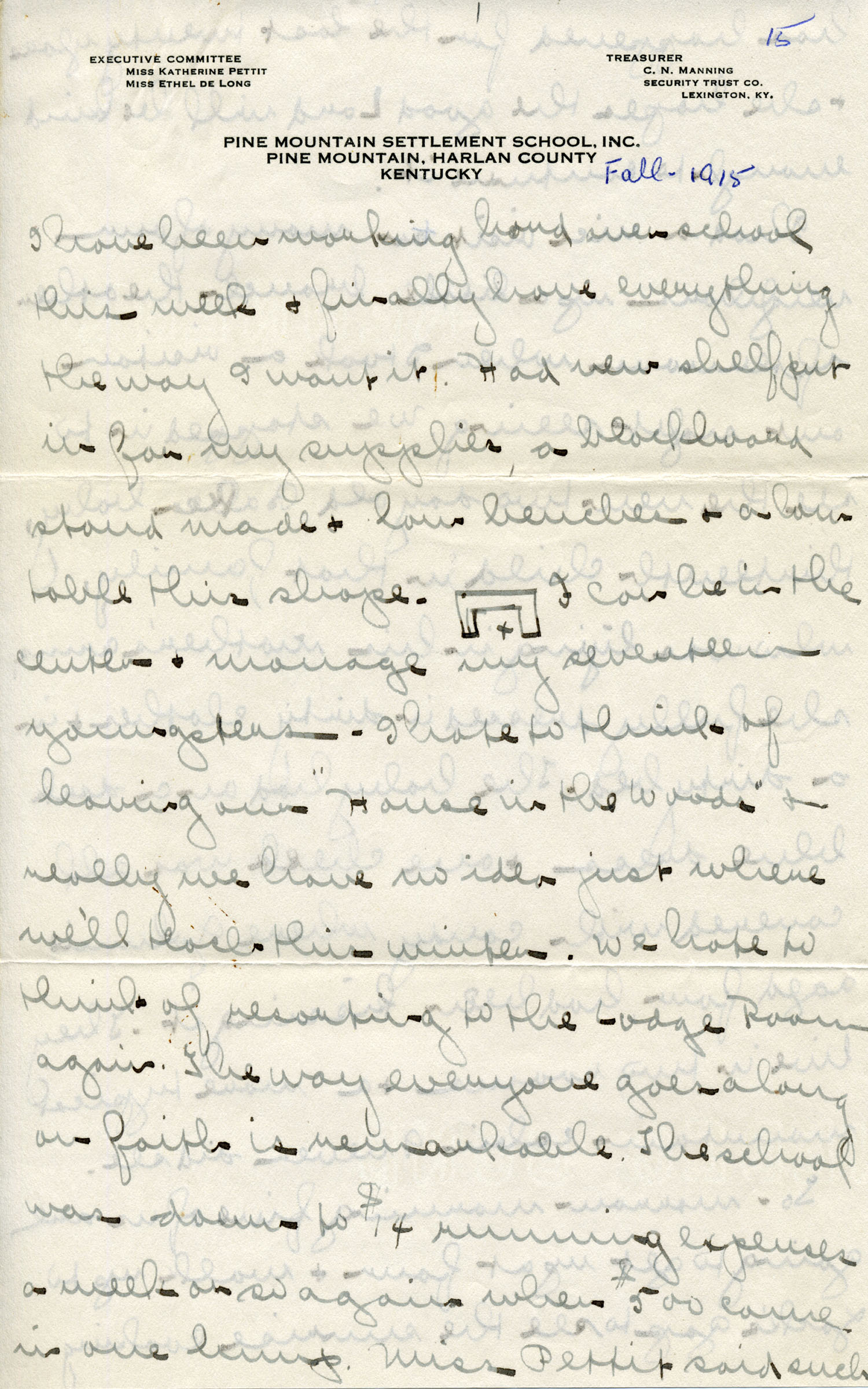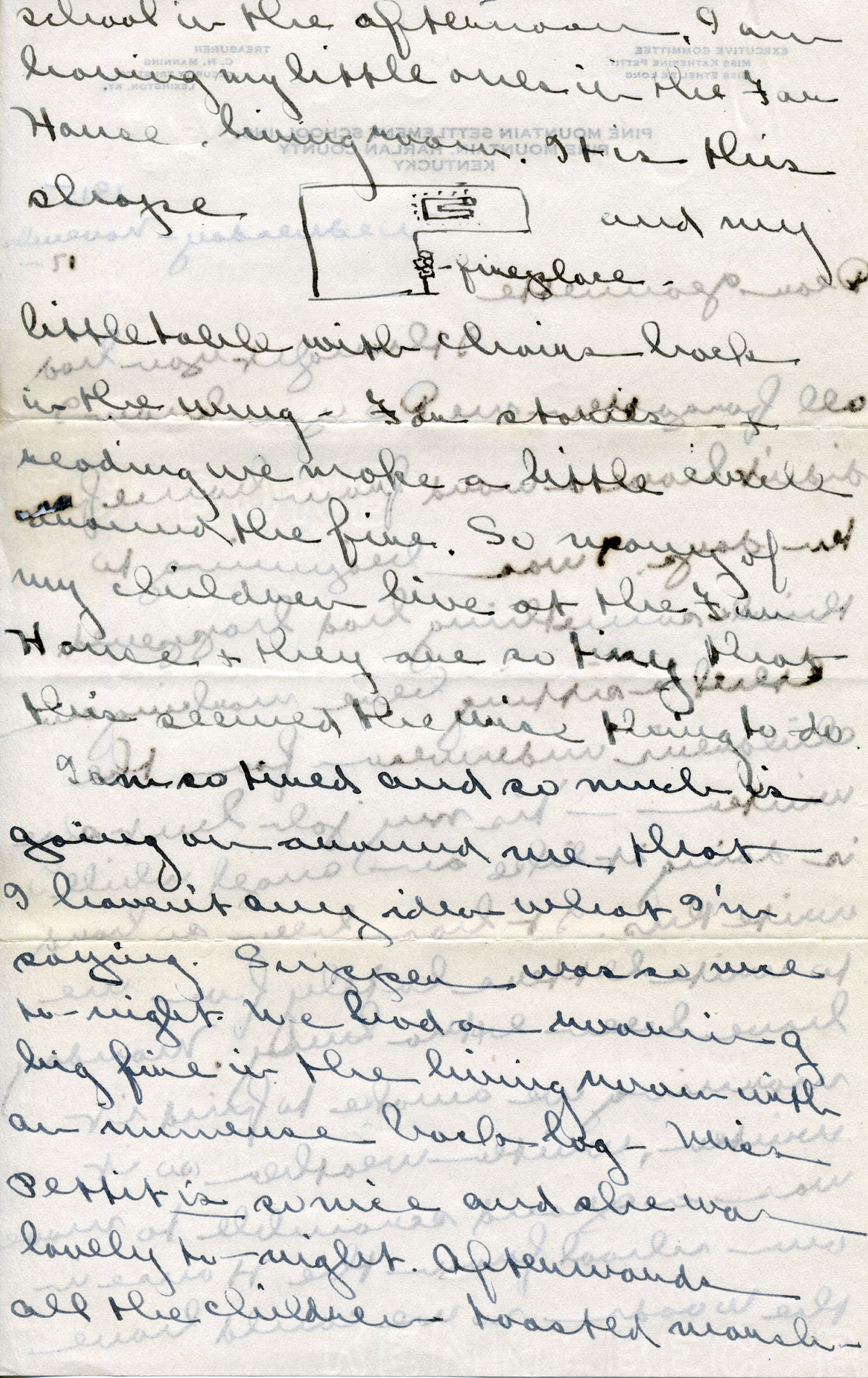 I have been working hard over school this week and finally have everything the way I want it. Had new shelf put in for my supplies, a blackboard stand made and low benches and a low table this shape. [drawing] I can be in the center and manage my seventeen youngsters. I hate to think of leaving our “House in the Woods” and really have no idea just where we’ll teach this winter. We hate to think of resorting to the Lodge Room again. The way everyone goes along on faith is remarkable. The school was down to $14 running expenses a week or so again when $500 came in one lump. Miss Pettit said such has happened for the last twenty years and she hopes the good Lord will be kind enough to continue it.