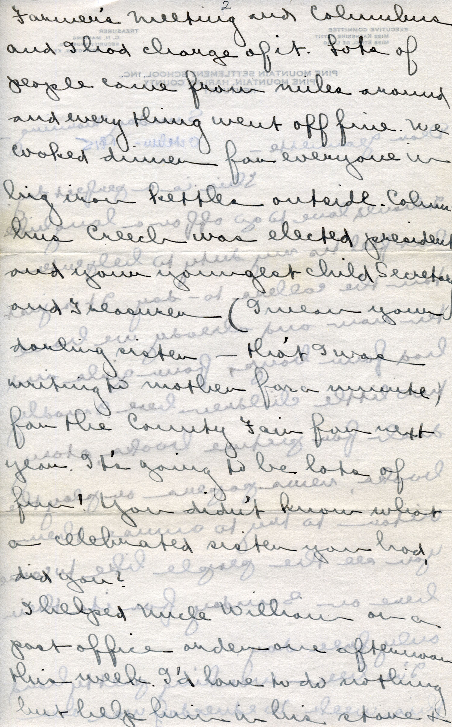 I’ve been working pretty hard this week. Wednesday was our Farmer’s Meeting and Columbus and I had charge of it. Lots of people came from miles around and everything went off fine. We cooked dinner for everyone in big iron kettles outside. Columbus Creech was elected president and your youngest child Secretary and Treasurer (I mean your darling sister – tho’t I was writing to mother for a minute) for the County Fair for next year. It’s going to be lots of fun! You didn’t know what a celebrated sister you had, did you?