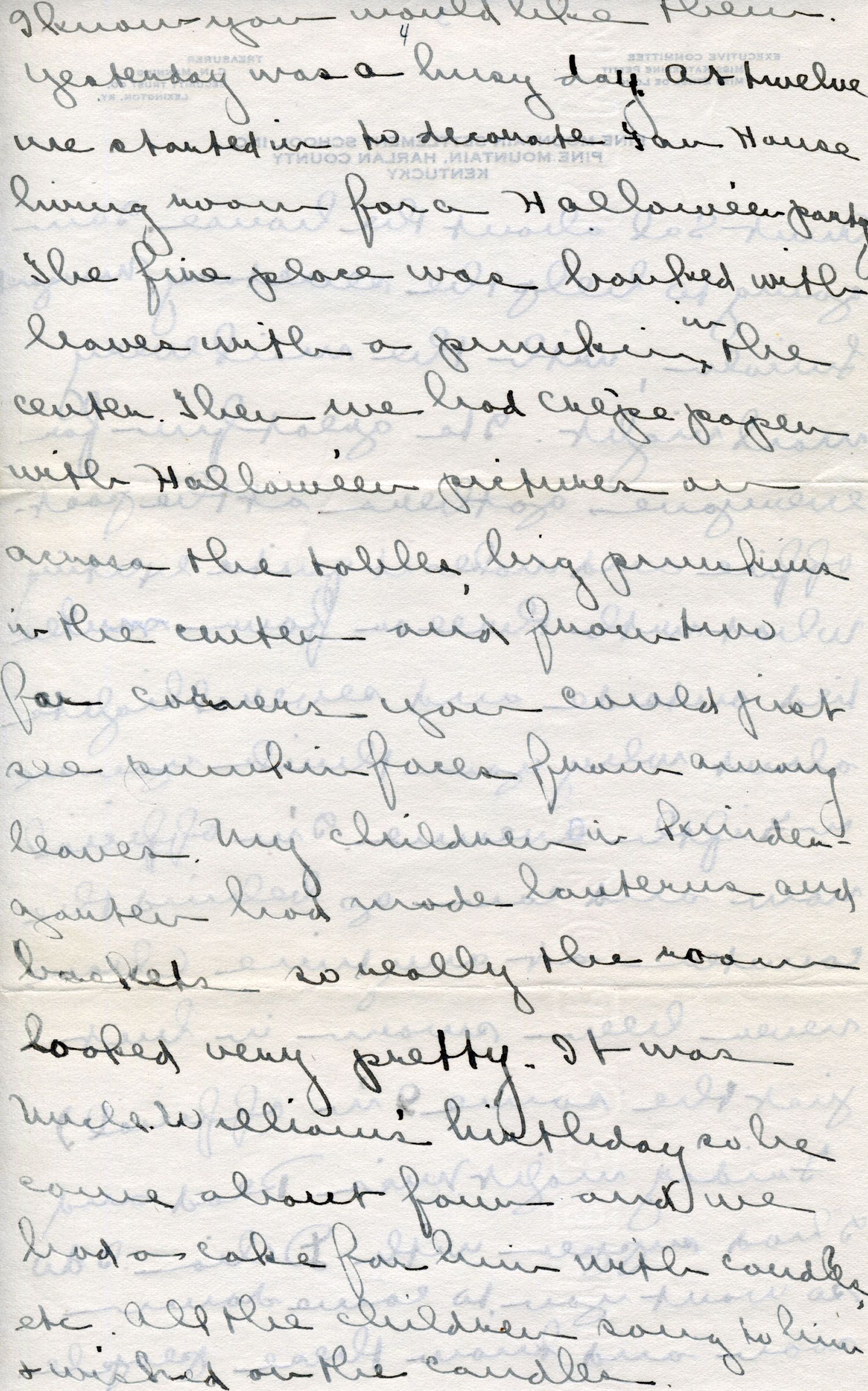 Perfect day ; Farmer’s Meeting with Columbus Creech ; helped Uncle William with Post Office management ; Elizabeth Goodale Read and Marguerite have supper with Delia ; Halloween party in new Far House living room ; Uncle William’s birthday ; Miss Lincoln and Elizabeth Goodale Read to Cumberland Gap ; trip to Hindman ; Miss Read’s departure ;