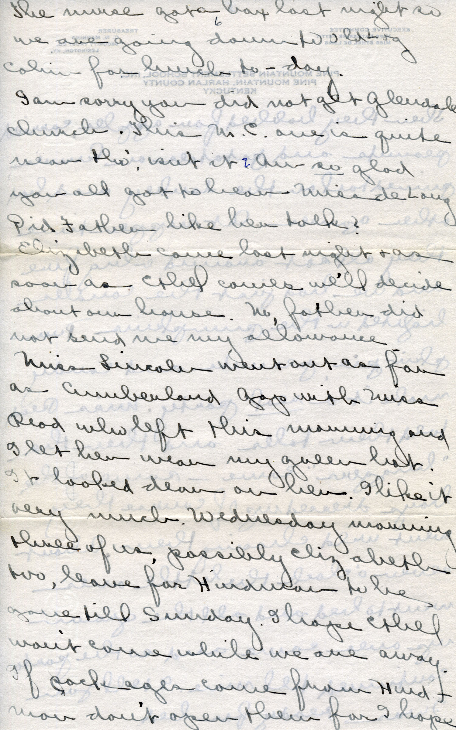 Miss Lincoln [Margaret Lincoln] went out as far as Cumberland Gap with Miss Read who left this morning and I let her wear my green hat. It looked dear on her. I like it very much. Wednesday morning three of us, possibly Elizabeth too, leave for Hindman to be gone till Sunday. I hope Ethel won’t come while we’re away. If packages come from Hindman don’t open them for I hope to do some Christmas shopping there. Put them up in the storeroom.