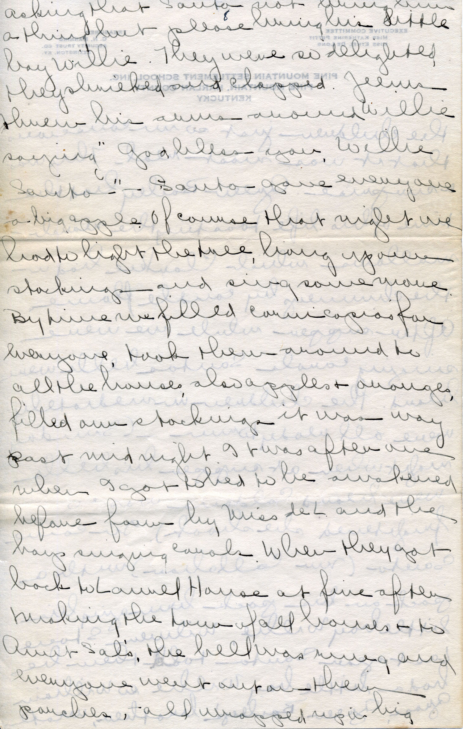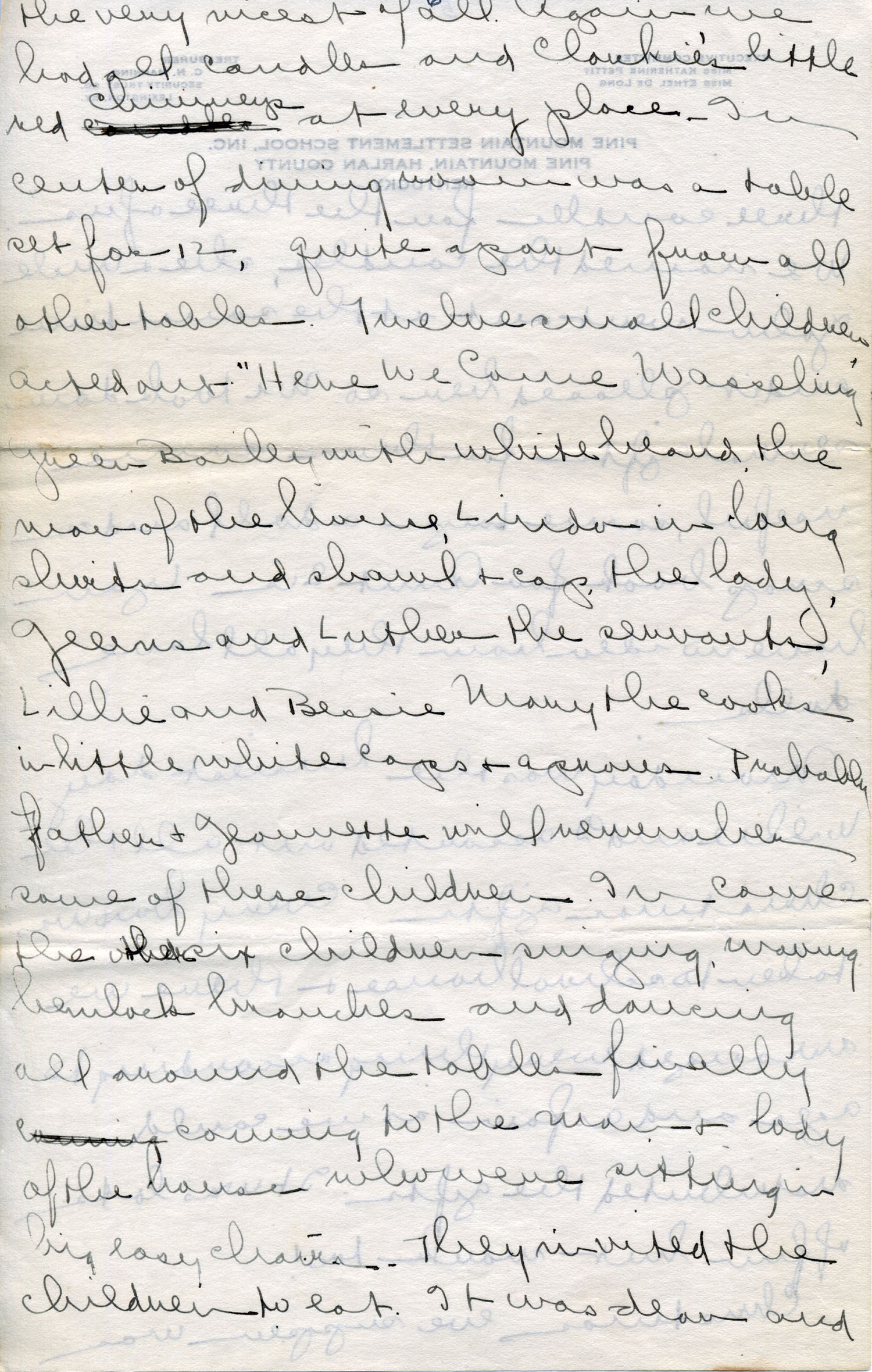 Christmas eve supper was the very nicest of all. Again we had all candles and Clarkie’s little red chimneys at every place. In center of the dining room was a table set for 12, quite apart from all other tables. Twelve small children acted out “Here We Come Wassaling,” Green Bailey [Gross] with white beard the man of the house, Linda in long skirts and shawl and cap the lady, J_______ i and Luther the servants, Lillie and Bessie Mary the cooks in little white caps and aprons. Probably Father and Jeannette will remember some of these children. In came the other six children singing, waving hemlock branches and dancing all around the tables, finally coming to the man and lady of the house who were sitting in big easy chairs. They invited the children to eat. It was dear and the children just so unconscious that it was most real. This was a surprise. Green Bailey had the time of his life toasting the marshmallows which Clarkie had in the chimneys by candle flame. After supper while we were singing carols Santa’s bells were heard. The children immediately were all ready to run. (Sunday night when at supper his bells were heard Coldona was so frightened she shook.) In came Santa (Mr. Callahan) with a pack on his back bringing his little boy, Willie, (Wilmen Stoere). Last year Santa told them he had a little boy Willie so William Gross, Green Bailey’s brother, wrote asking that Santa not bring him a thing but please bring his little boy Willie. They were so delighted they shrieked and clapped. Jeems threw his arms around Willie saying “God bless you, Willie Santa”. Santa gave everyone a big apple. Of course that night we had to light the tree, hang up our stockings and sing some more. By time we filled cornucopias for everyone, took them around to all the houses, also apples and oranges, filled our stockings it was way past midnight. It was after one when I got to bed, to be awakened before four by Miss de L[ong] and the boys singing carols. When they got back to Laurel House at five after making the tour of all houses and to Aunt Sal’s, the bell was rung and everyone went out on their porches, all wrapped up in big coats. Of course it was pitch black and just as quiet. The Far House sang “Hark, the Herald Angels Sing” — then we answered . We went to other porch toward Big Log House, sang it again, and Big Log answered us. It was so pretty. Everyone flew to dress and it didn’t take long. Such excitement with the stockings. Miss de L[ong] and I had everything that would make noise on the breakfast tables, horns, whistles, etc. Never did you hear such noise or see such happy children. Many of them brought their dolls and sat them on the table. Cam came over to show his which Gary had named “Queen Elizabeth.”