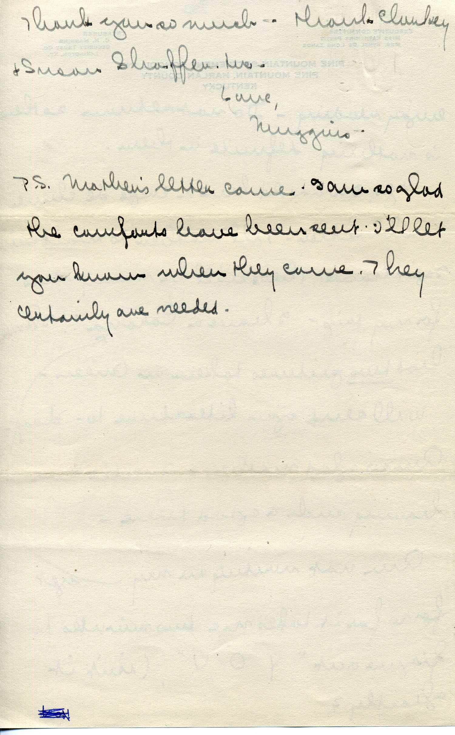 [P. S. Mother’s letter came. I am so glad the comforts have been sent. I’ll let you know when they come. They certainly are needed.]