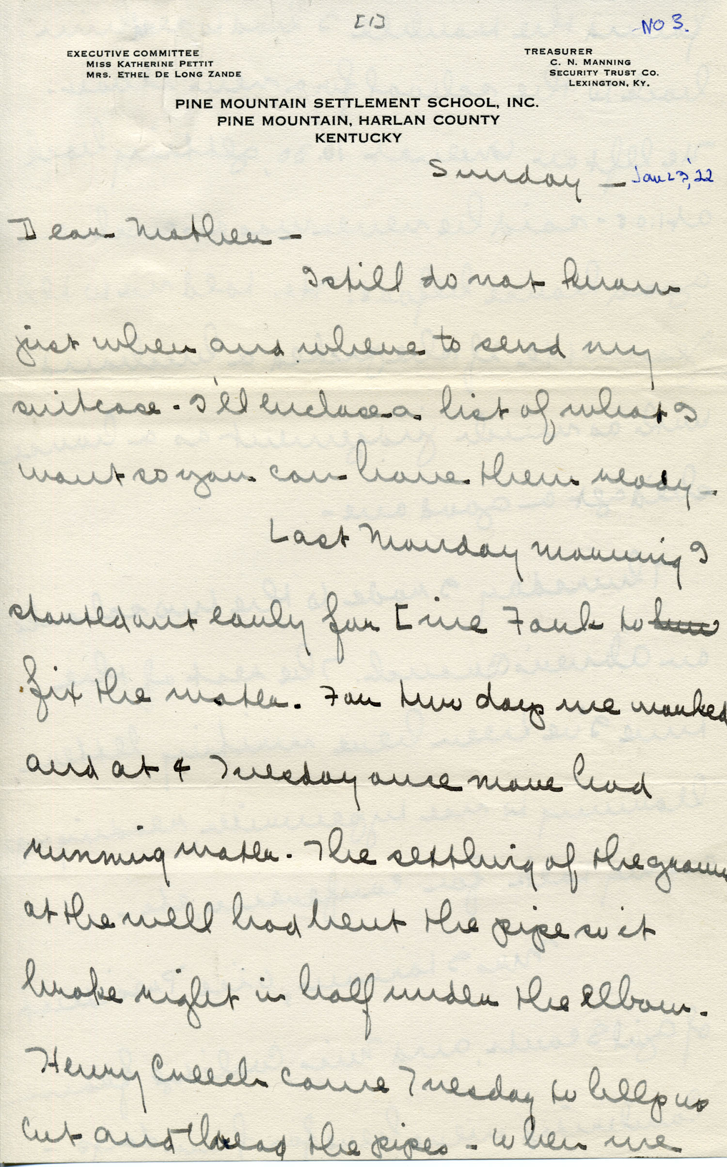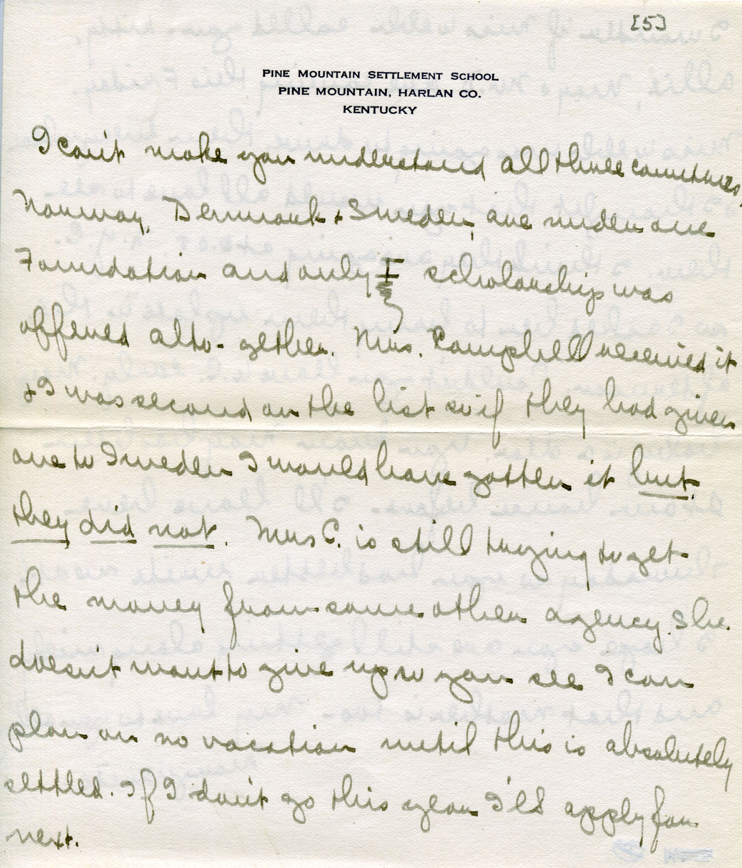 I am enclosing a card and letter from E. and M.L. You can destroy both. I can’t make you understand all three countries, Norway, Denmark & Sweden, are under one Foundation and only 1 scholarship was offered altogether. Mrs. [John C.] Campbell received it and I was second on the list so if they had given one to Sweden I would have gotten it but they did not. Mrs. C. [Campbell] is still trying to get the money from some other agency. She doesn’t want to give up so you see I can plan on no vacation until this is absolutely settled. If I don’t go this year I’ll apply for next.
