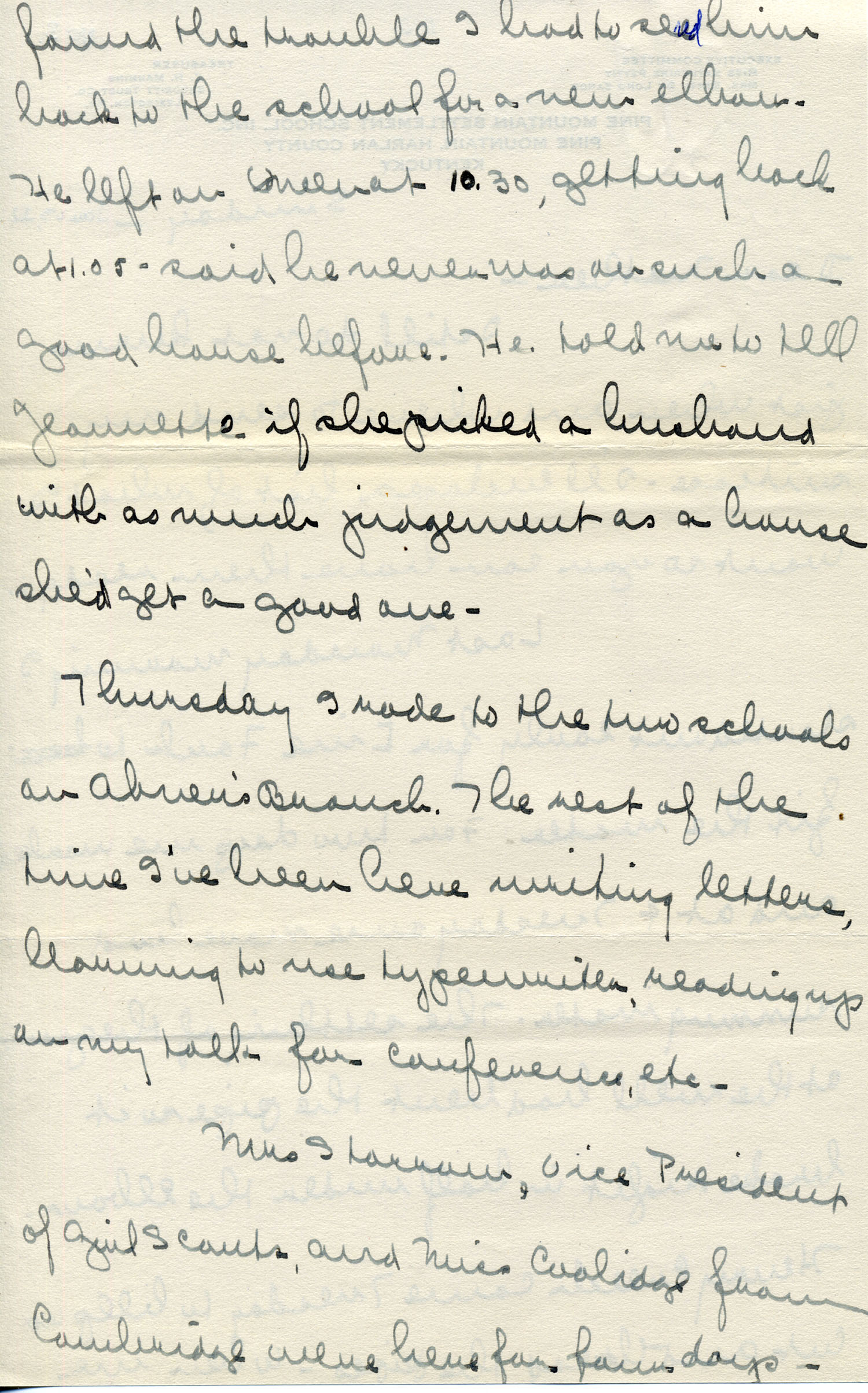 Last Monday morning I started out early for Line Fork to fix the water. For two days we worked and at 4 Tuesday once more had running water. The settling of the ground at the well had bent the pipe so it broke right in half under the elbow. Henry Creech came Tuesday to help us cut and thread the pipes. When we found the trouble I had to send him back to the school for a new elbow. He left on Queen at 10:30, getting back at 1:05 – said he never was on such a good horse before. He told me to tell Jeannette if she picked a husband with as much judgment as a horse she’d get a good one.