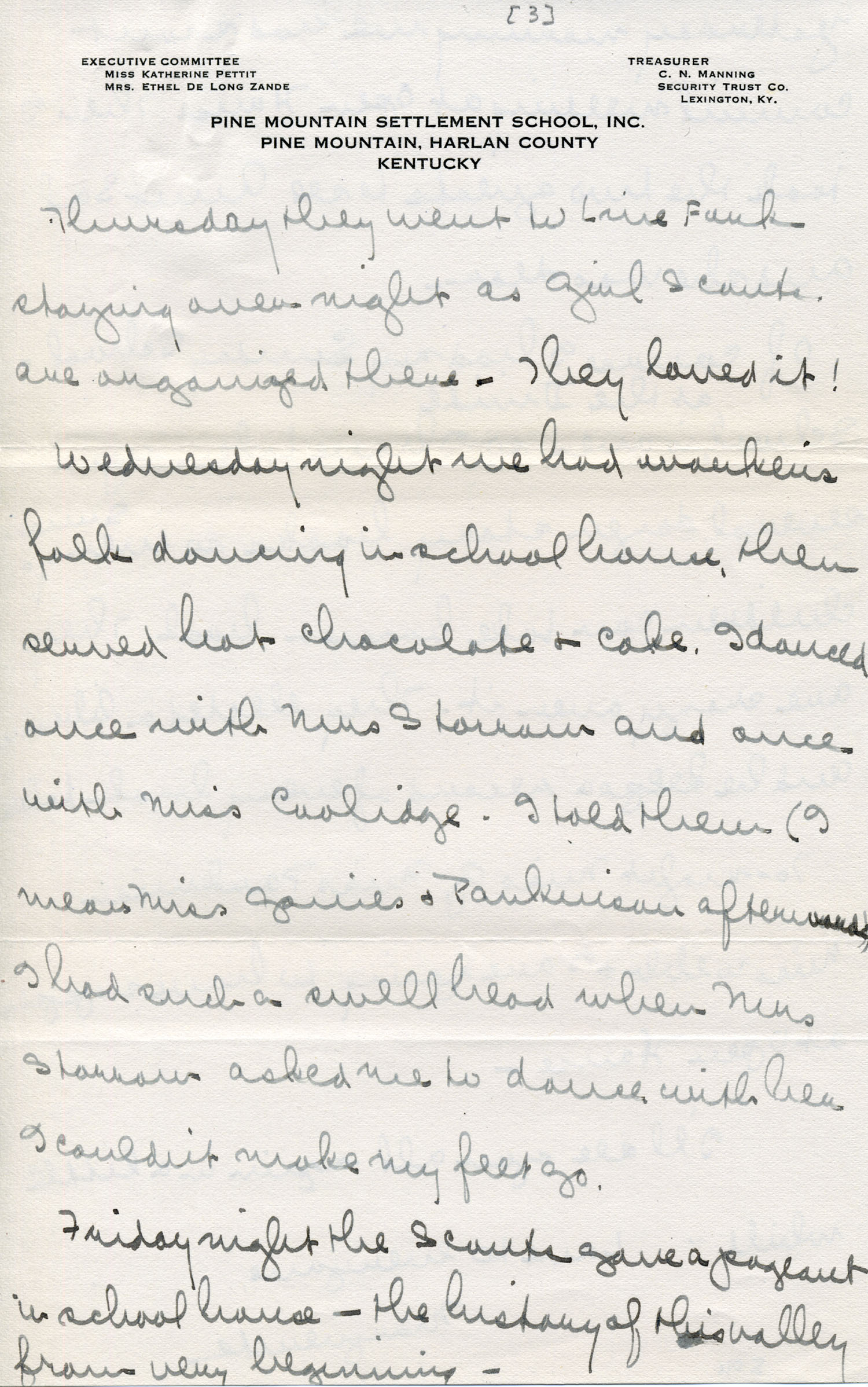 Wednesday night we had workers folk dancing in school house, then served hot chocolate and cake. I danced once with Mrs. Sharrow and once with Miss Coolidge. I told them (I mean Miss Gaines and Parkinson afterwards) I had such a swell[ed] head when Mrs. Sharrow asked me to dance with her I couldn’t make my feet go.