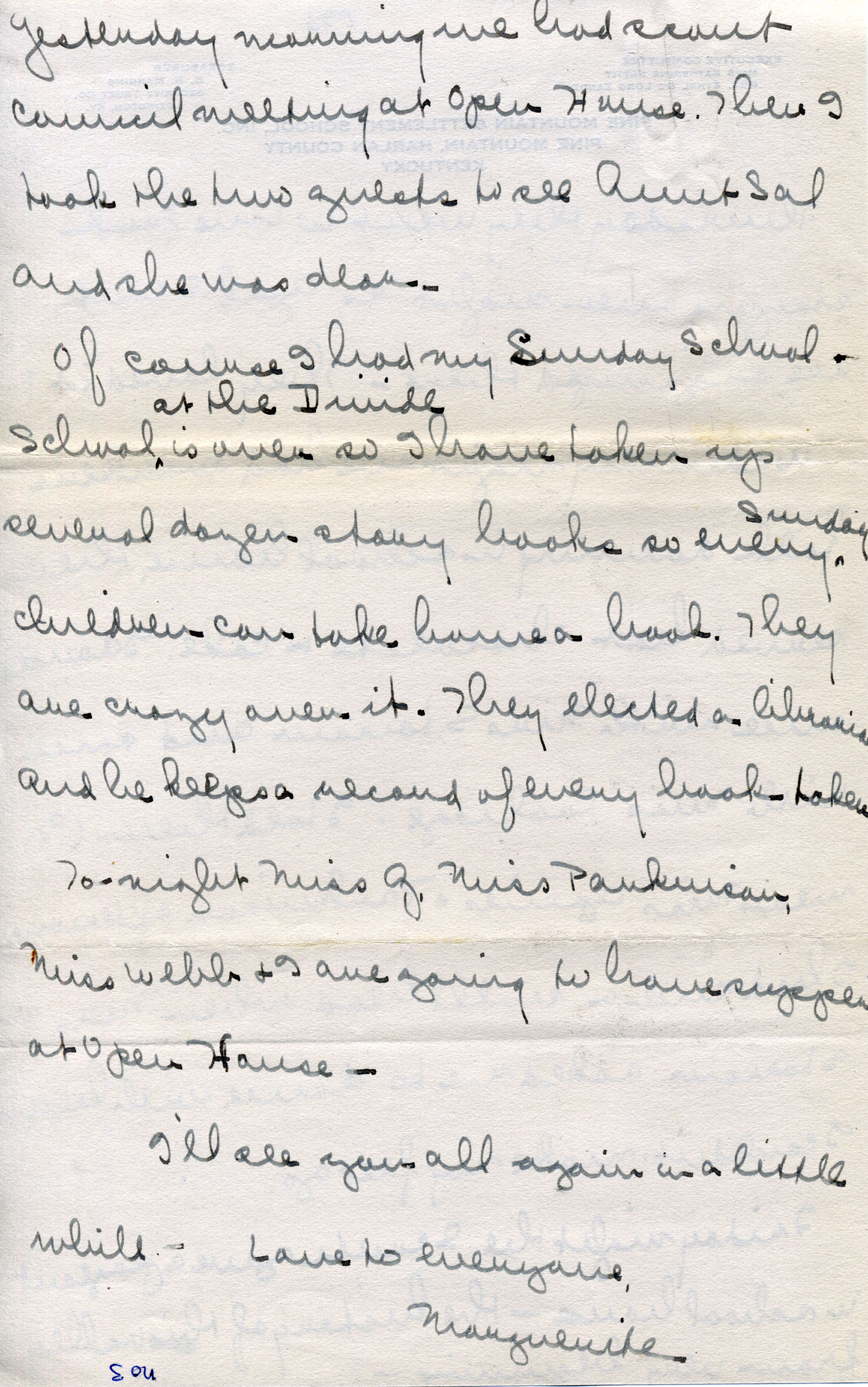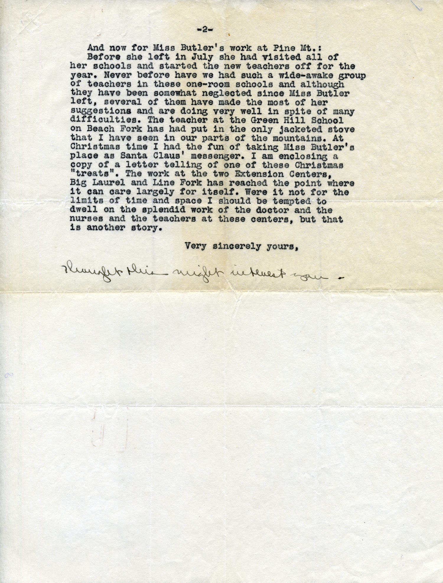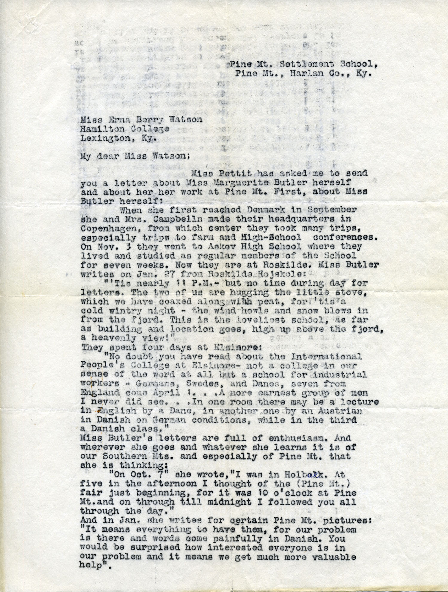 7.    1922 LETTER 7 – [no date] – typewritten letter to Miss Erna Berry Watson, Hamilton College, Lexington, Ky. from [?] – “My dear Miss Watson: Miss Pettit has asked me to send you a letter about Miss Marguerite Butler herself and about her work at Pine Mt. First, about Miss Butler herself:….” HAND-WRITTEN NOTATION at end of letter: “Thought this might interest you.” [images 027-028]