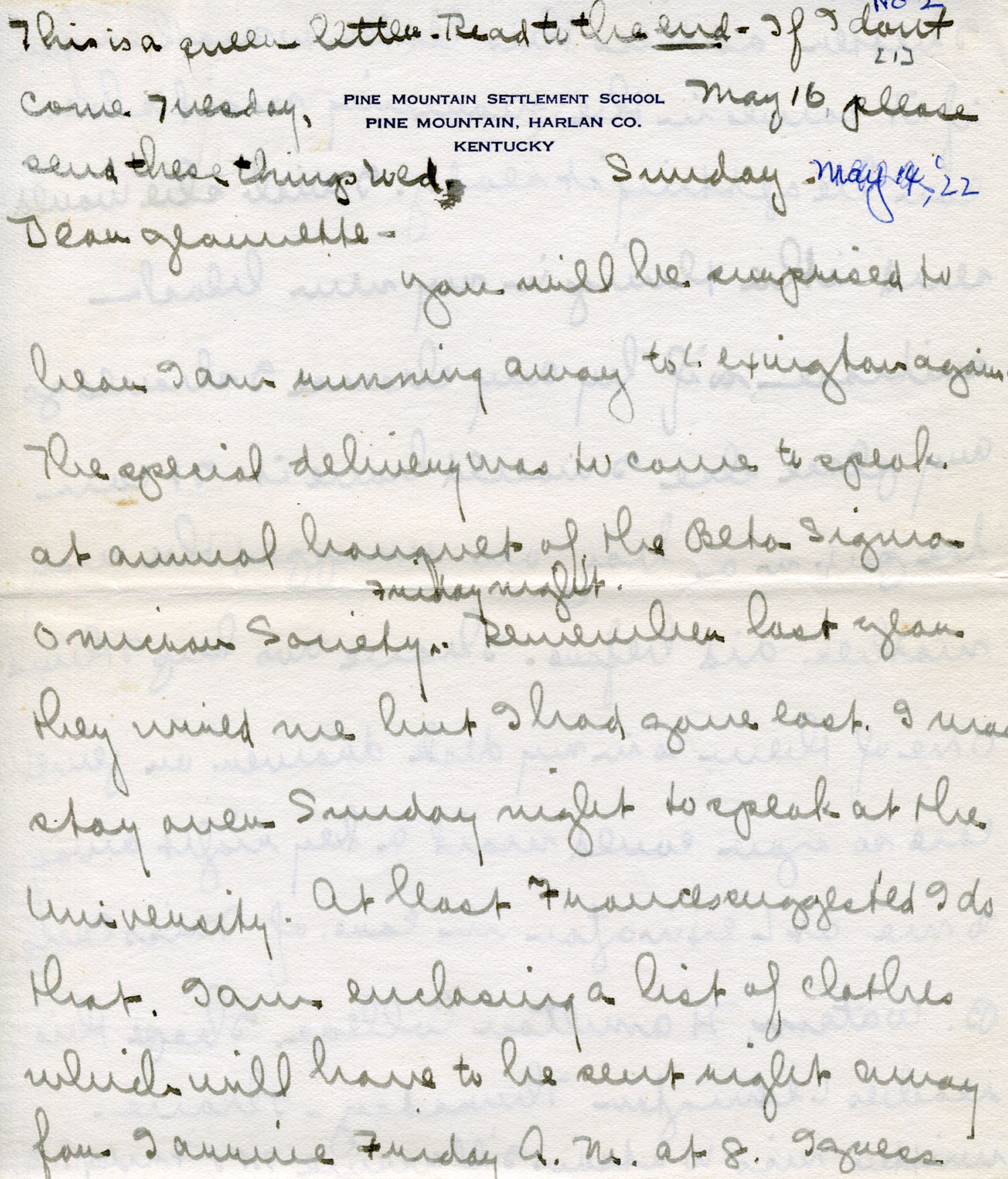 5.    1922 LETTER 5 – Sunday, May 16 (14?), 1922 – (“This is a queer letter. Read to the end. If I don’t come Tuesday, please send these things Wed.”) “Dear Jeannette — You will be surprised to hear I am running away to Lexington again…” [images 019-024]