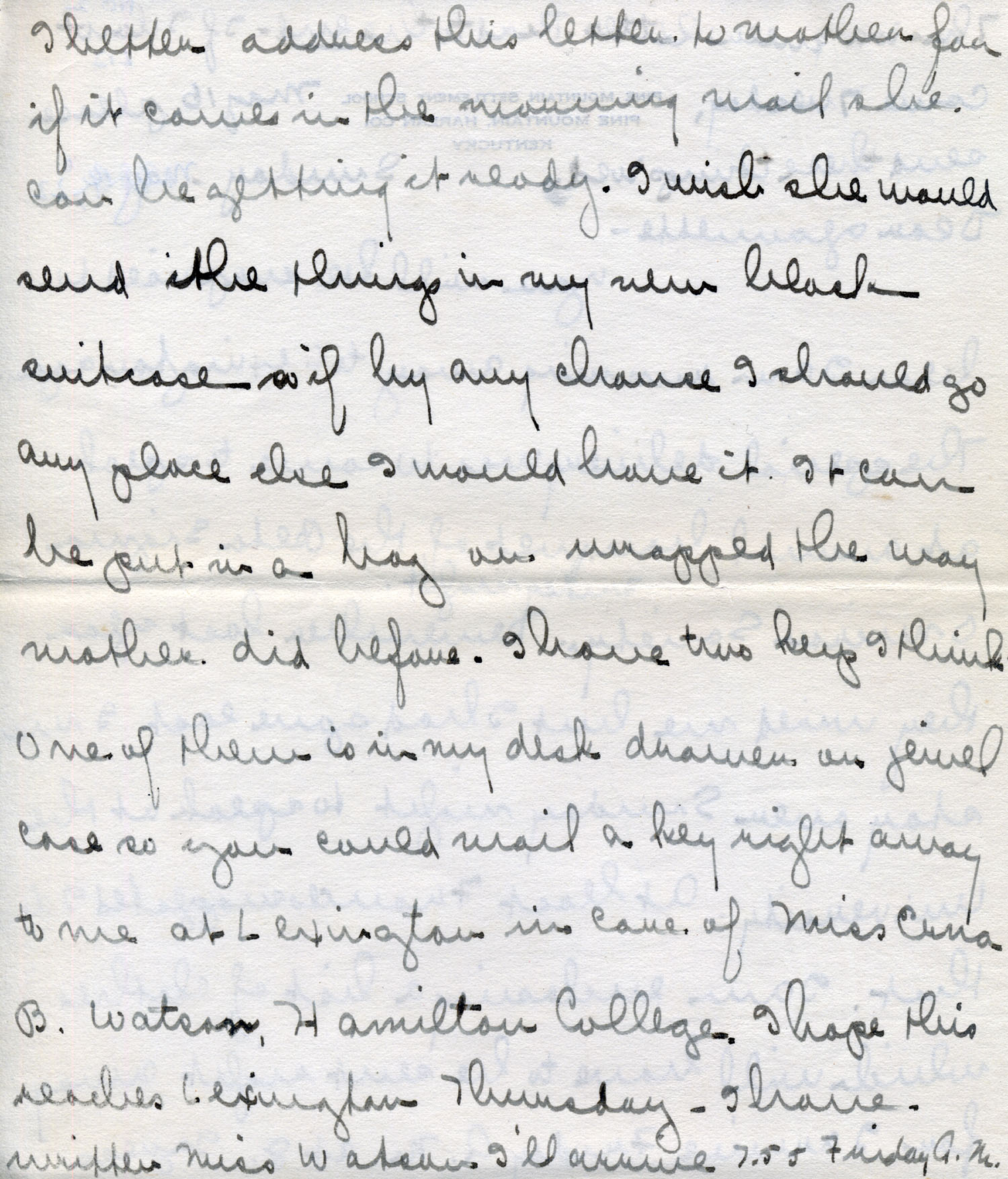 I am enclosing a list of clothes which will have to be sent right away for I arrive Friday a.m. at 8. I guess I better address this letter to Mother for if it comes in the morning mail she can be getting it ready. I wish she would send the things in my new black suitcase so if by any chance I should go anyplace else I would have it. It can be put in a bag or wrapped the way Mother did before. I have two keys I think. One of them is in my desk drawer or jewel case so you could mail a key right away to me at Lexington in care of Miss Erna B. Watson, Hamilton College. I hope this reaches Lexington Thursday. I have written Miss Watson I’ll arrive 7:55 Friday a.m. You never know what is going to happen, do you?