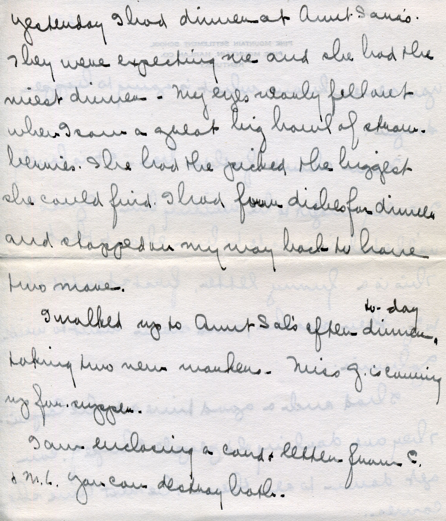 I walked up to Aunt Sal’s after dinner today, taking two new workers. Miss G[aines]a is coming up for supper.