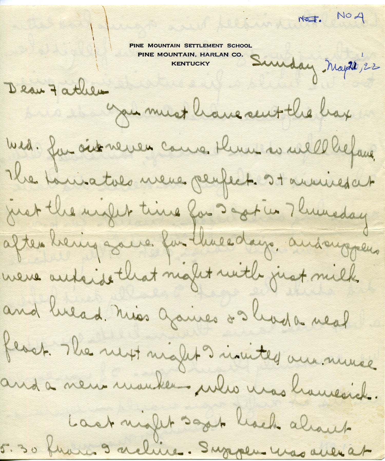 Dear Father — You must have sent the box Wednesday for it never came thru so well before. The tomatoes were perfect. It arrived at just the right time for I got in Thursday after being gone for three days, and suppers were outside that night with just milk and bread. Miss Gaines and I had a real feast. The next night I invited our nurse and a new worker who was homesick.