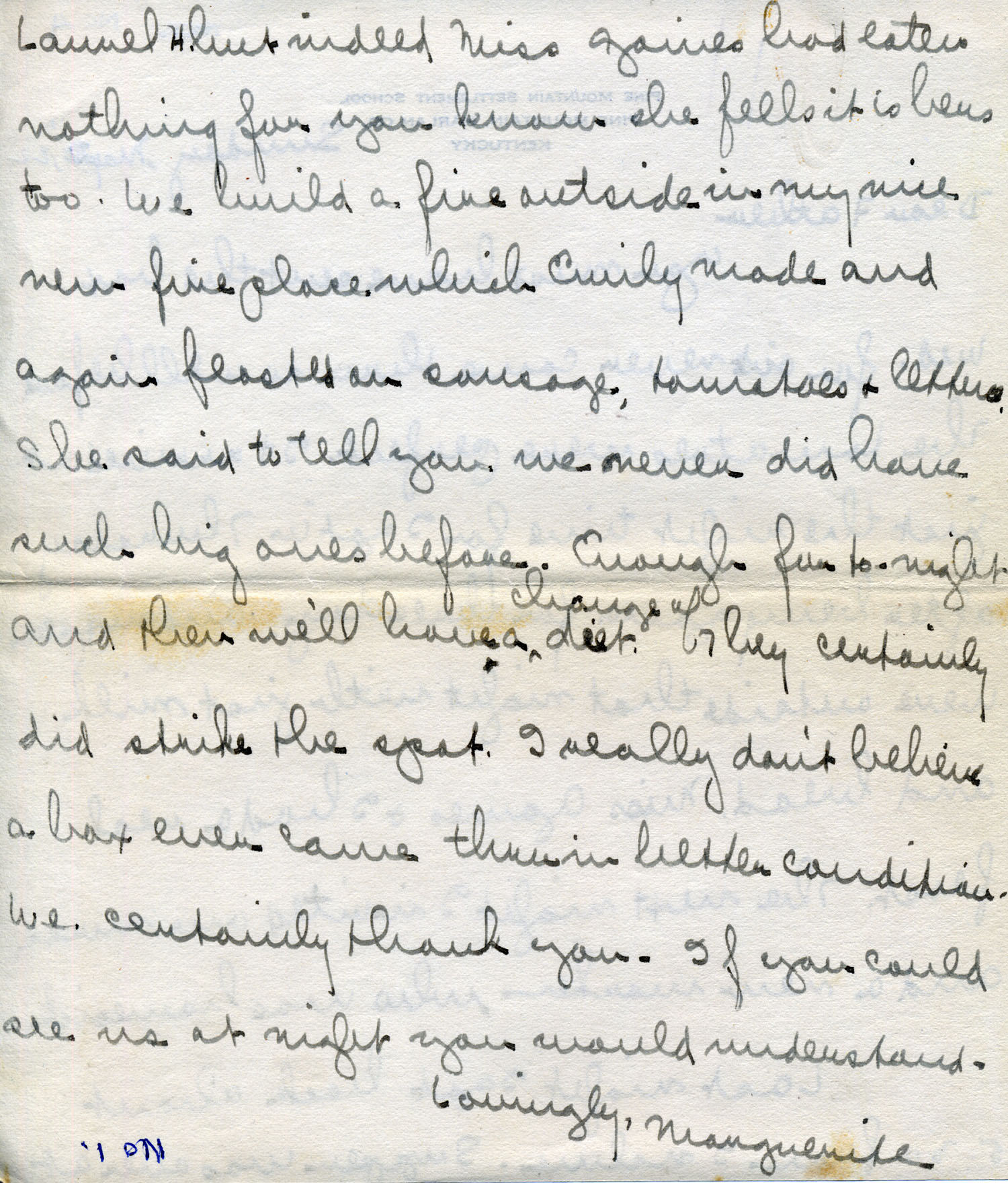 Last night I got back about 5:30 from Incline. Supper was over at Laurel H[ouse] but indeed Miss Gaines had eaten nothing for you know she feels it is hers too. We built a fire in my nice new fireplace which Emily made and again feasted on sausage, tomatoes and lettuce. She said Emily made and again feasted on sausage, tomatoes and lettuce. She said to tell you that we never did have such before.  Enough for tonight and then we’ll have a change of diet. They ce strike the spot. I really don’t believe a box ever came thru in better condition certainly thank you. If you could see us at night you would understand.