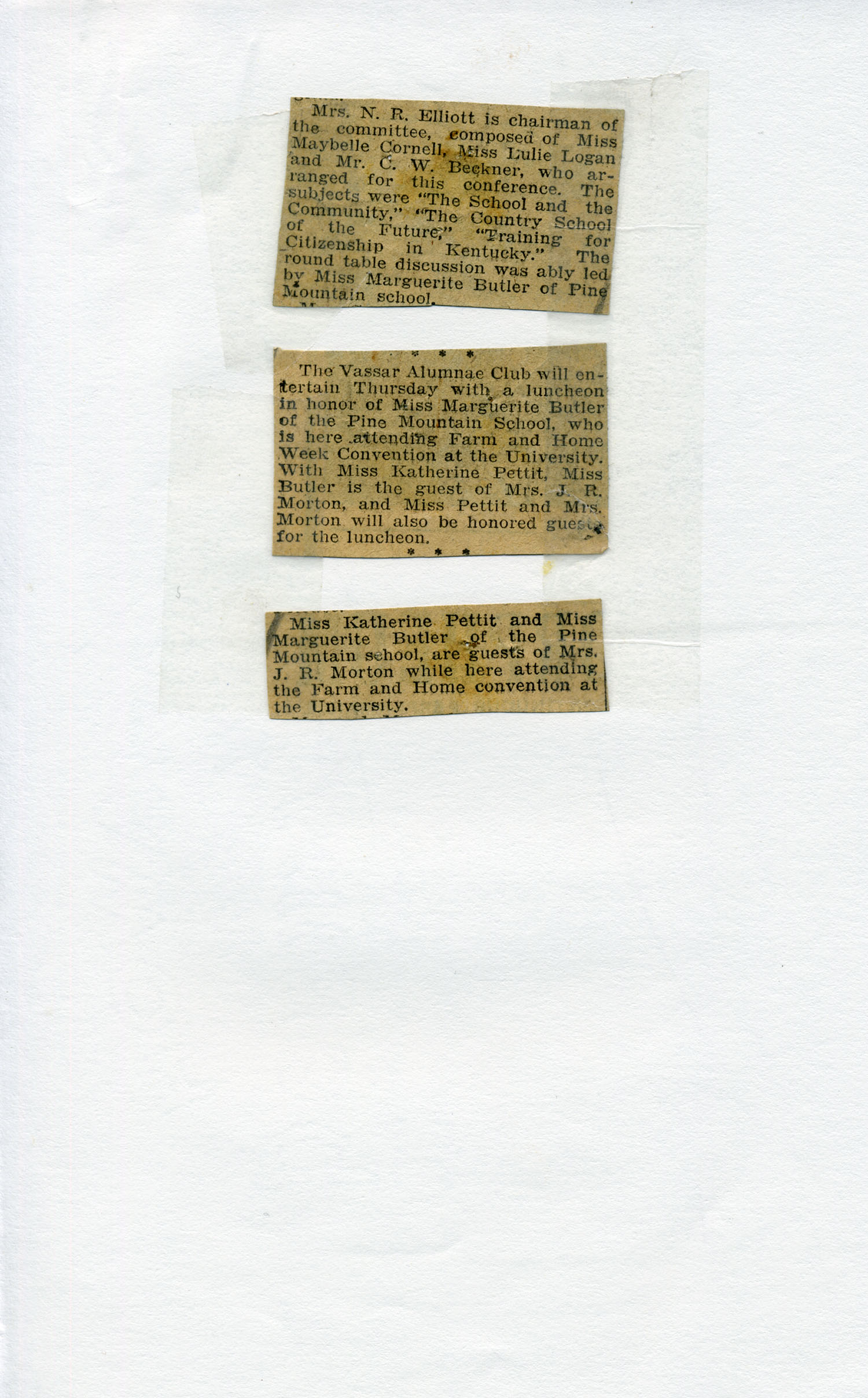 8.    Newspaper clippings – [no dates] – “Mrs. N.R. Elliott is chairman of the committee, composed of….The round table discussion was ably led by Miss Marguerite Butler of Pine Mountain school.”