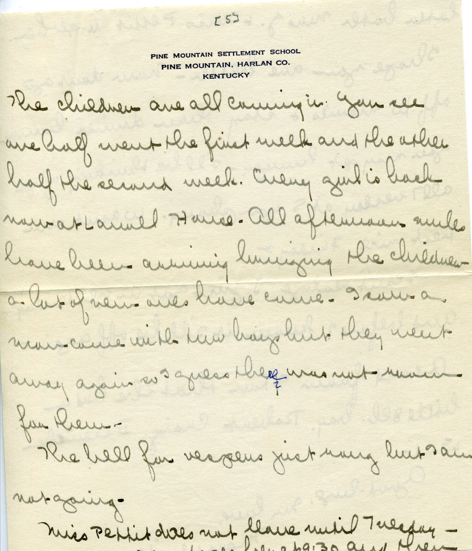 The children are all coming in. You see, one half went the first week and the other half the second week. Every girl is back now at Laurel House. All afternoon mules have been arriving bringing the children — a lot of new ones have come. I saw a man come with two boys but they went away again so I guess there was not room for them.