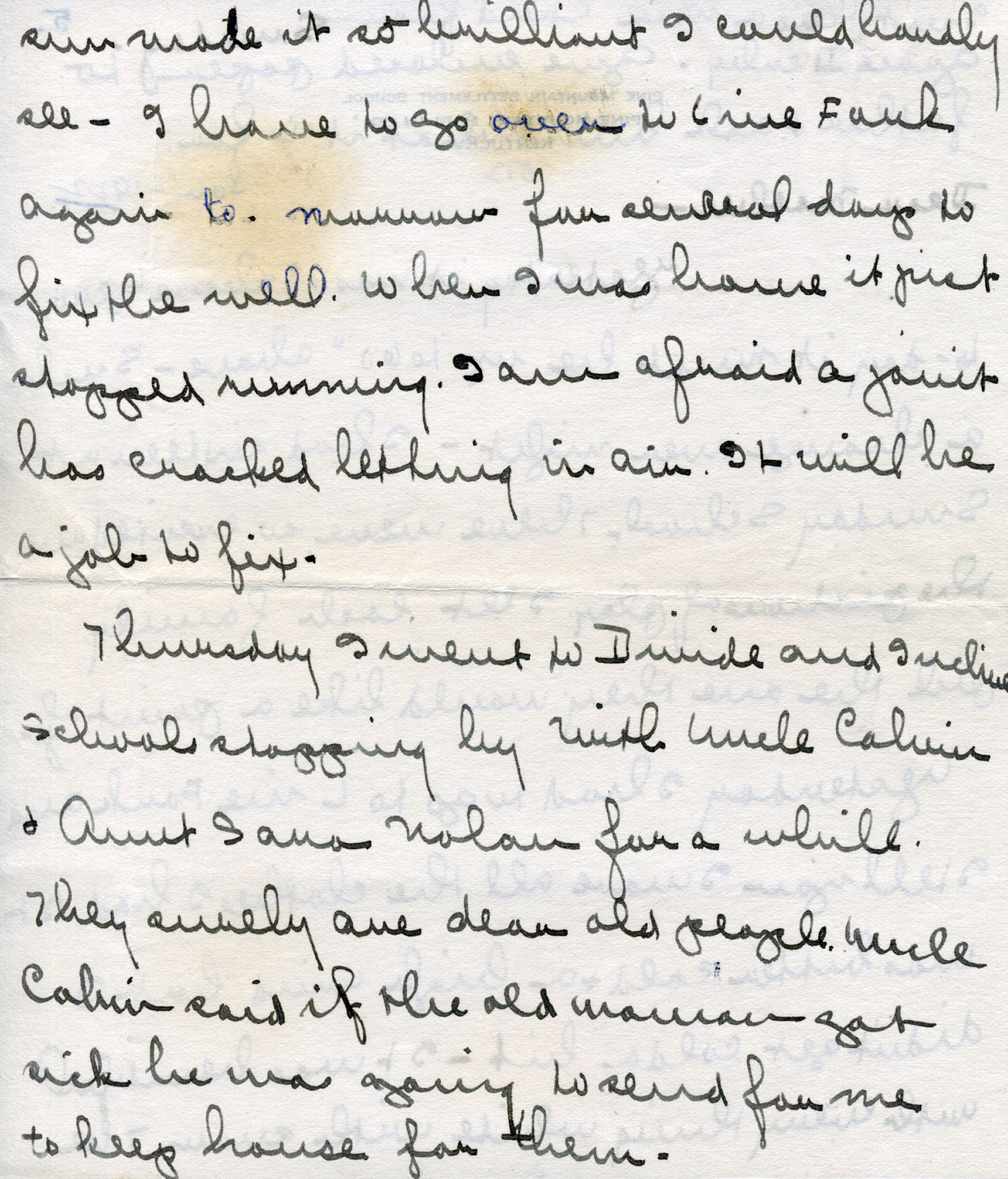 Thursday I went to Divide and Incline schools, stopping by with Uncle Calvin and Aunt Sara Nolan for a while. They surely are dear old people. Uncle Calvin said if the old woman got sick he was going to send for me to keep house for them.