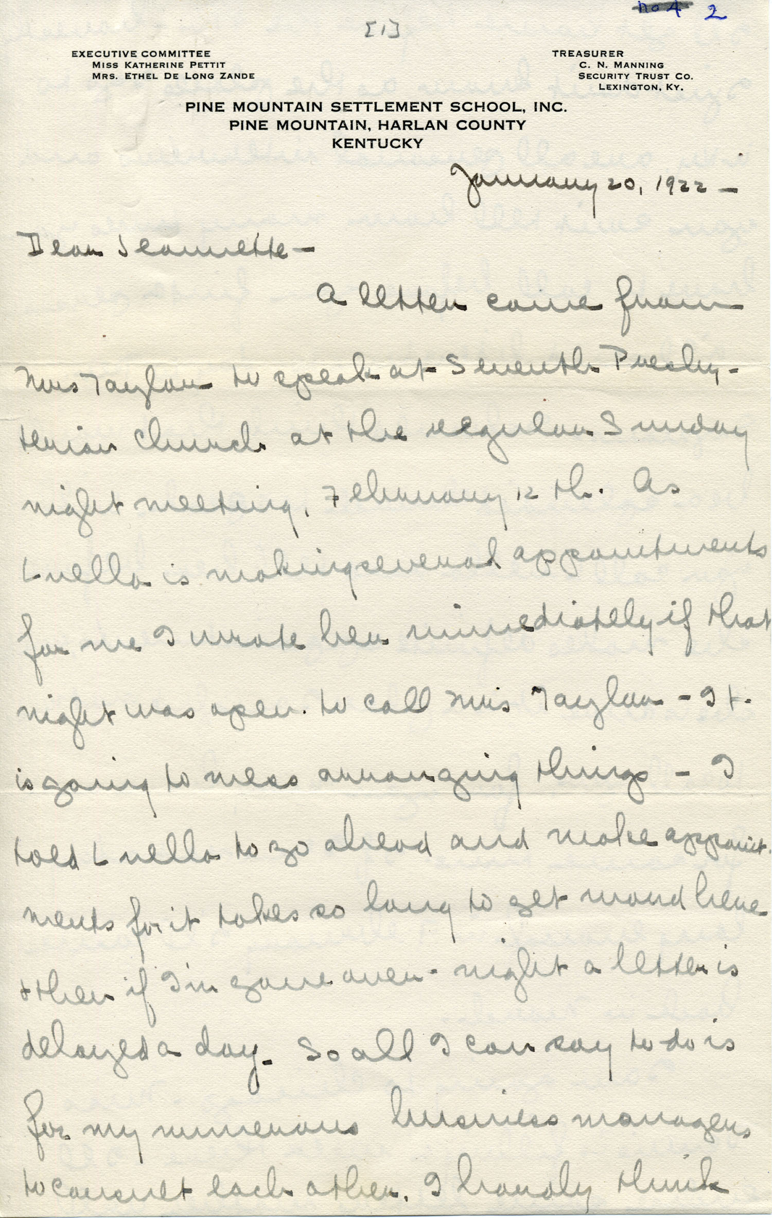 Dear Jeannette — A letter came from Mrs. Taylor to speak at Seventh Presbyterian Church at the regular Sunday night meeting, February 12th. As Luella is making several appointments for me I wrote her immediately if that night was open to call Mrs. Taylor. It is going to mess arranging things. I told Luella to go ahead and make appointments for it takes so long to get word here and then if I’m gone over-night a letter is delayed a day. So all I can say to do is for my numerous business managers to consult each other. I hardly think I’ll get home before the 9th. Honestly, I just don’t know as the places I go to in Ky. are all personal interviews and you can’t tell how many times you have to call before you find a person in.