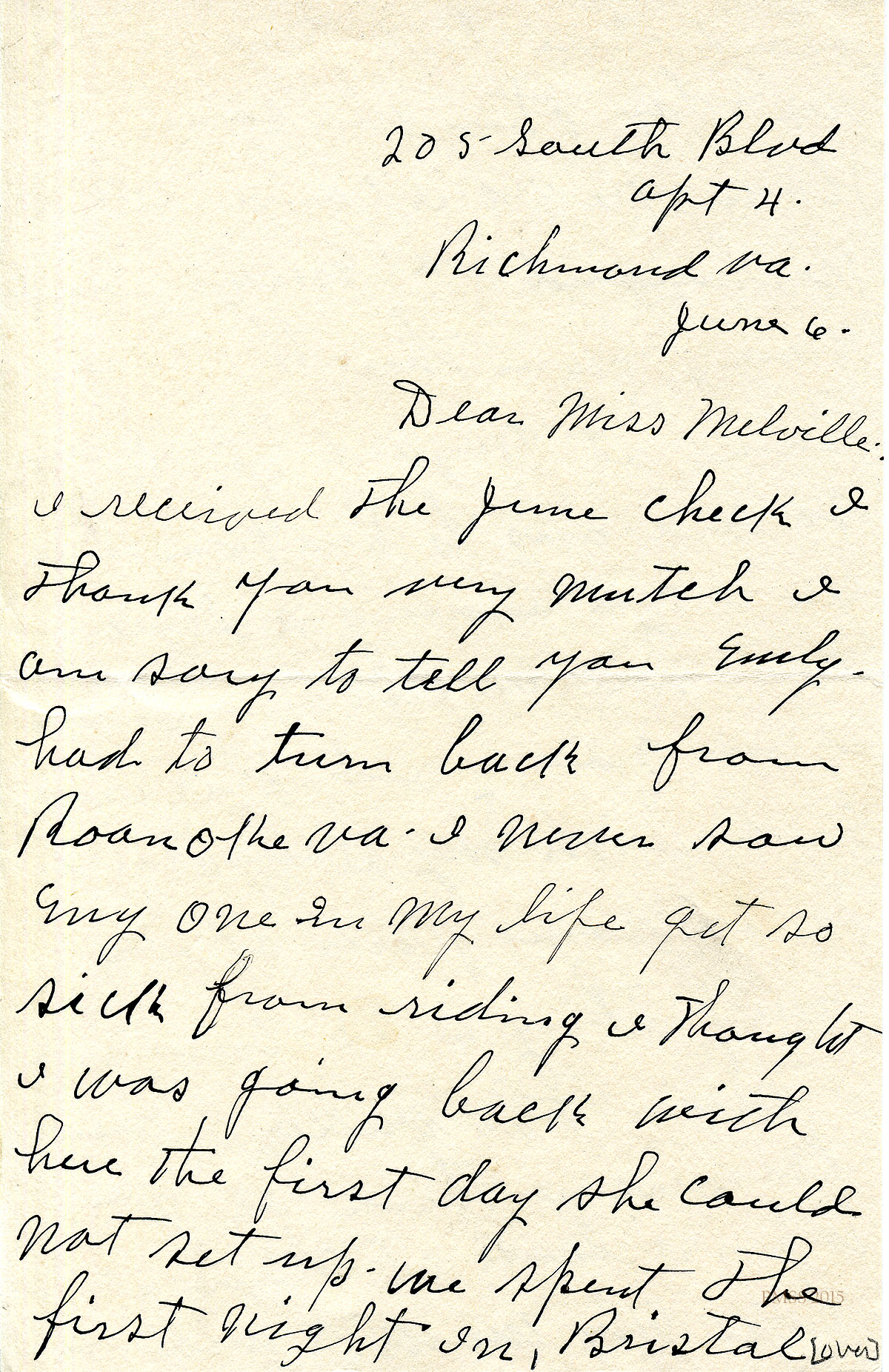 I received the June check. I thank you very much. I am sorry to tell you Emily had to turn back from Roanoke, Va. I never saw anyone in my life get so sick from riding. I thought I was going back with her. The first day she could not sit up. We spent the first night in Bristol.