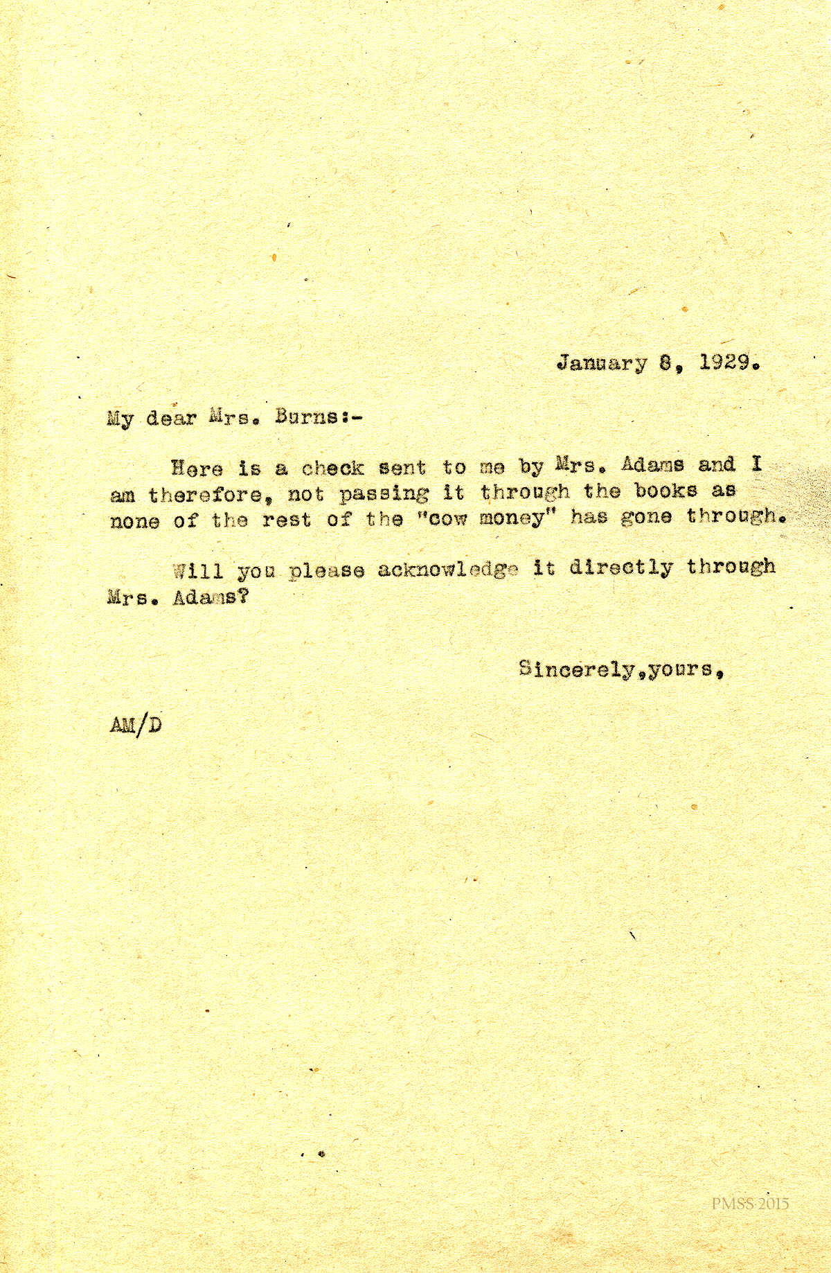 Here is a check sent to me by Mrs. Adams and I am, therefore, not passing it through the books as none of the rest of the “cow money” has gone through.