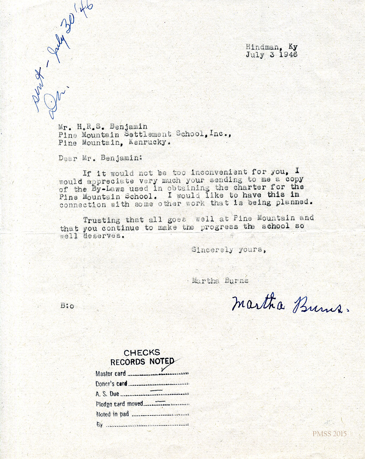 How much I would like to drive in to Pine Mt. Settlement to visit you all. I have been so busy this year. Haven’t had a vacation this year. I hope everything is going fine with your work. I received the By-Laws. I want to thank you so much for lending them to me. I never had such time to get them ready to send back. I will send them by insured mail. Thank you so much.