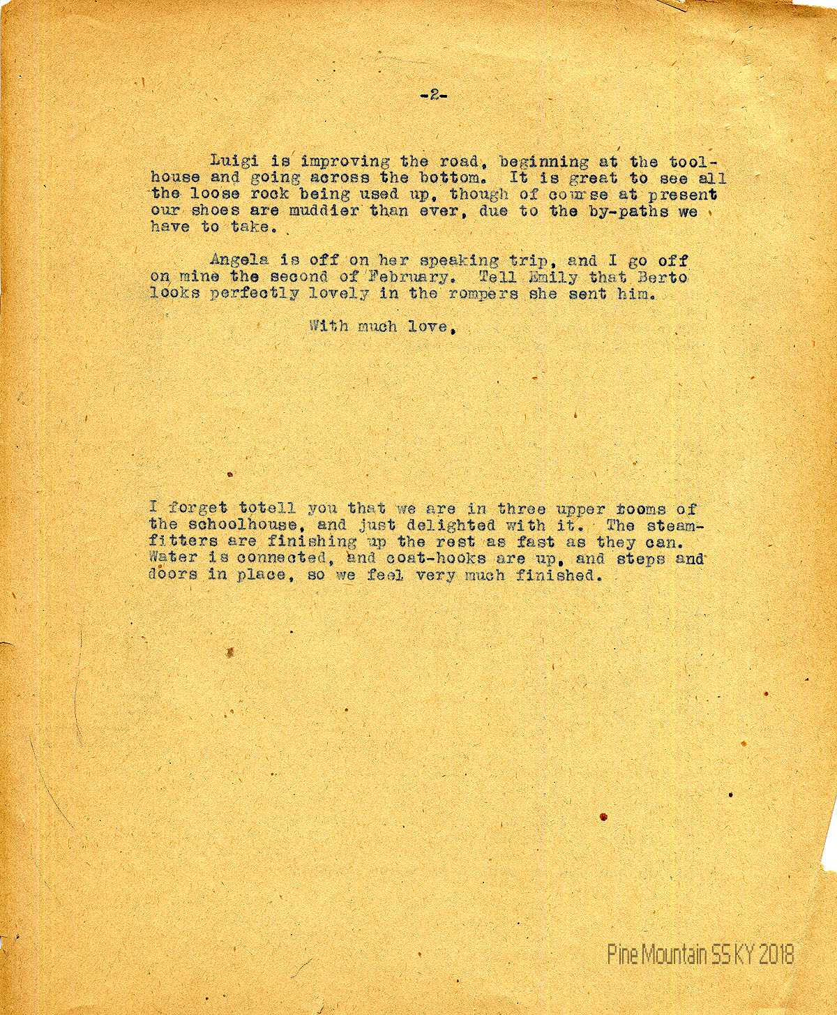 TAGS: Mary Rockwell Hook Correspondence 1920, Mary Rockwell, architecture, architects, autobiography, Ethel de Long Zande, Luigi Zande, Berto Zande, fundraising, donations, Line Fork Settlement, Bertha Rockwell, Katherine Pettit, Marguerite Butler, Angela Melville, PMSS teaching methods, Medical Settlement at Big Laurel