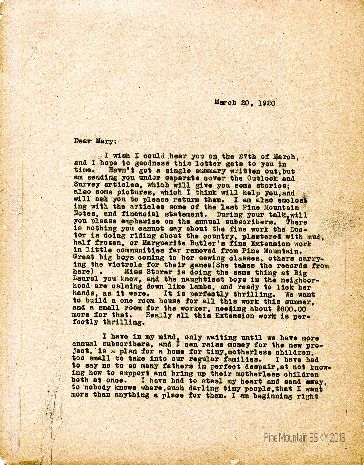 004-004a March 20, 1920. Two-page letter to Mary from EZ (Zande), who is sending Outlook and Survey articles and some photos to help with her talk; enclosing a recent PMSS Notes article and financial statement. Zande provides ideas for her talk: annual subscribers, the Doctor, Marguerite Butler’s Extension work (at Line Fork Settlement), Miss Storer at Big Laurel (Medical Settlement), the need for $800 to build a one-room house for Extension workers. Zande hopes to raise money for a new project: “a plan for a home for tiny, motherless children, too small to take into our regular families.” Tells about turning away fathers who bring motherless children to the School and wonders how to get the right staff and cows for the “babes.” Mentions Miss (Celia) Cathcart, who is replacing Miss (Evelyn) Wells. Berto had his first birthday this week.