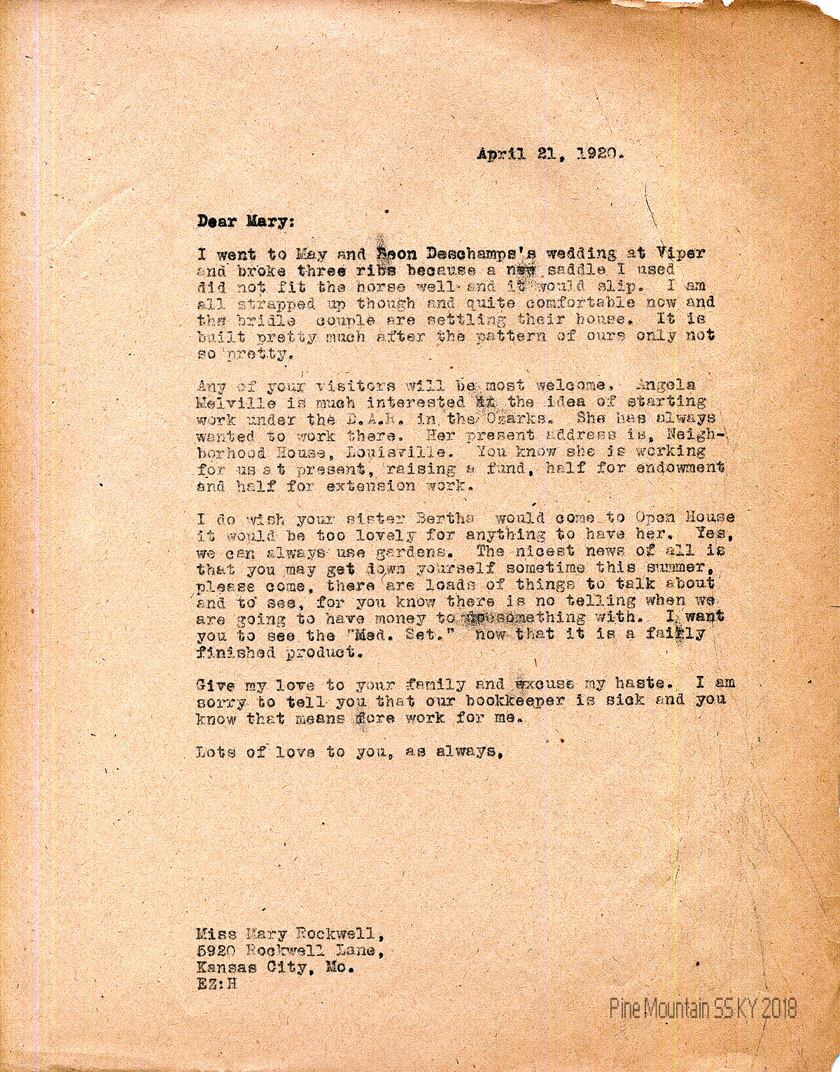 006 April 21, 1920. To Mary from EZ (Zande). “I went to May and Leon Deschamps’s wedding at Viper and broke three ribs because [of] a new saddle….” Tells of Angela Melville’s interest in starting work under the D.A.R. in the Ozarks; Angela is currently at Neighborhood House in Louisville and doing fundraising for PMSS’s extension work and endowment. Hopes Mary’s sister Bertha will visit and stay at Open House; encourages Mary to visit in the summer. “I want you to see the ‘Med. Set’ (Medical Settlement) now that it is a fairly finished product.”