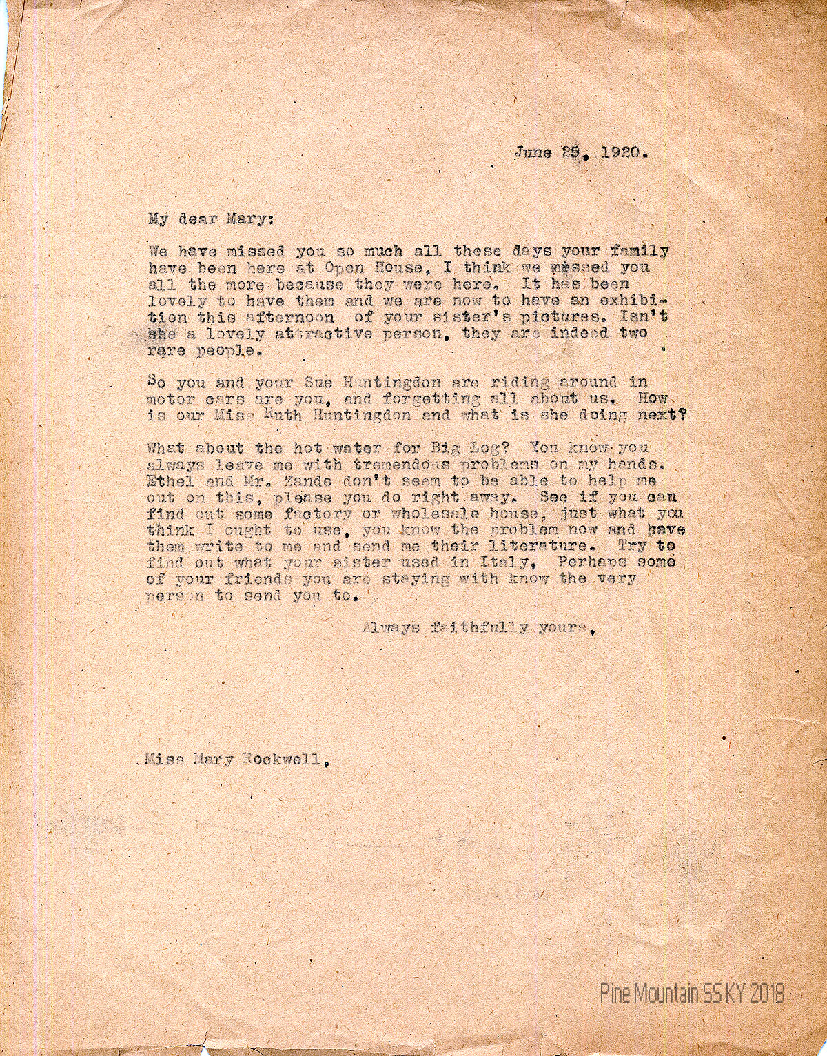 008 June 25, 1920. To “My dear Mary” (Miss Mary Rockwell) from (unsigned, possibly Katherine Pettit), who missed Mary when her family (sister Bertha and Mrs. Ostertag?) were visiting the School and staying at Open House. An exhibition is planned for Bertha’s photos. Mentions Sue Huntingdon and asks about Miss Ruth Huntington. Asks help in supplying hot water for Big Log. “Ethel and Mr. Zande don’t seem to be able to help me out on this.”